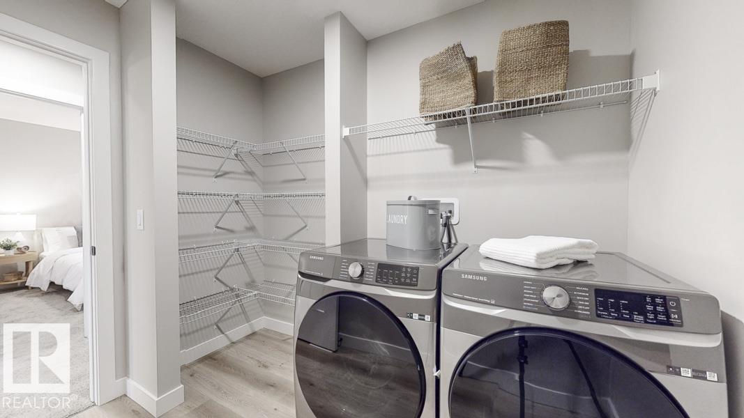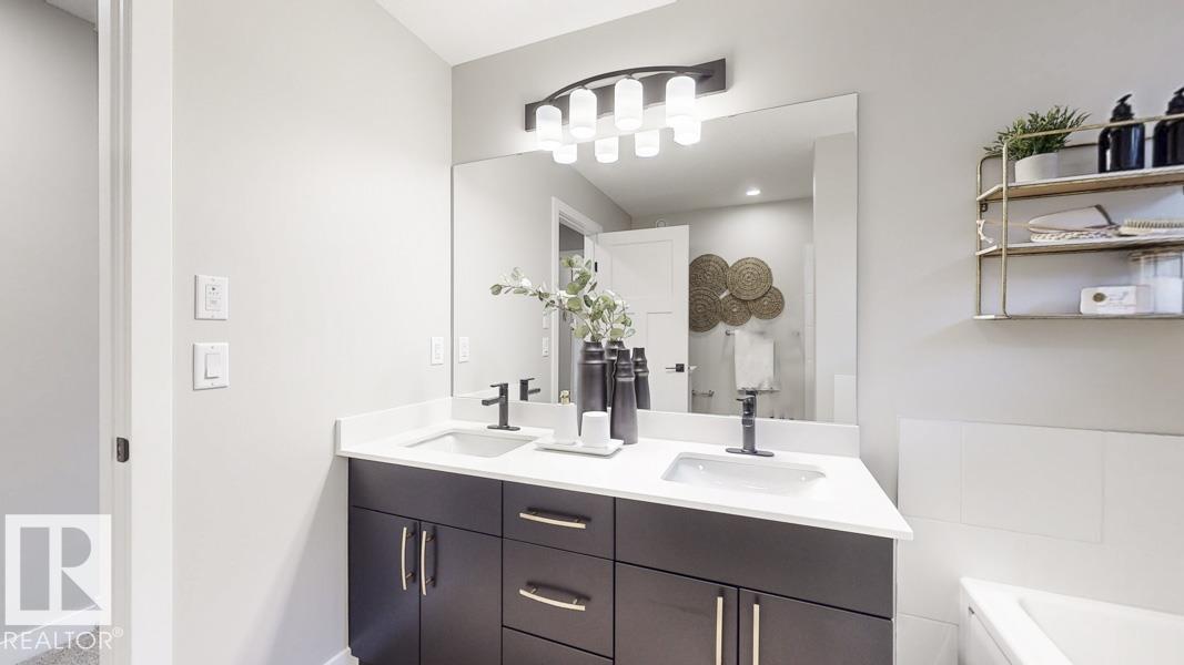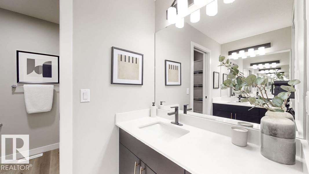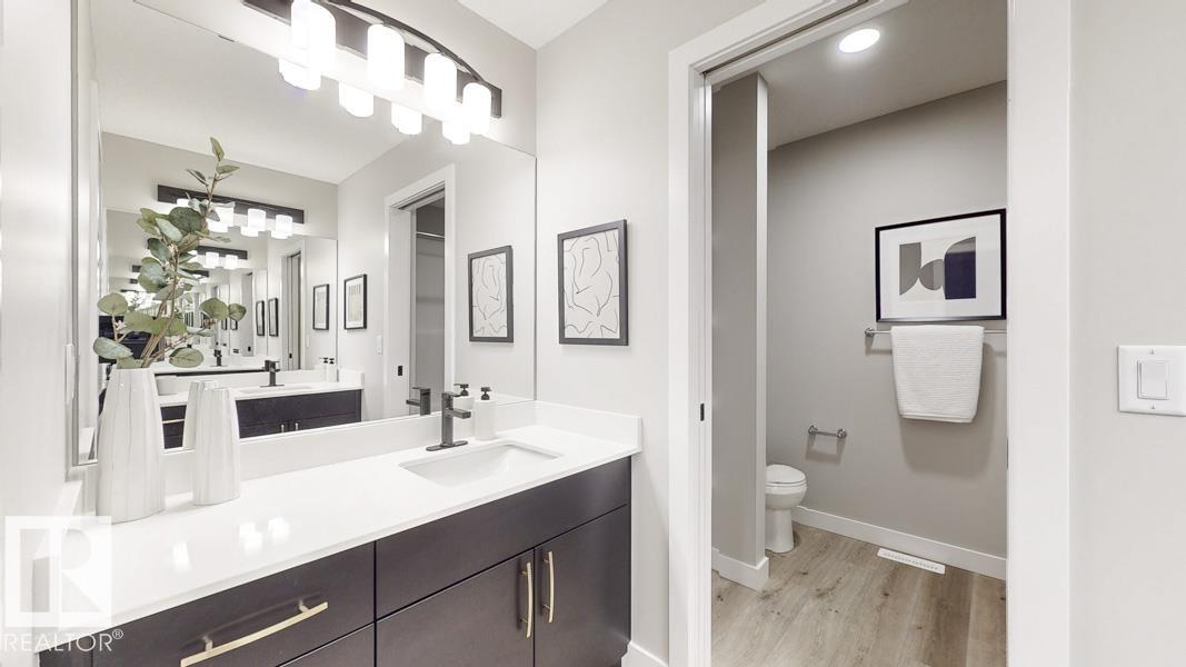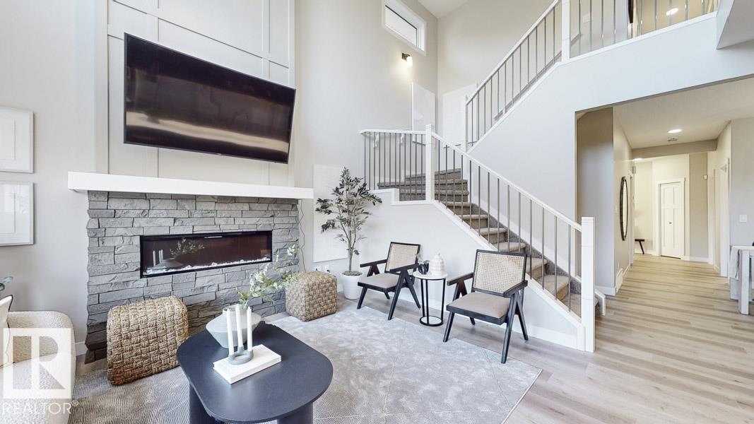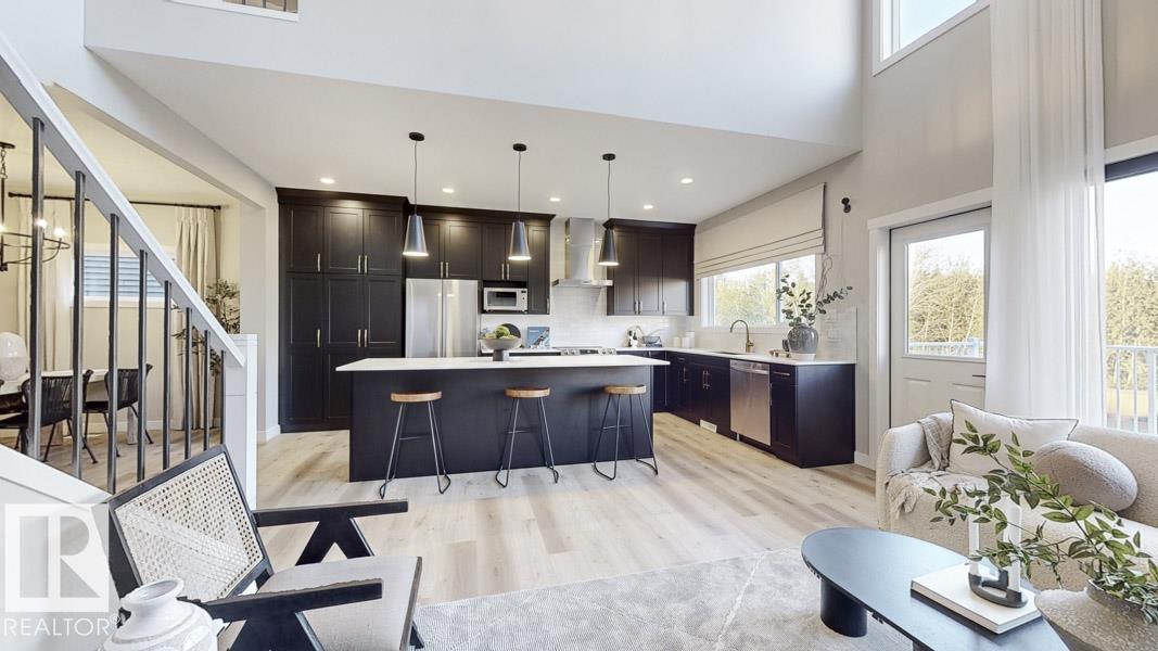 Built by Sterling Homes, this 2,211 sq ft home features a double attached garage with floor drain, 9-ft ceilings on the main and lower floors, side entrance, and luxury vinyl plank flooring on the main and upper levels. The foyer with coat closet opens to a mudroom off the garage, a full 3-pc bath with walk-in shower, and a main-floor bedroom or den--ideal for guests or a home office. A formal dining room sits separate from the open great room and kitchen. The kitchen offers quartz countertops, an island with a flush eating ledge and waterfall edge, a Silgranit sink, a built-in microwave, pendant lighting, chimney hood, full-height backsplash, soft-close cabinets with raised doors, and a pantry. The great room features a fireplace, large windows, 17-ft open-to-above ceiling, and a garden door to the deck. Upstairs includes a primary suite with a walk-in closet and a 5-pc ensuite, bonus room, a laundry with cabinets, two additional bedrooms, and a full bath. Basement rough-ins included.