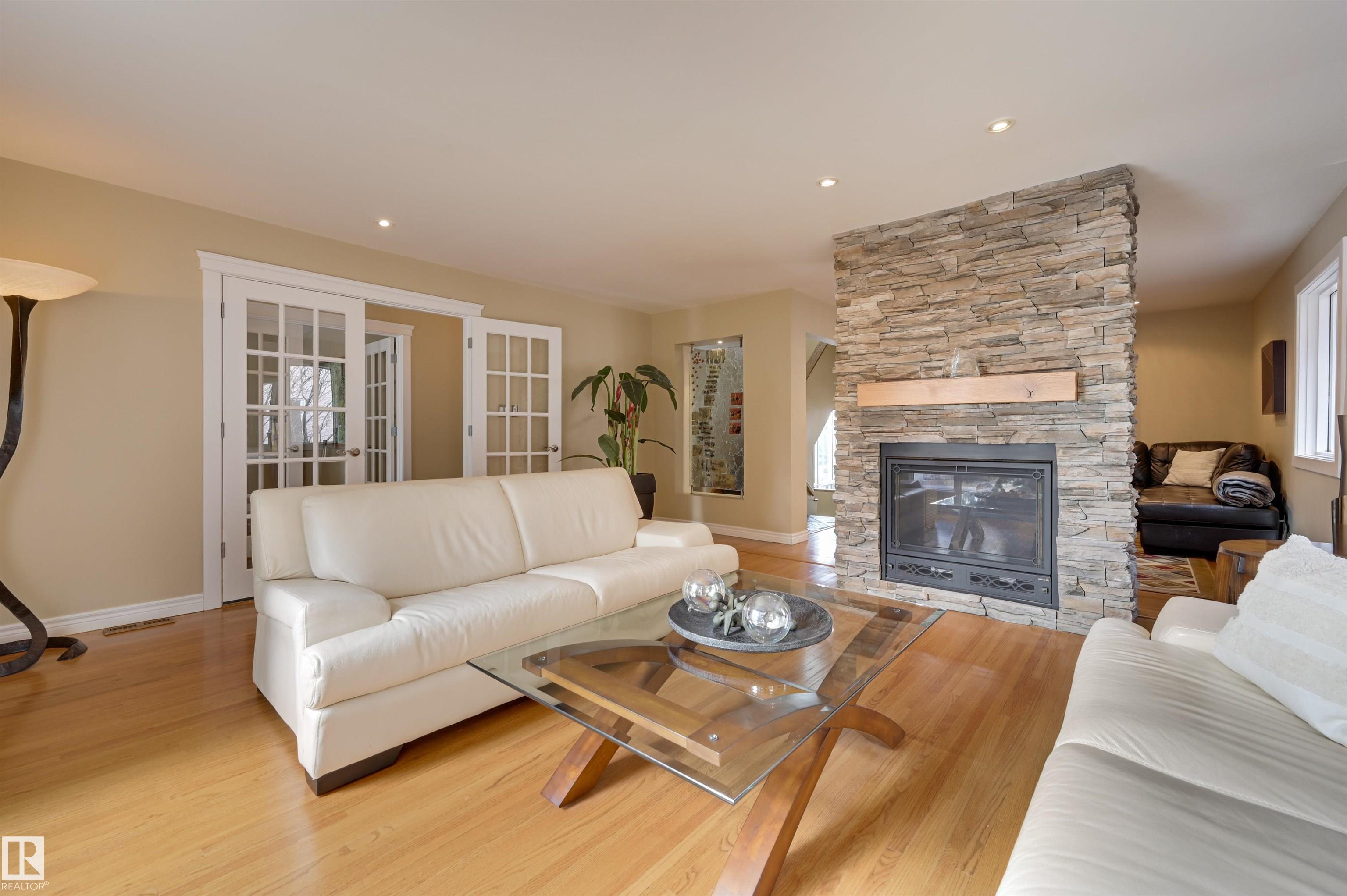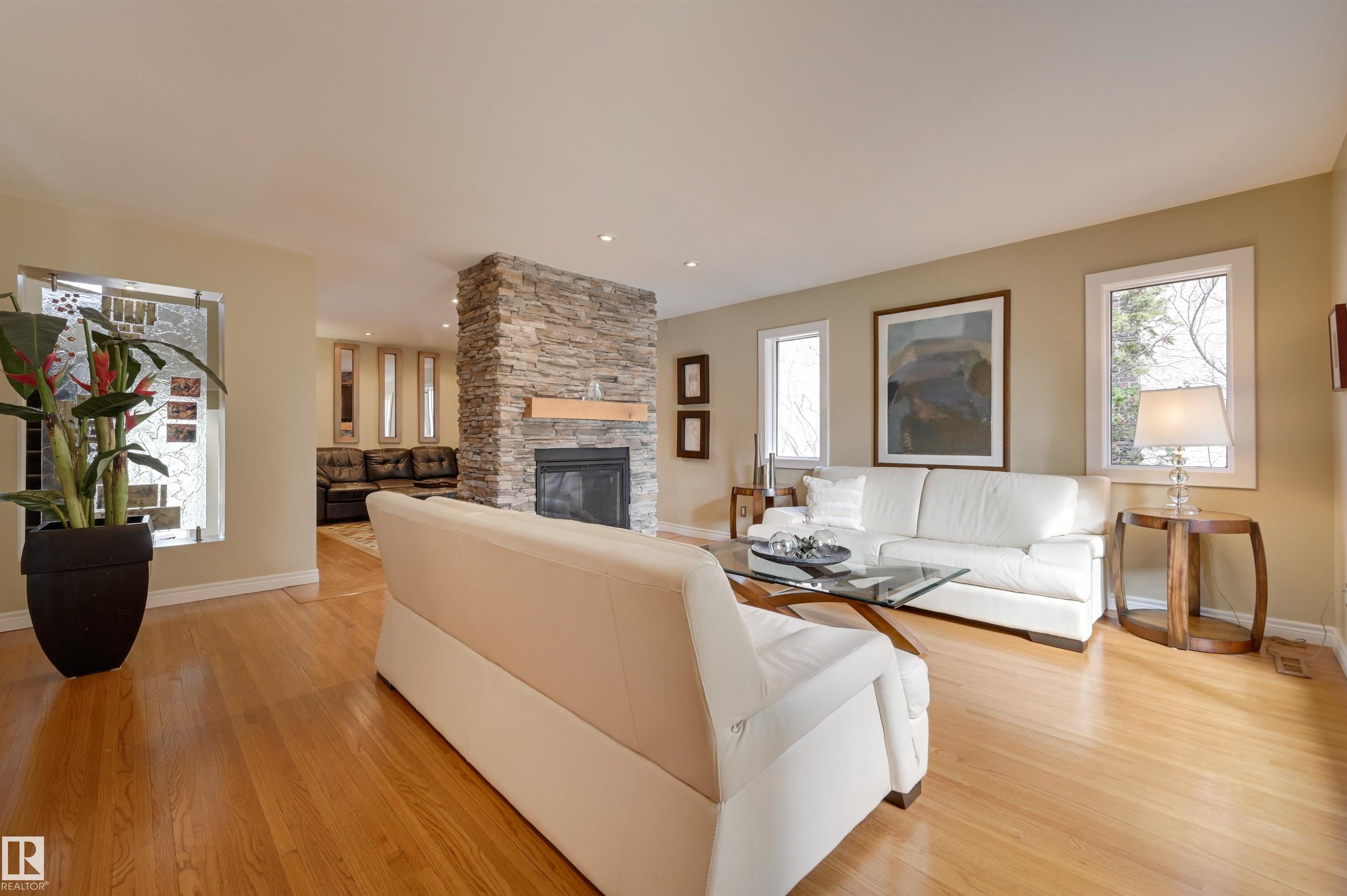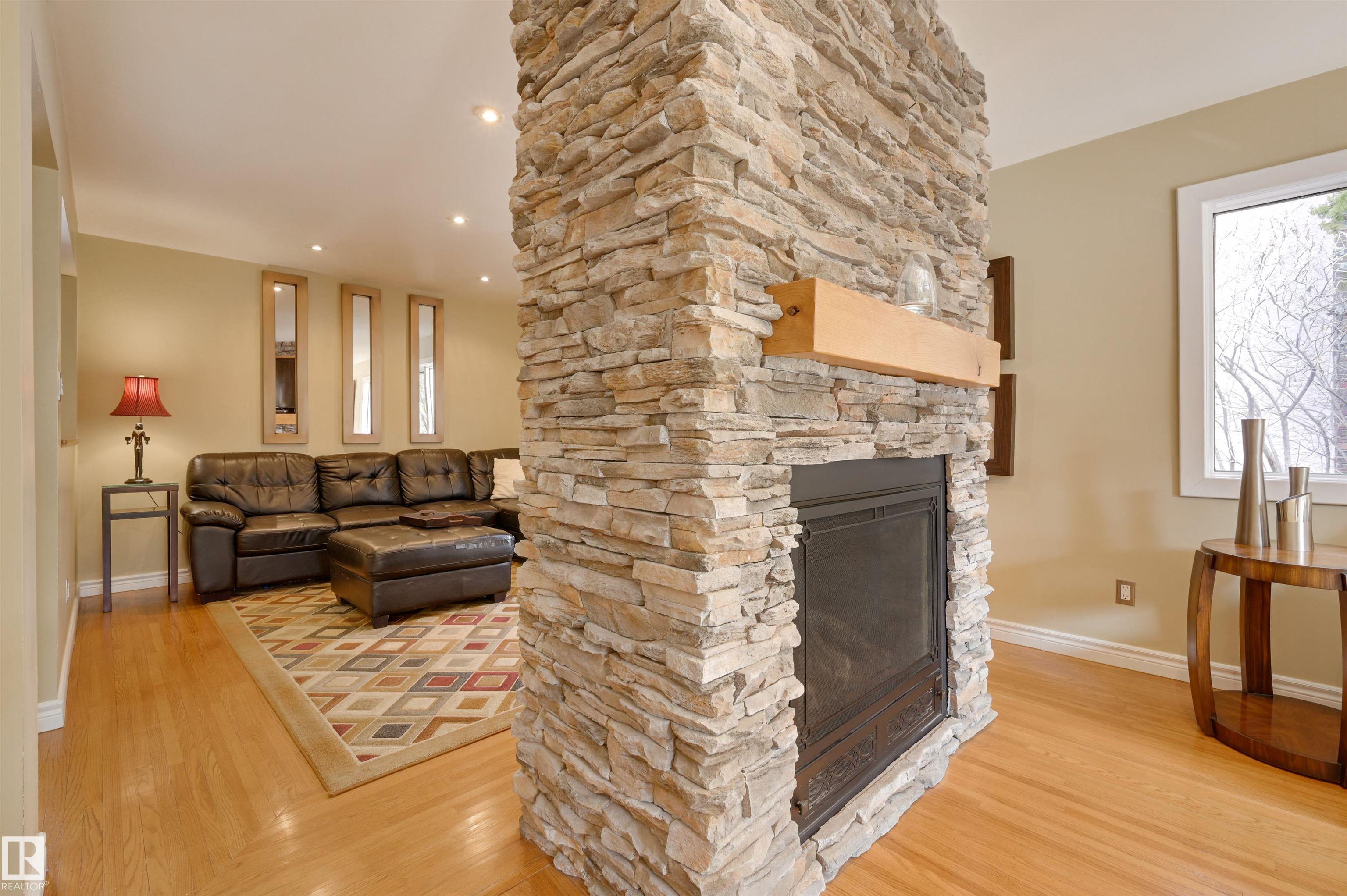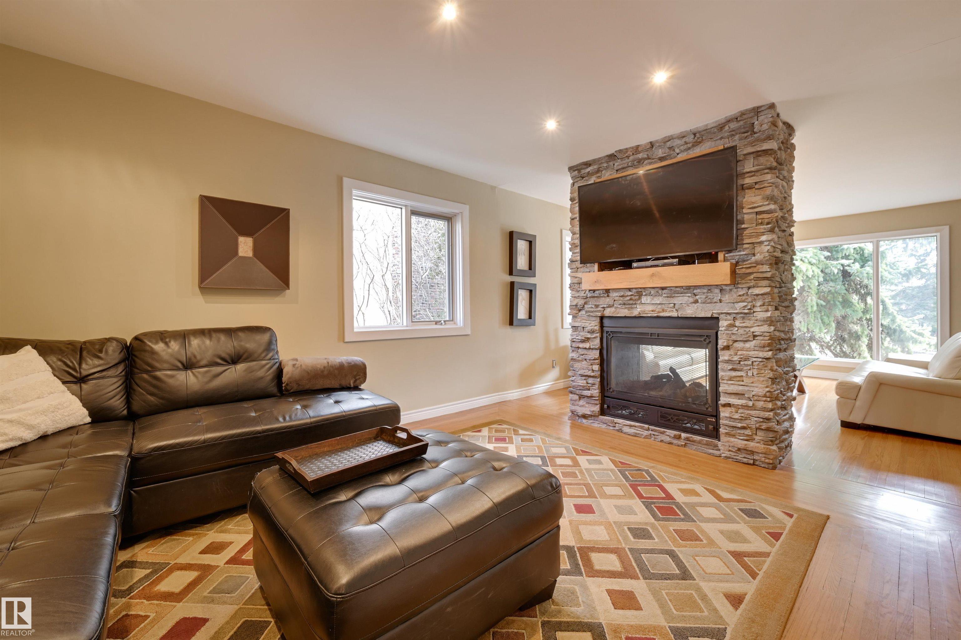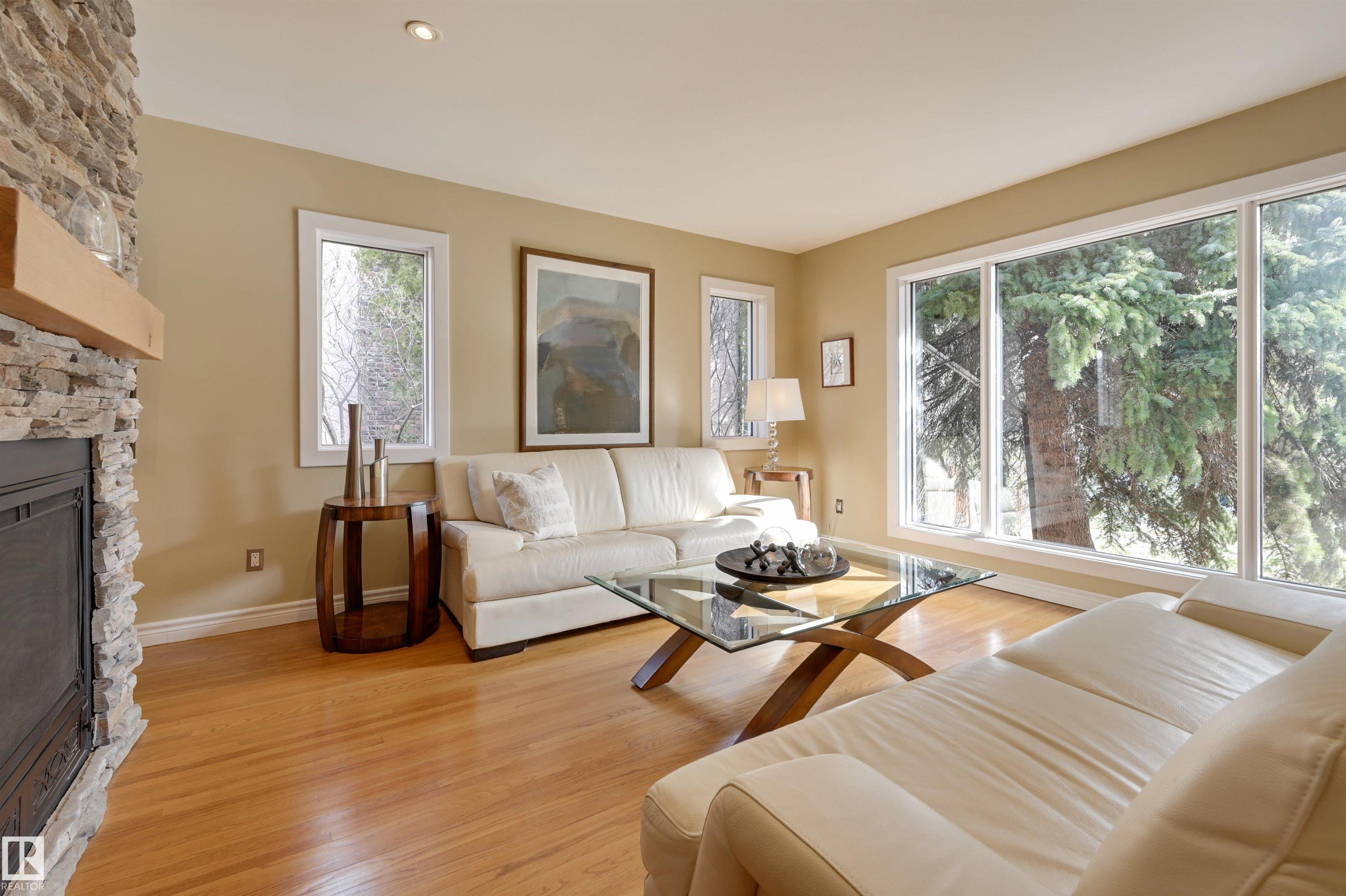 Tucked into the heart of Crestwood, this story-and-a-half blends charm with surprising scale, opening dramatically at the rear to a spacious porch and light-filled addition. The main floor offers two bedrooms/Offices -- one with garden doors to the front veranda -- alongside an inviting living room anchored by a floor-to-ceiling double-sided stone fireplace, seamlessly connecting to the family room (or can be used as a Dining Room) and 4-piece bath. The chef-inspired kitchen showcases slate floors, granite counters, a generous island with bar seating, and a sunny eat-in area. Upstairs, the private primary retreat features a 4-piece ensuite with Jacuzzi tub. The finished basement adds a large rec room, 4th bedroom, 3-piece bath, storage, and bright laundry. Outside, enjoy a fenced yard with cedar deck, green space, and double detached garage, just steps to MacKinnon Ravine. A rare opportunity to enjoy timeless character, thoughtful updates, and an unbeatable location just moments from the ravine.