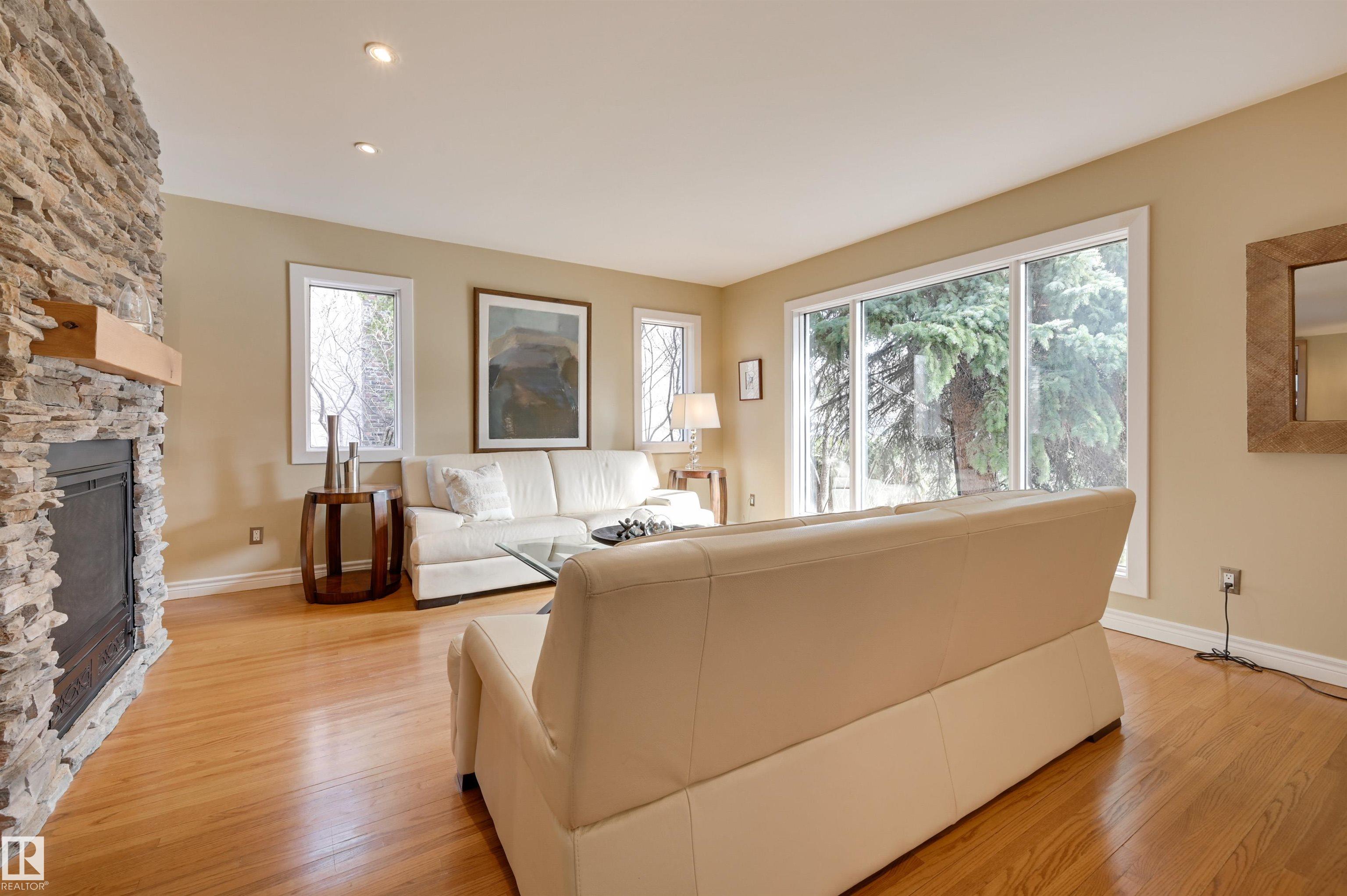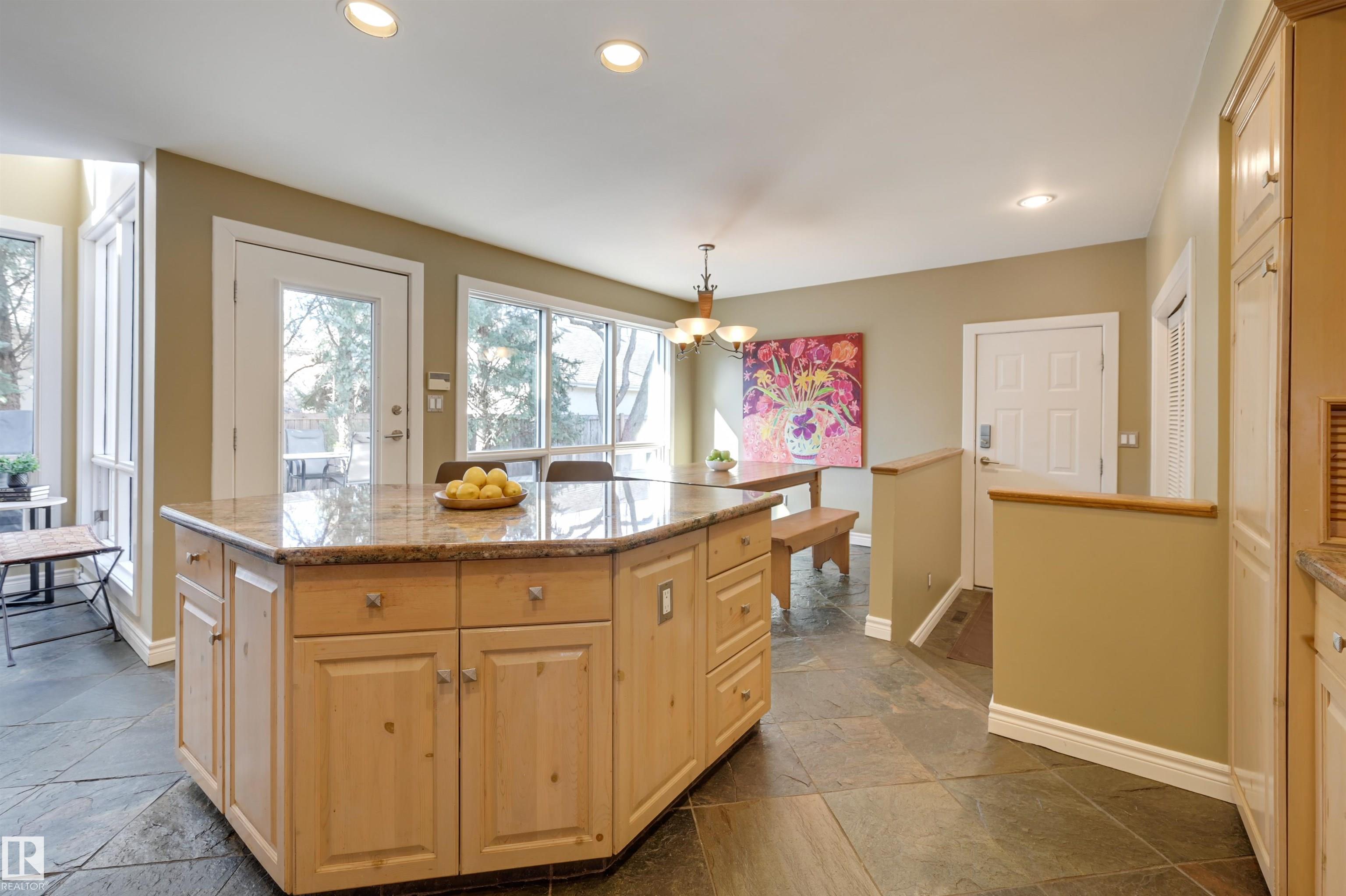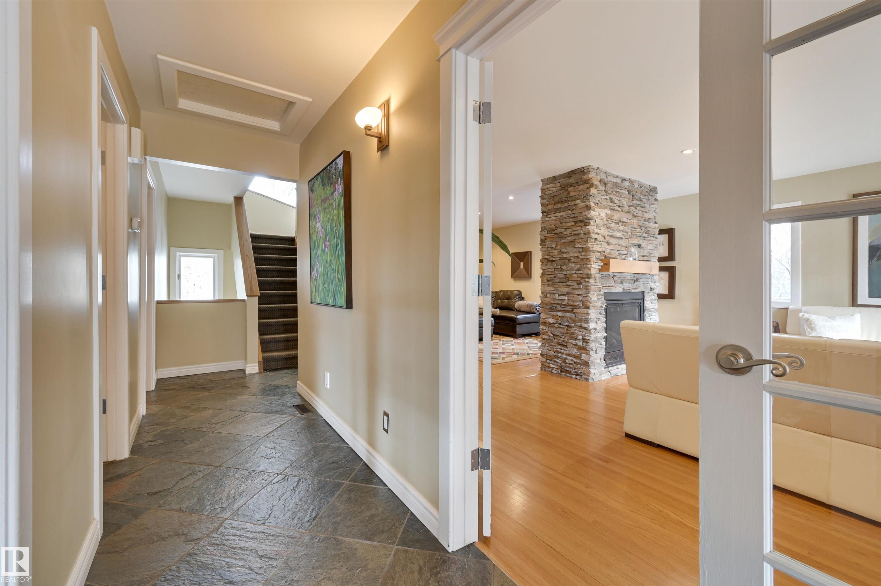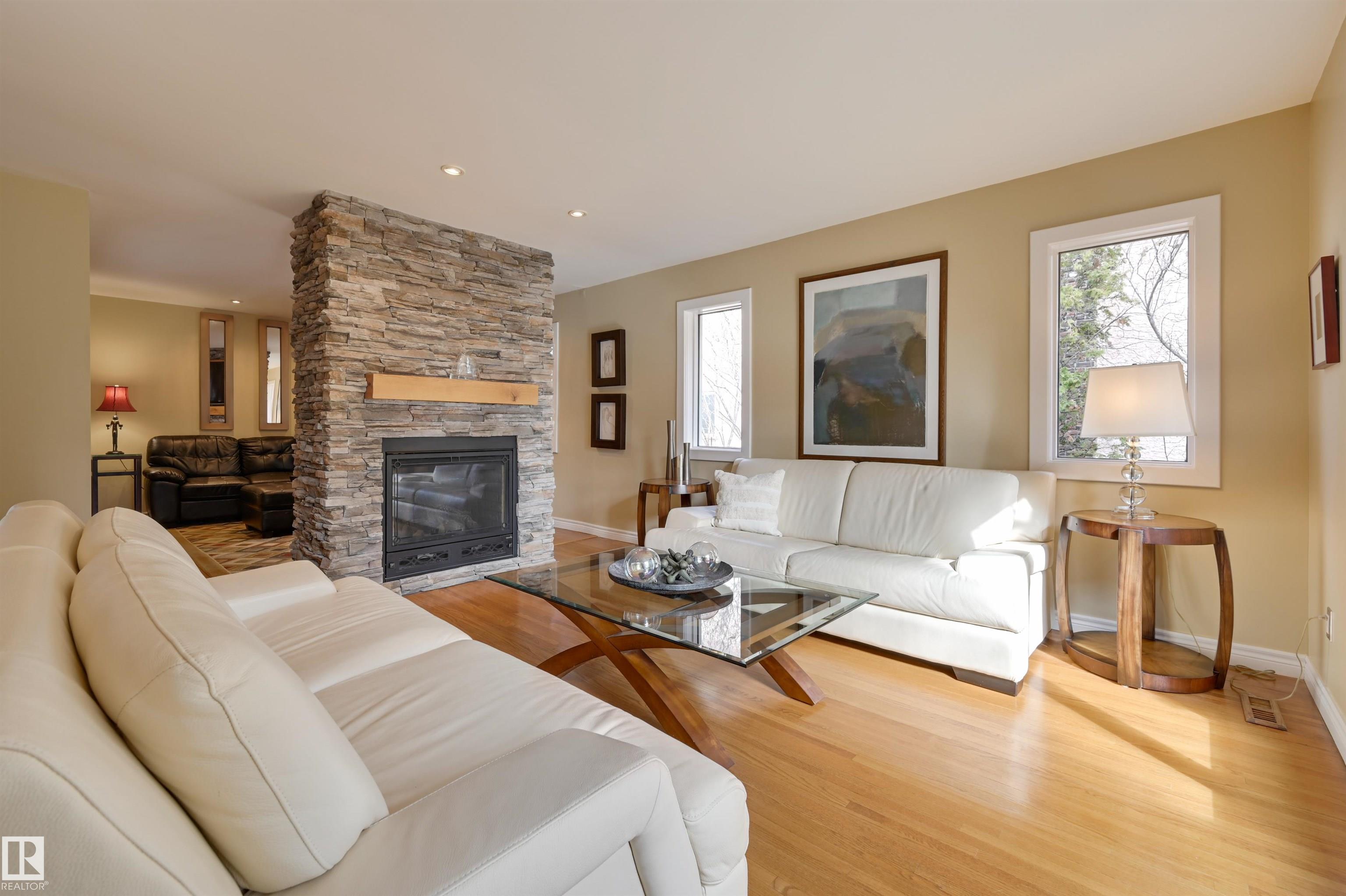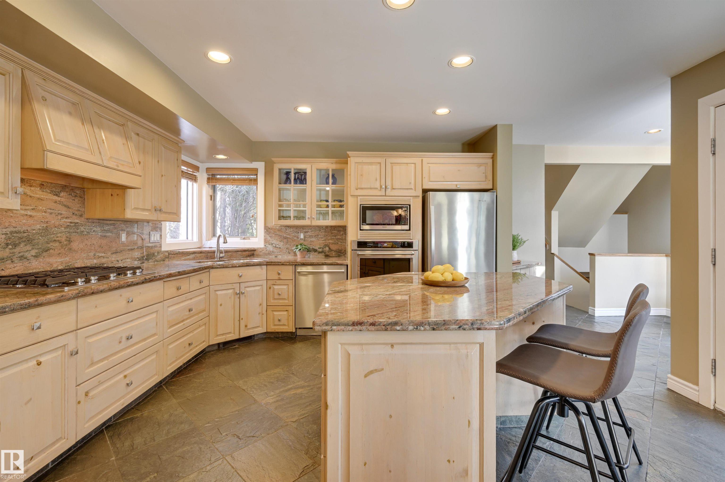 Tucked into the heart of Crestwood, this story-and-a-half blends charm with surprising scale, opening dramatically at the rear to a spacious porch and light-filled addition. The main floor offers two bedrooms/Offices -- one with garden doors to the front veranda -- alongside an inviting living room anchored by a floor-to-ceiling double-sided stone fireplace, seamlessly connecting to the family room (or can be used as a Dining Room) and 4-piece bath. The chef-inspired kitchen showcases slate floors, granite counters, a generous island with bar seating, and a sunny eat-in area. Upstairs, the private primary retreat features a 4-piece ensuite with Jacuzzi tub. The finished basement adds a large rec room, 4th bedroom, 3-piece bath, storage, and bright laundry. Outside, enjoy a fenced yard with cedar deck, green space, and double detached garage, just steps to MacKinnon Ravine. A rare opportunity to enjoy timeless character, thoughtful updates, and an unbeatable location just moments from the ravine.