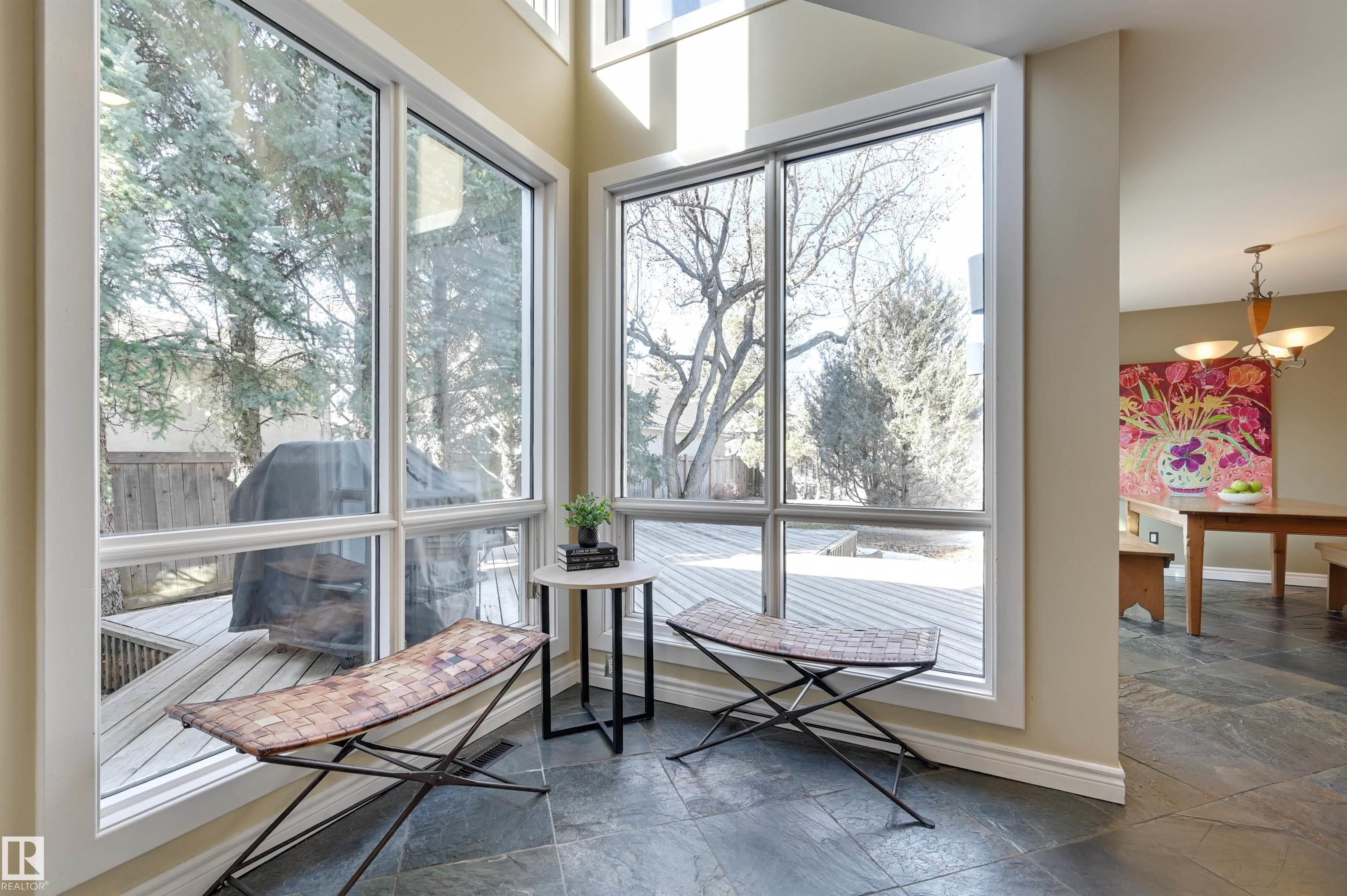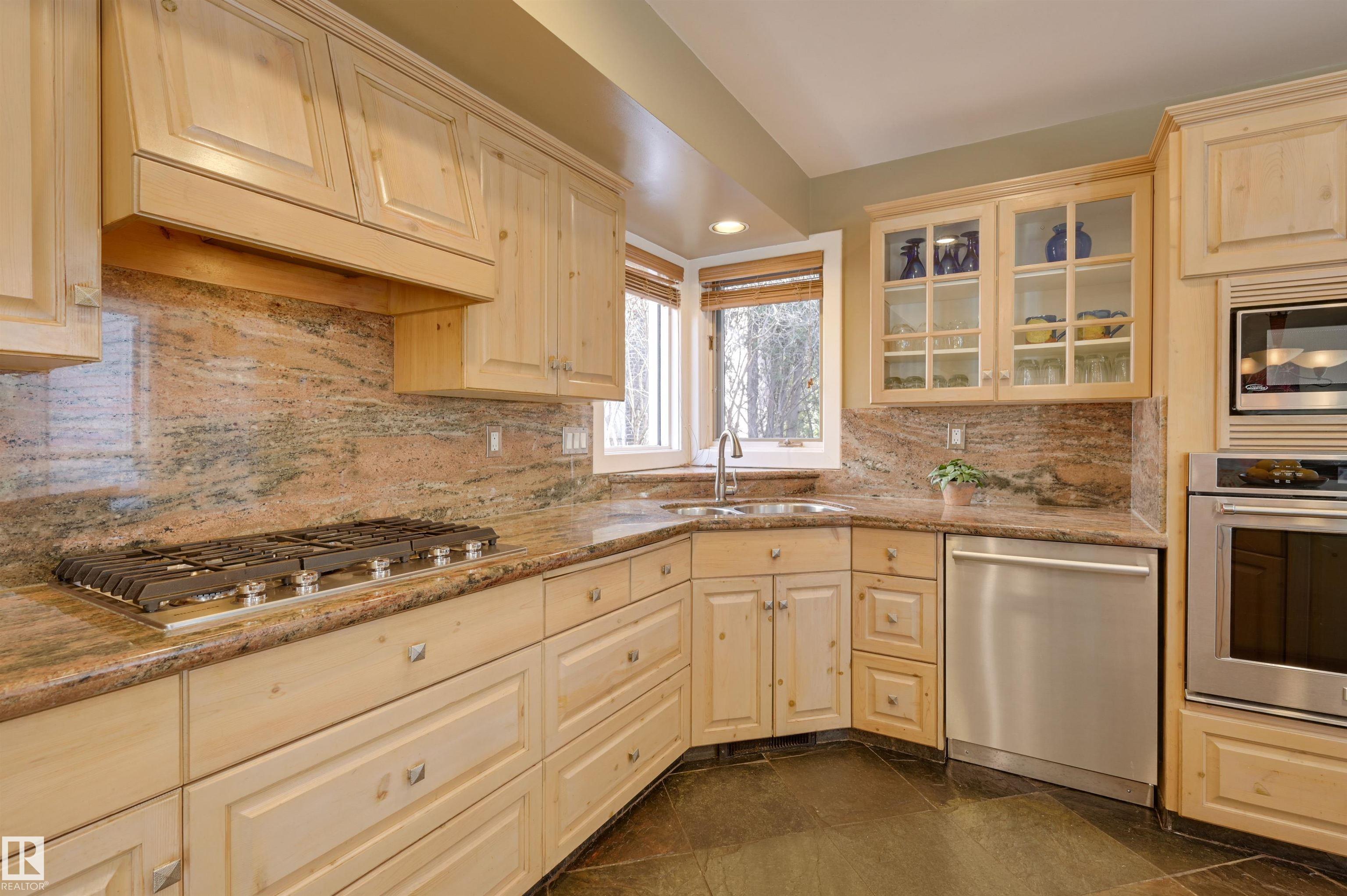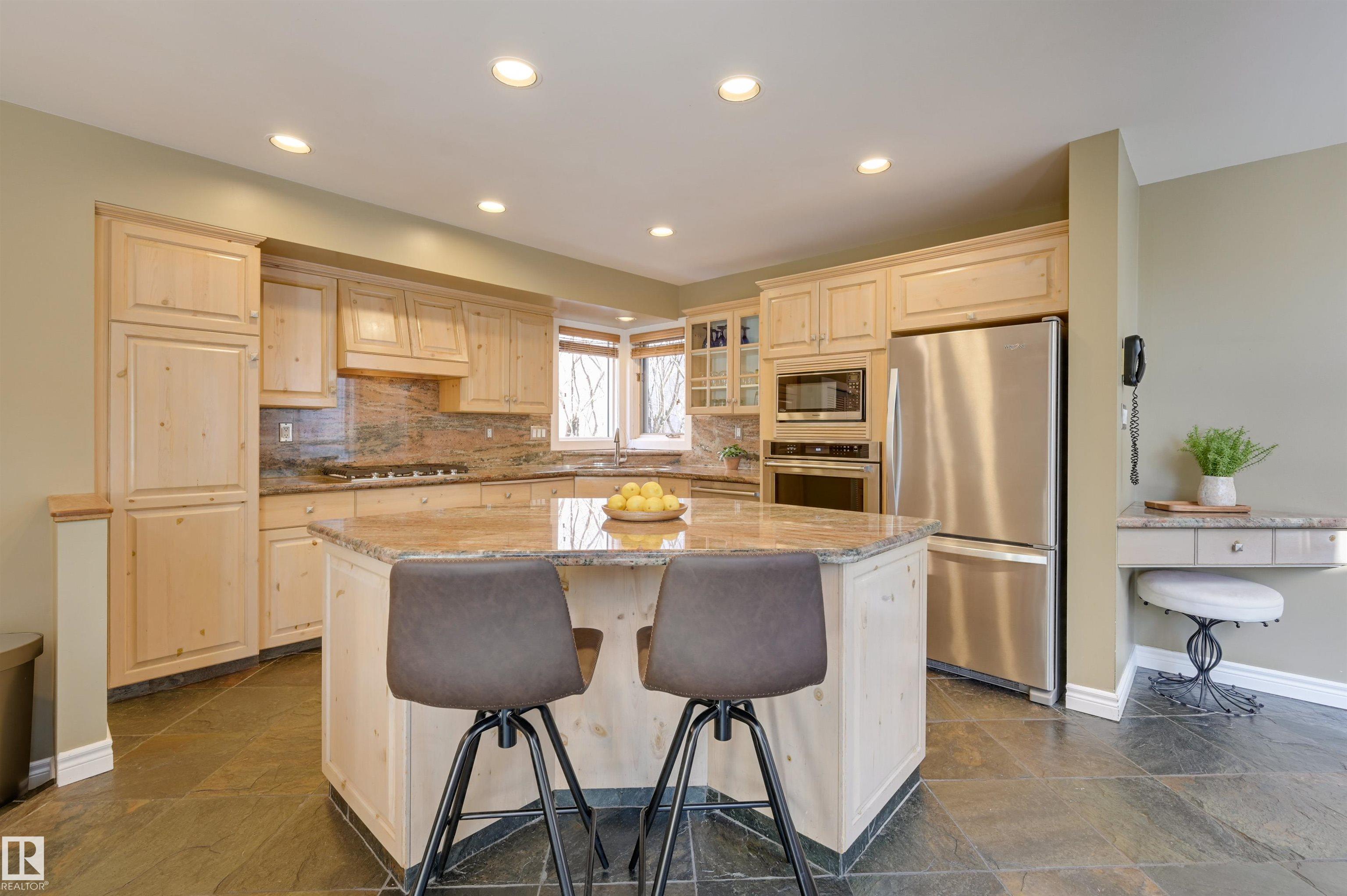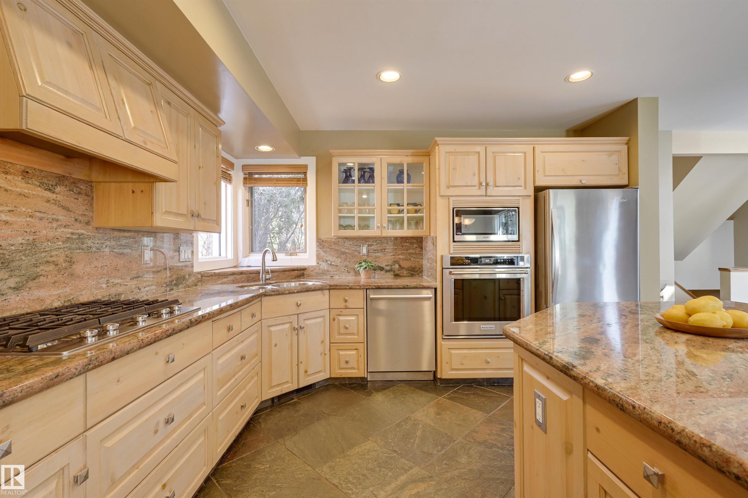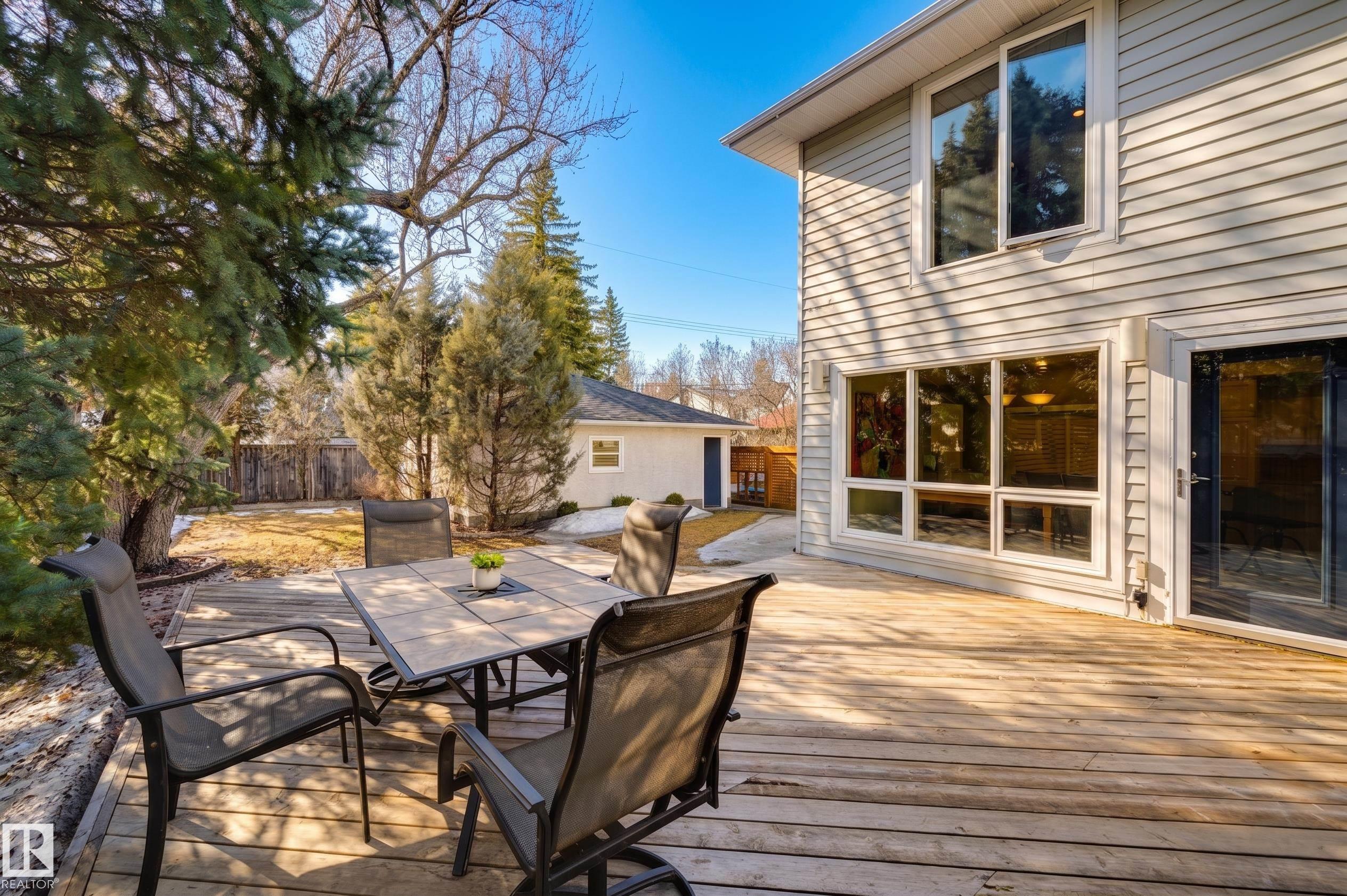Tucked into the heart of Crestwood, this story-and-a-half blends charm with surprising scale, opening dramatically at the rear to a spacious porch and light-filled addition. The main floor offers two bedrooms/Offices -- one with garden doors to the front veranda -- alongside an inviting living room anchored by a floor-to-ceiling double-sided stone fireplace, seamlessly connecting to the family room (or can be used as a Dining Room) and 4-piece bath. The chef-inspired kitchen showcases slate floors, granite counters, a generous island with bar seating, and a sunny eat-in area. Upstairs, the private primary retreat features a 4-piece ensuite with Jacuzzi tub. The finished basement adds a large rec room, 4th bedroom, 3-piece bath, storage, and bright laundry. Outside, enjoy a fenced yard with cedar deck, green space, and double detached garage, just steps to MacKinnon Ravine. A rare opportunity to enjoy timeless character, thoughtful updates, and an unbeatable location just moments from the ravine.