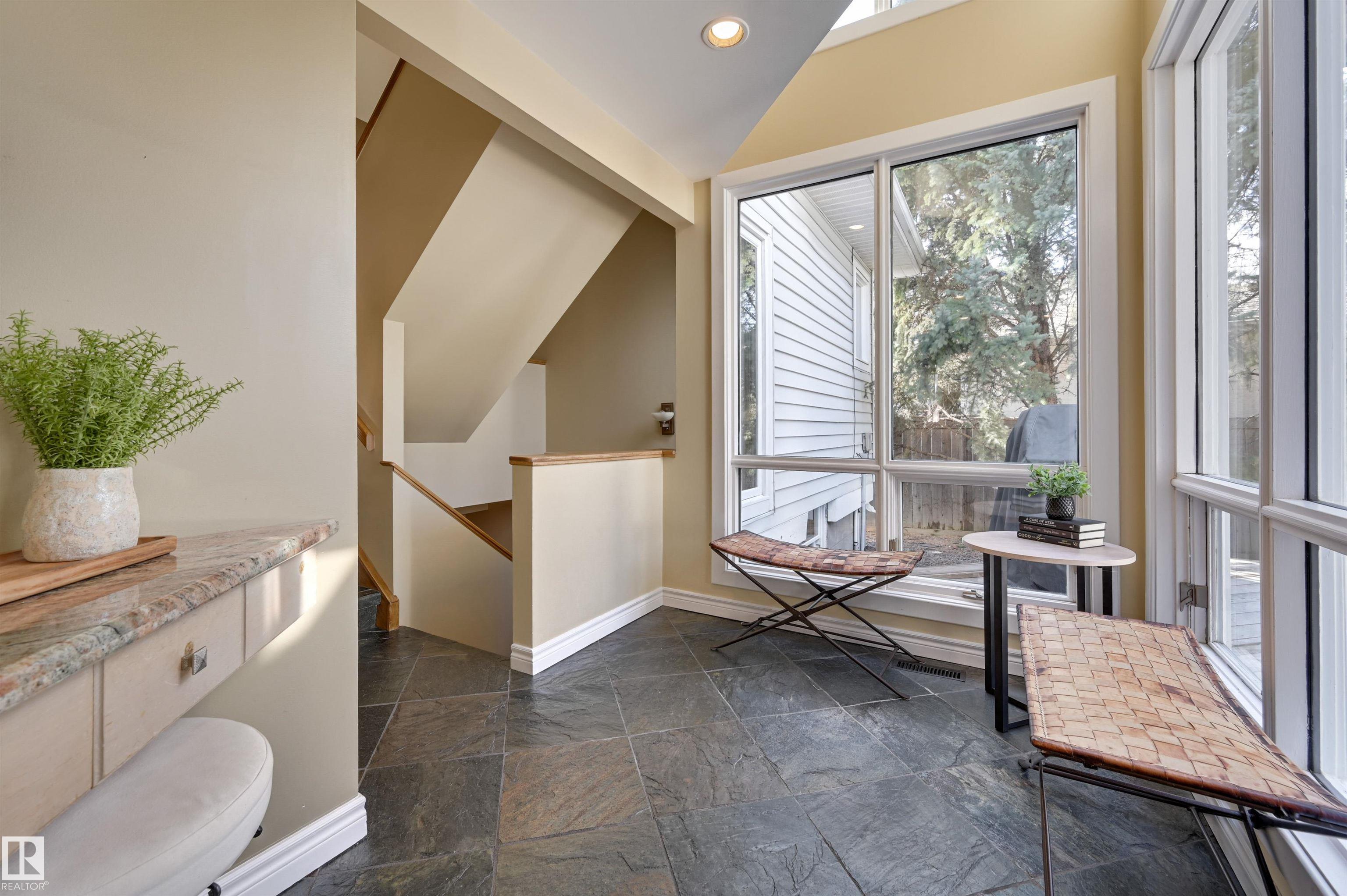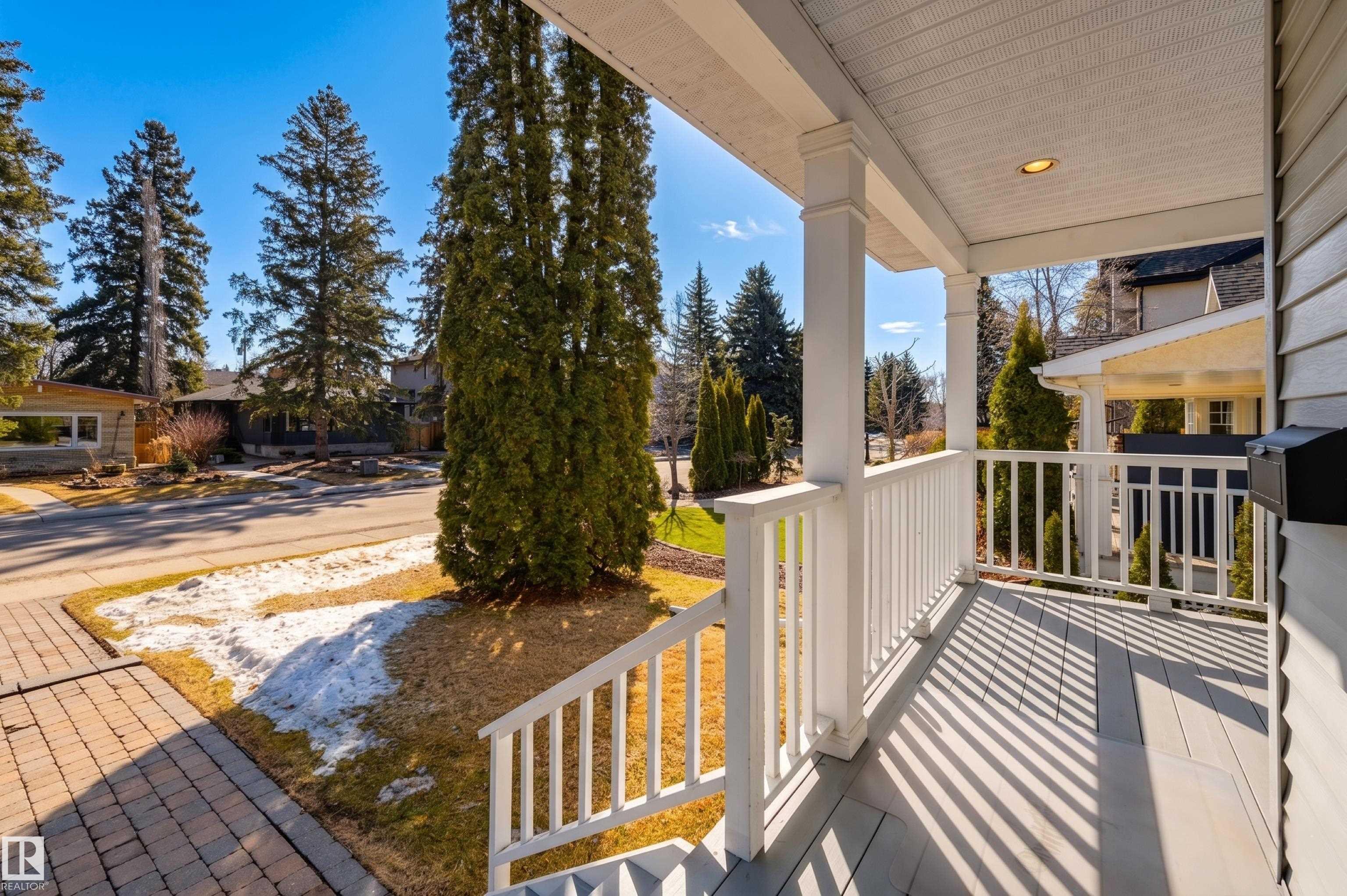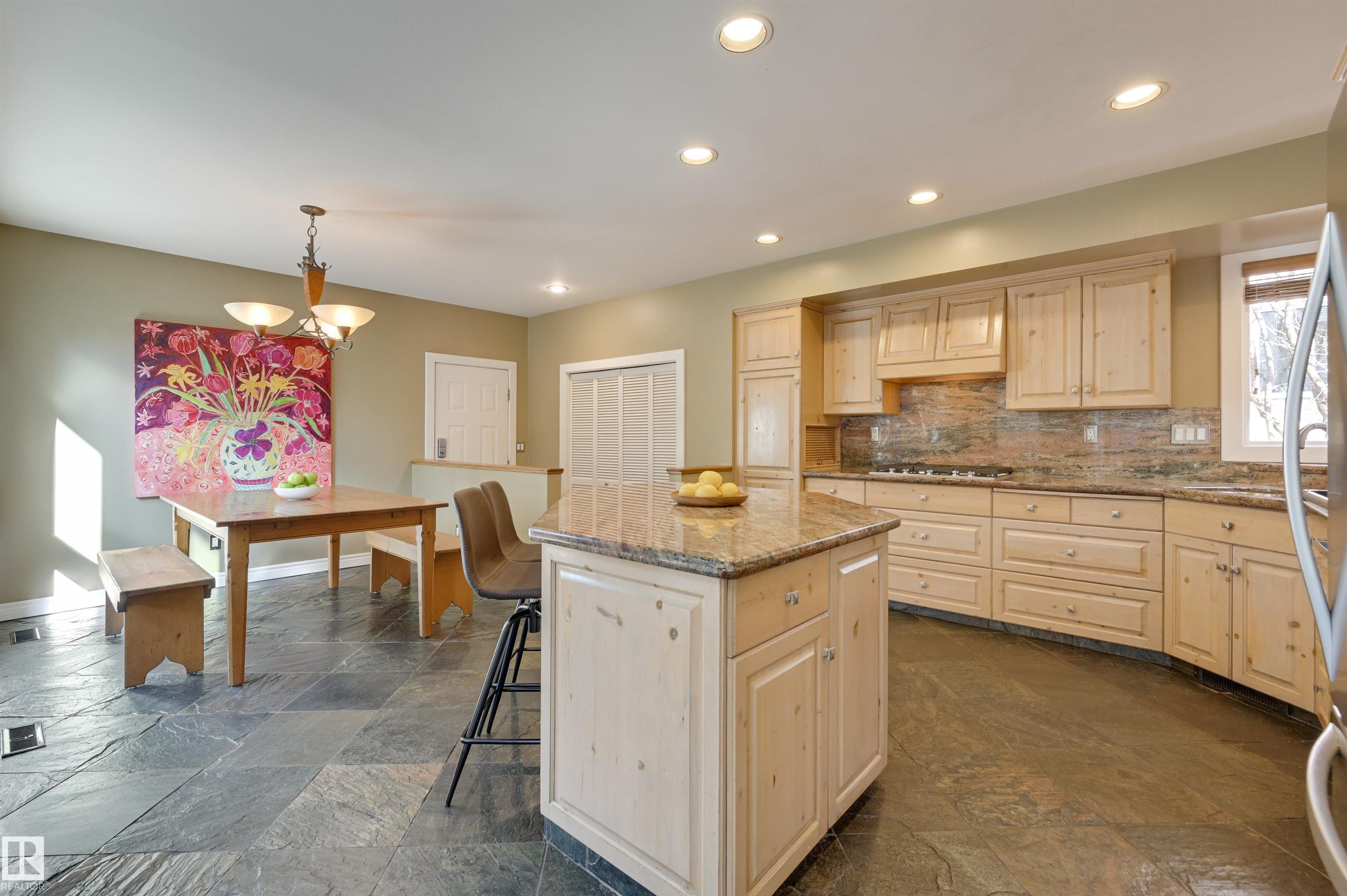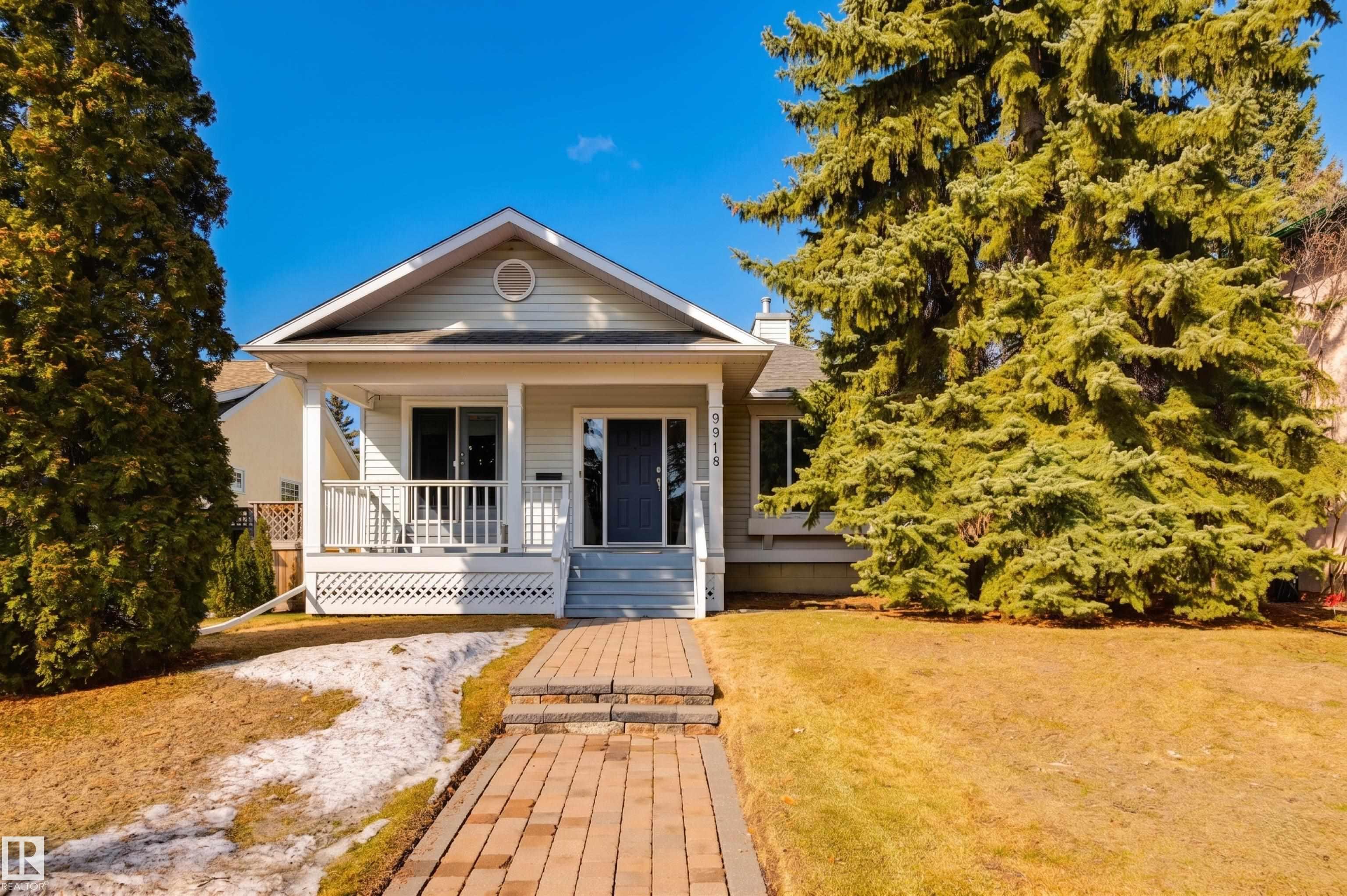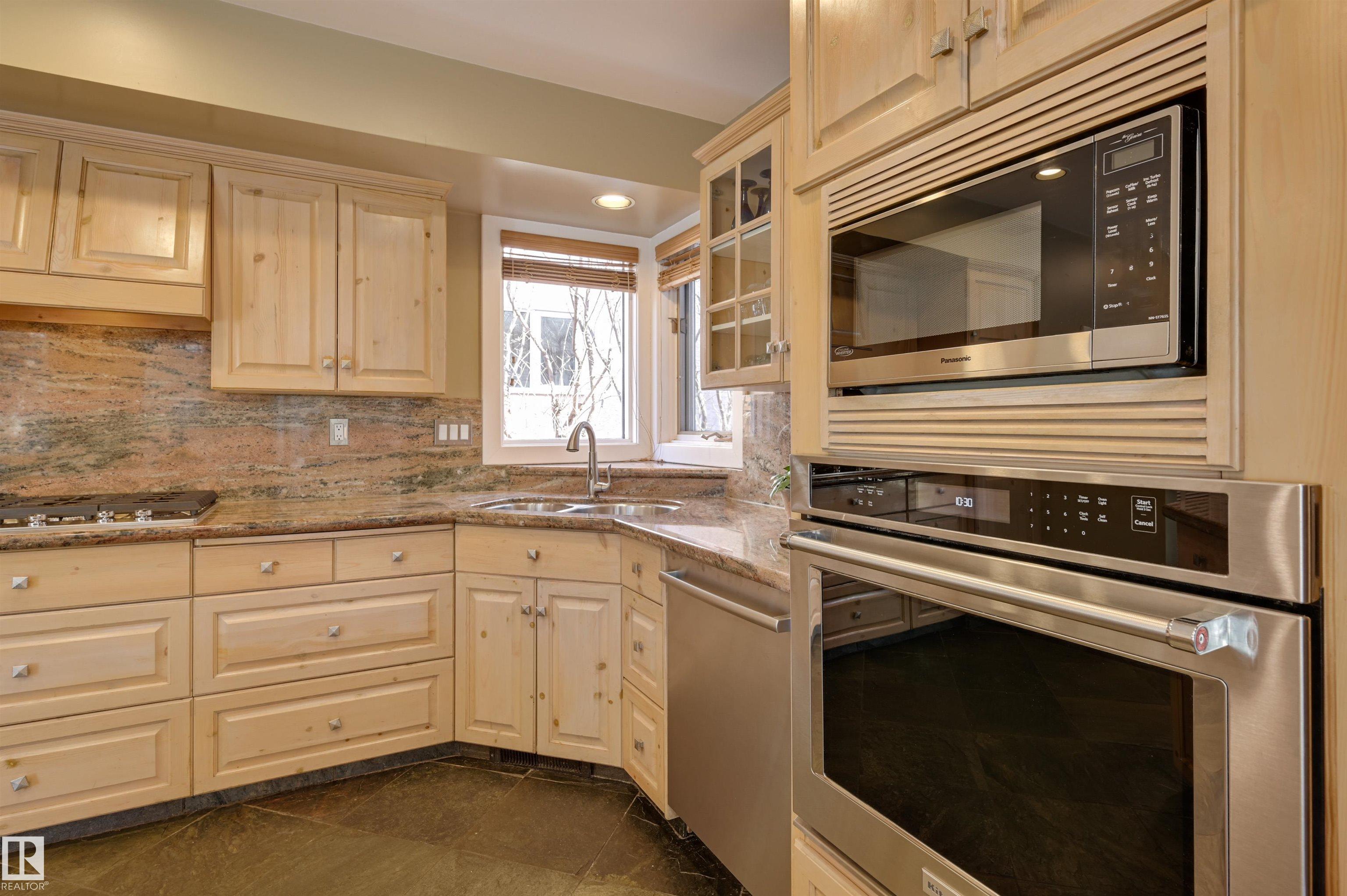Tucked into the heart of Crestwood, this story-and-a-half blends charm with surprising scale, opening dramatically at the rear to a spacious porch and light-filled addition. The main floor offers two bedrooms/Offices -- one with garden doors to the front veranda -- alongside an inviting living room anchored by a floor-to-ceiling double-sided stone fireplace, seamlessly connecting to the family room (or can be used as a Dining Room) and 4-piece bath. The chef-inspired kitchen showcases slate floors, granite counters, a generous island with bar seating, and a sunny eat-in area. Upstairs, the private primary retreat features a 4-piece ensuite with Jacuzzi tub. The finished basement adds a large rec room, 4th bedroom, 3-piece bath, storage, and bright laundry. Outside, enjoy a fenced yard with cedar deck, green space, and double detached garage, just steps to MacKinnon Ravine. A rare opportunity to enjoy timeless character, thoughtful updates, and an unbeatable location just moments from the ravine.