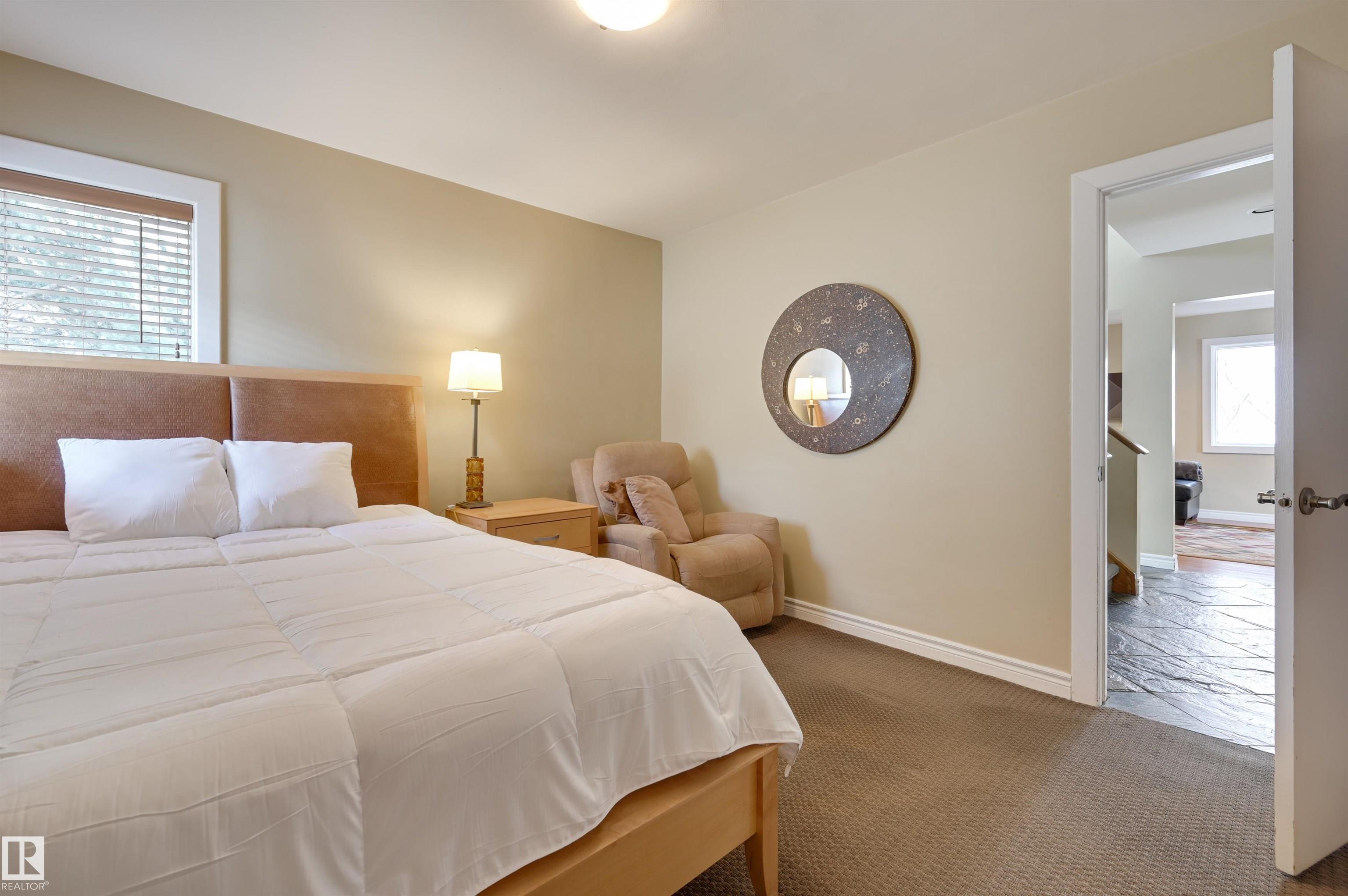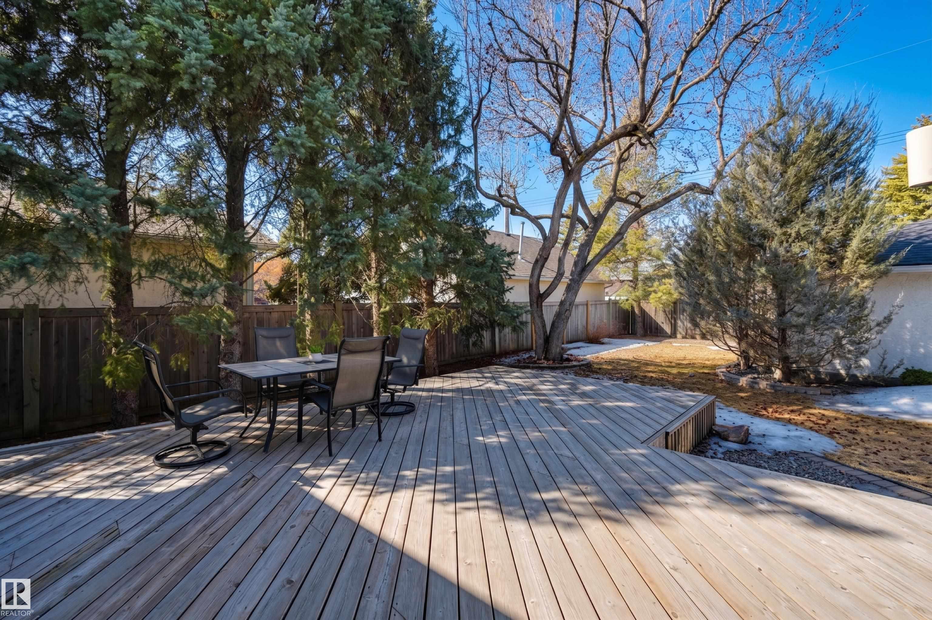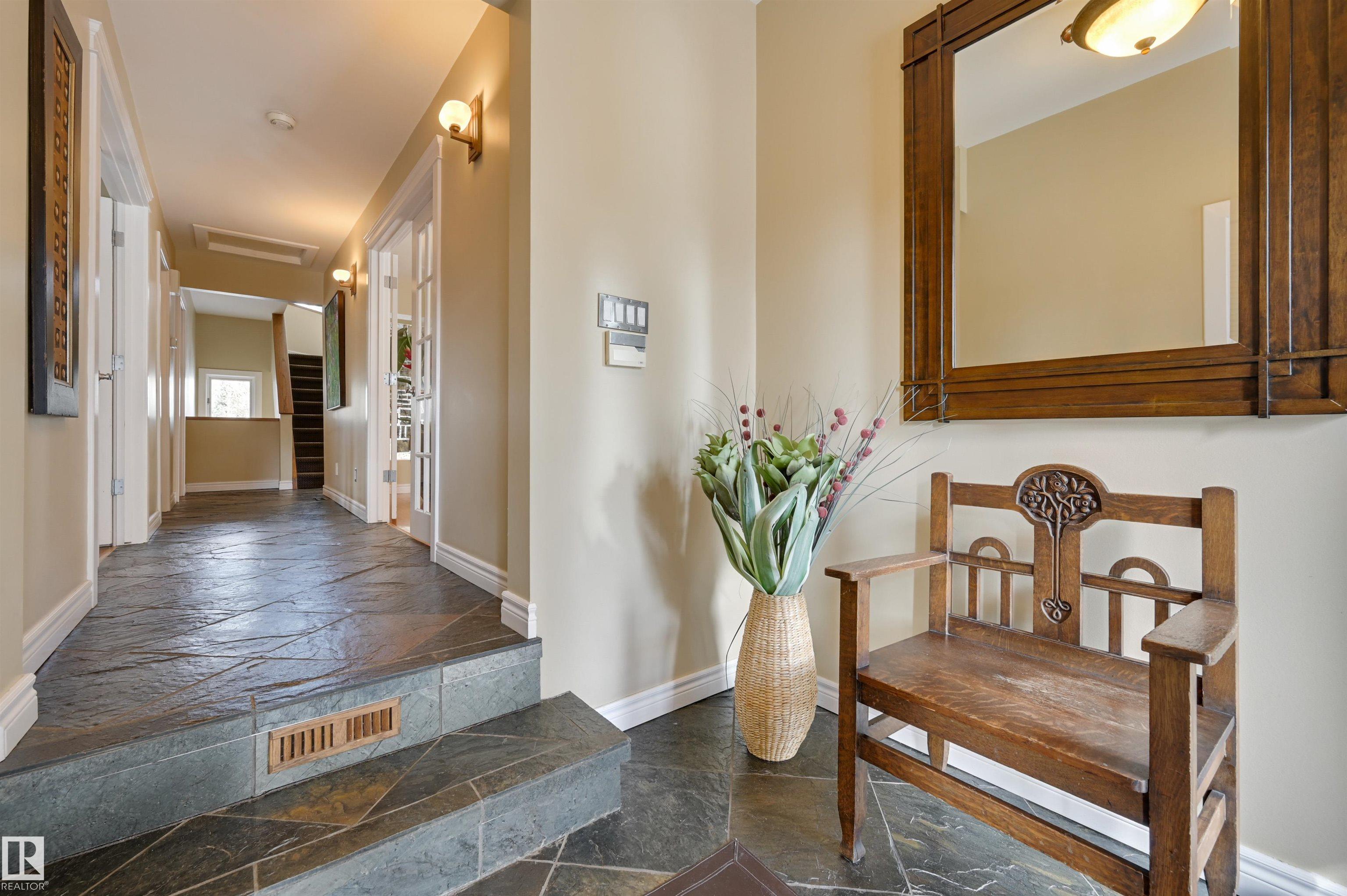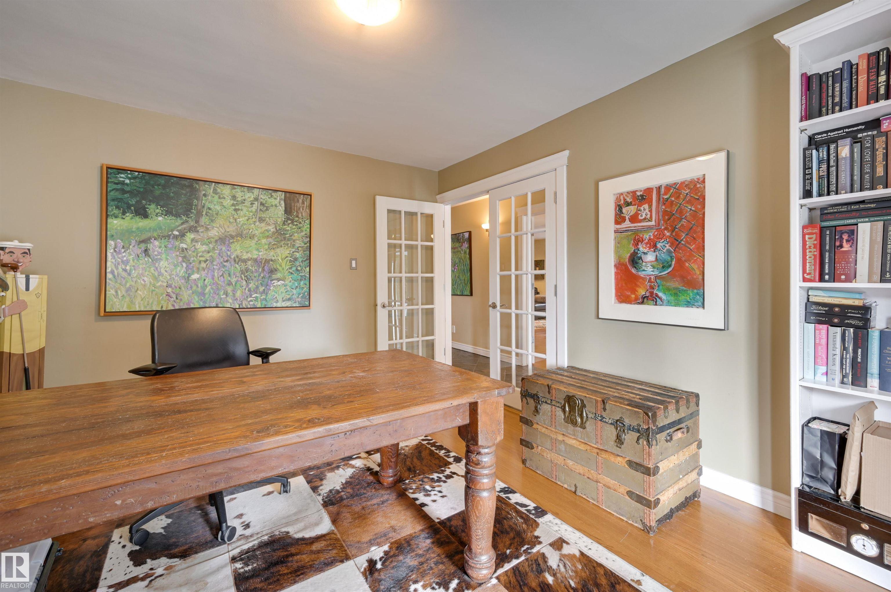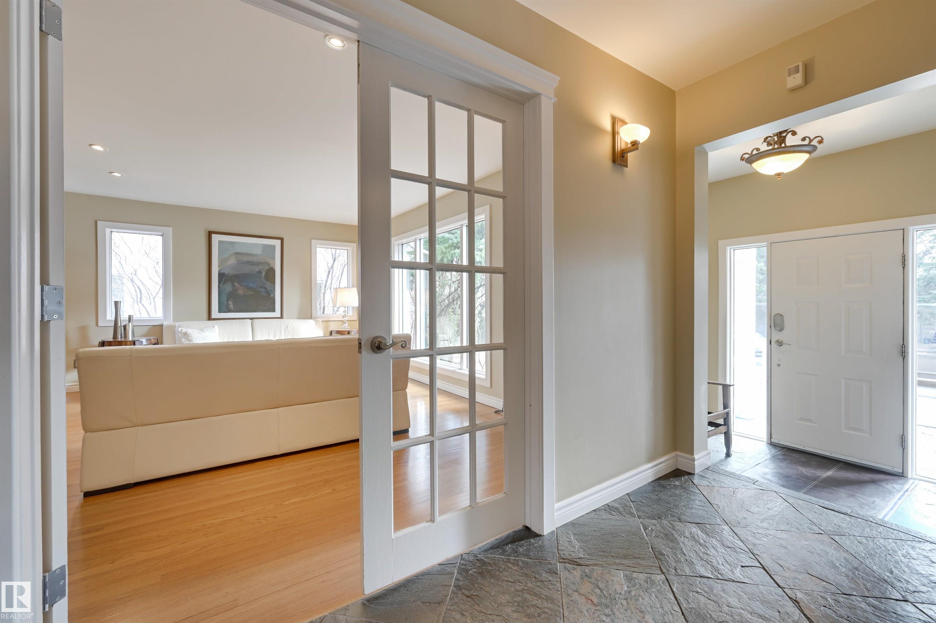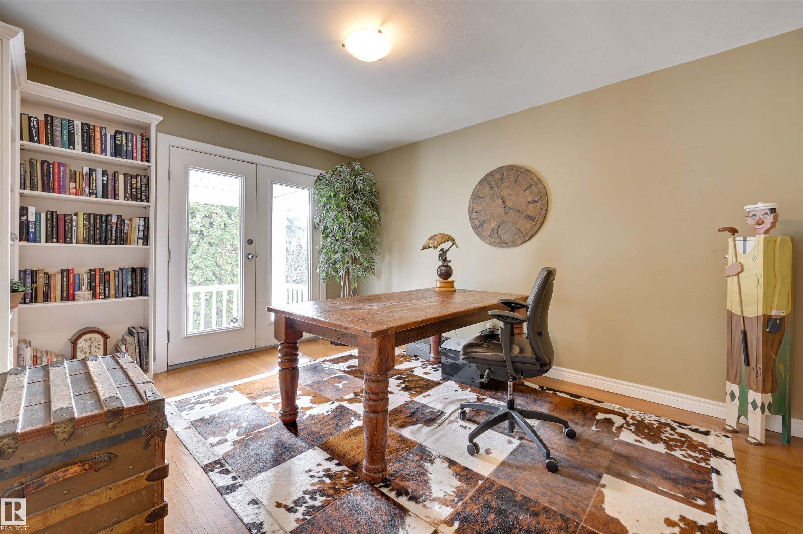 Tucked into the heart of Crestwood, this story-and-a-half blends charm with surprising scale, opening dramatically at the rear to a spacious porch and light-filled addition. The main floor offers two bedrooms/Offices -- one with garden doors to the front veranda -- alongside an inviting living room anchored by a floor-to-ceiling double-sided stone fireplace, seamlessly connecting to the family room (or can be used as a Dining Room) and 4-piece bath. The chef-inspired kitchen showcases slate floors, granite counters, a generous island with bar seating, and a sunny eat-in area. Upstairs, the private primary retreat features a 4-piece ensuite with Jacuzzi tub. The finished basement adds a large rec room, 4th bedroom, 3-piece bath, storage, and bright laundry. Outside, enjoy a fenced yard with cedar deck, green space, and double detached garage, just steps to MacKinnon Ravine. A rare opportunity to enjoy timeless character, thoughtful updates, and an unbeatable location just moments from the ravine.
