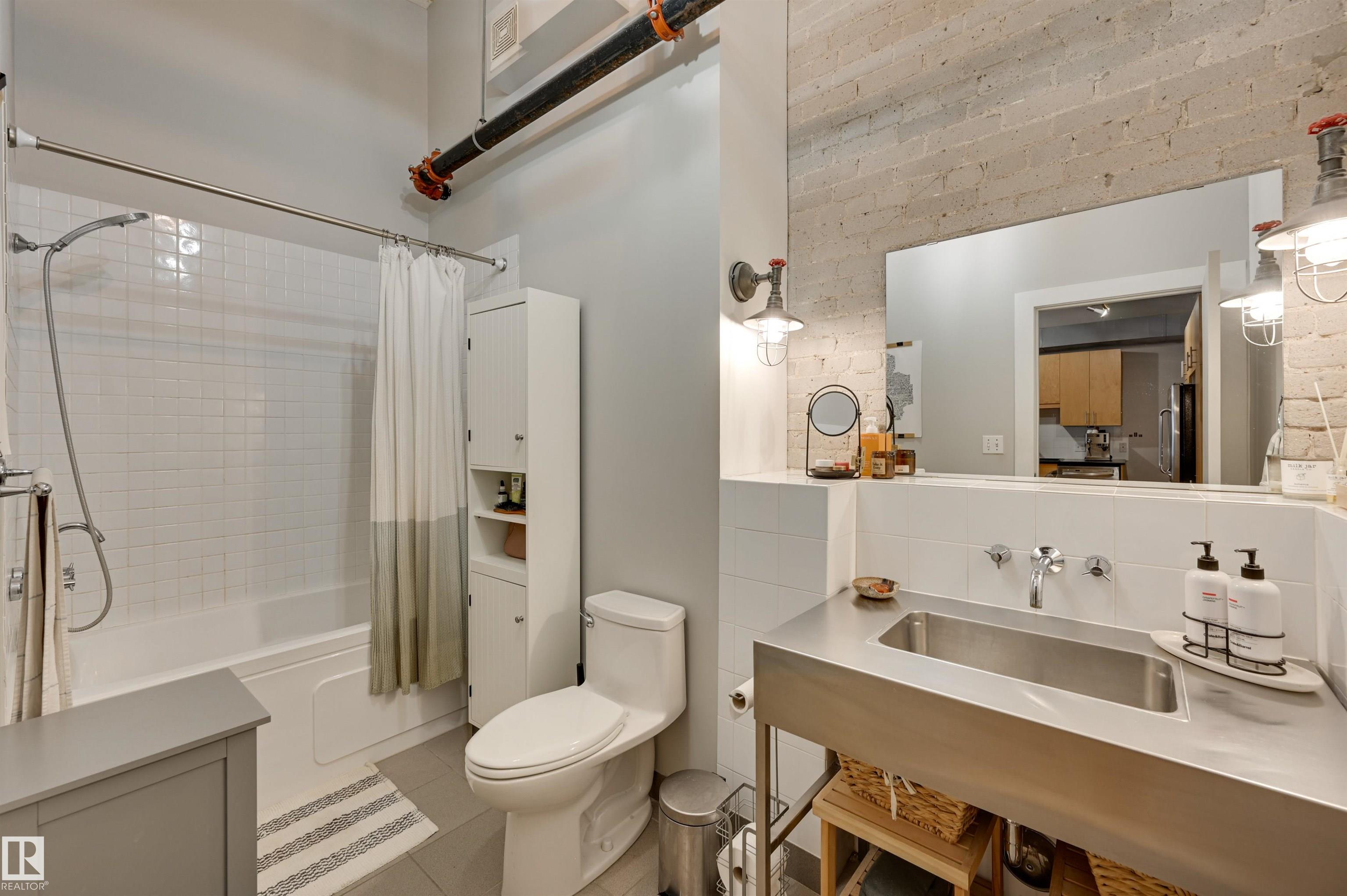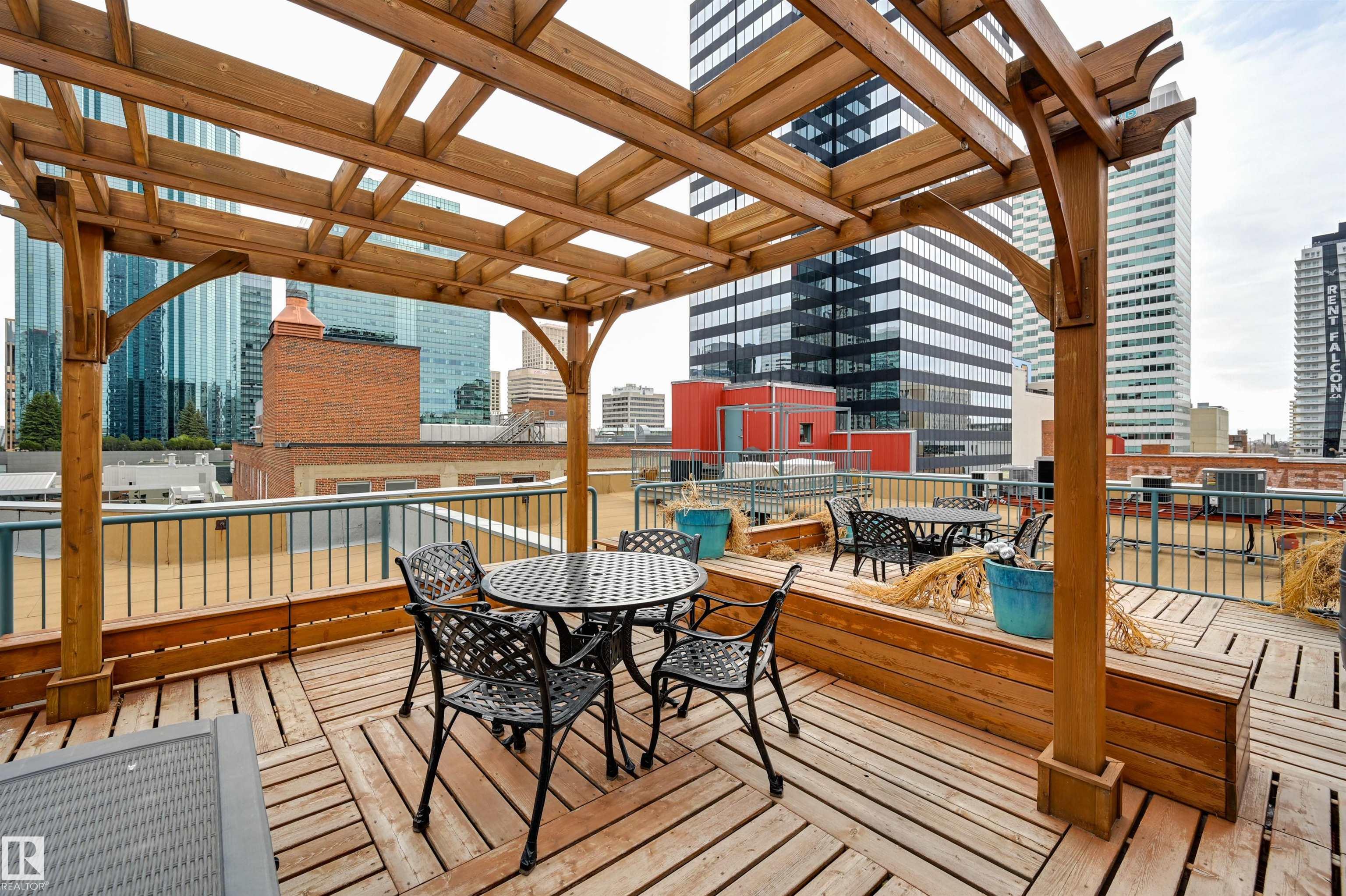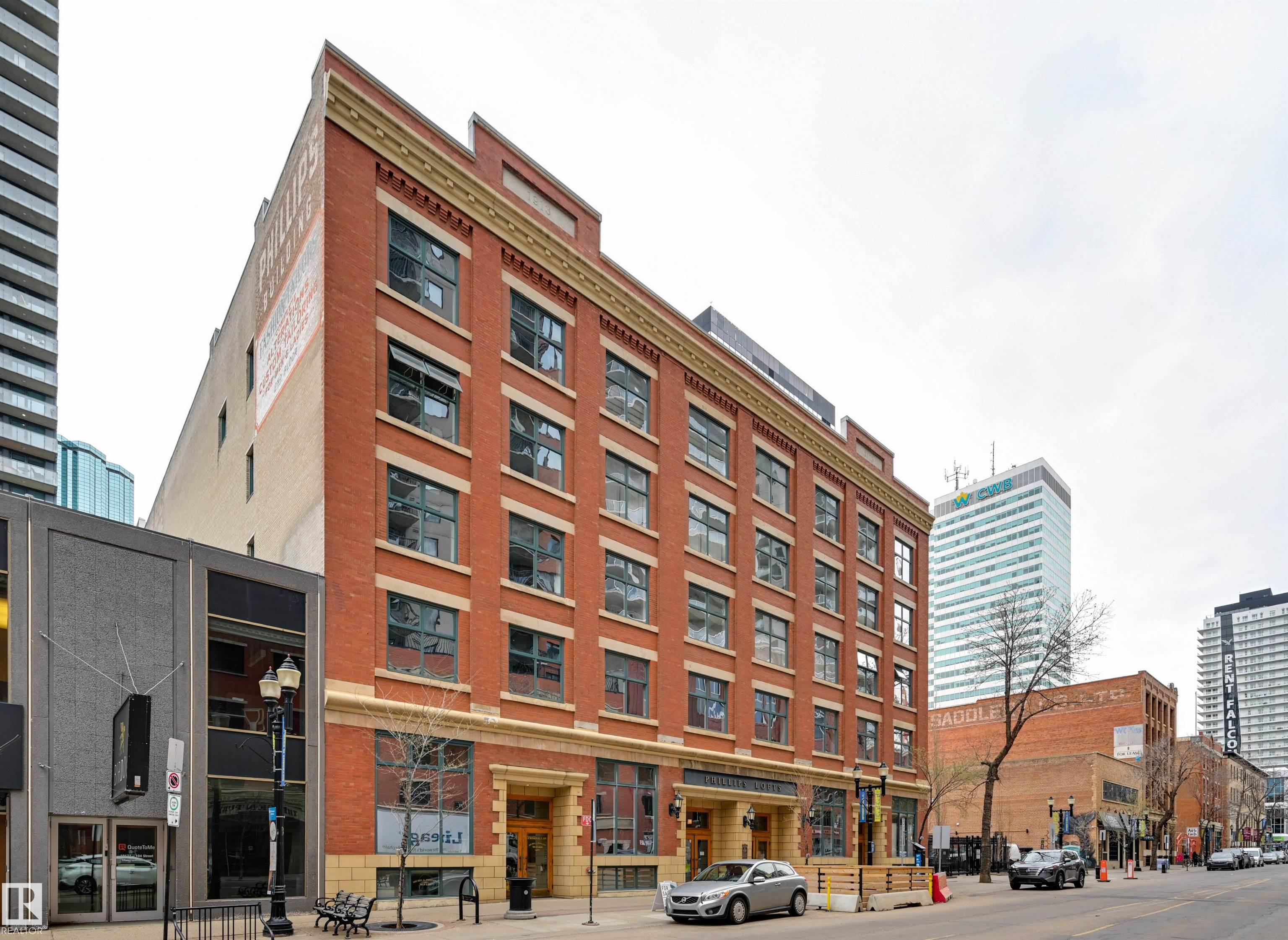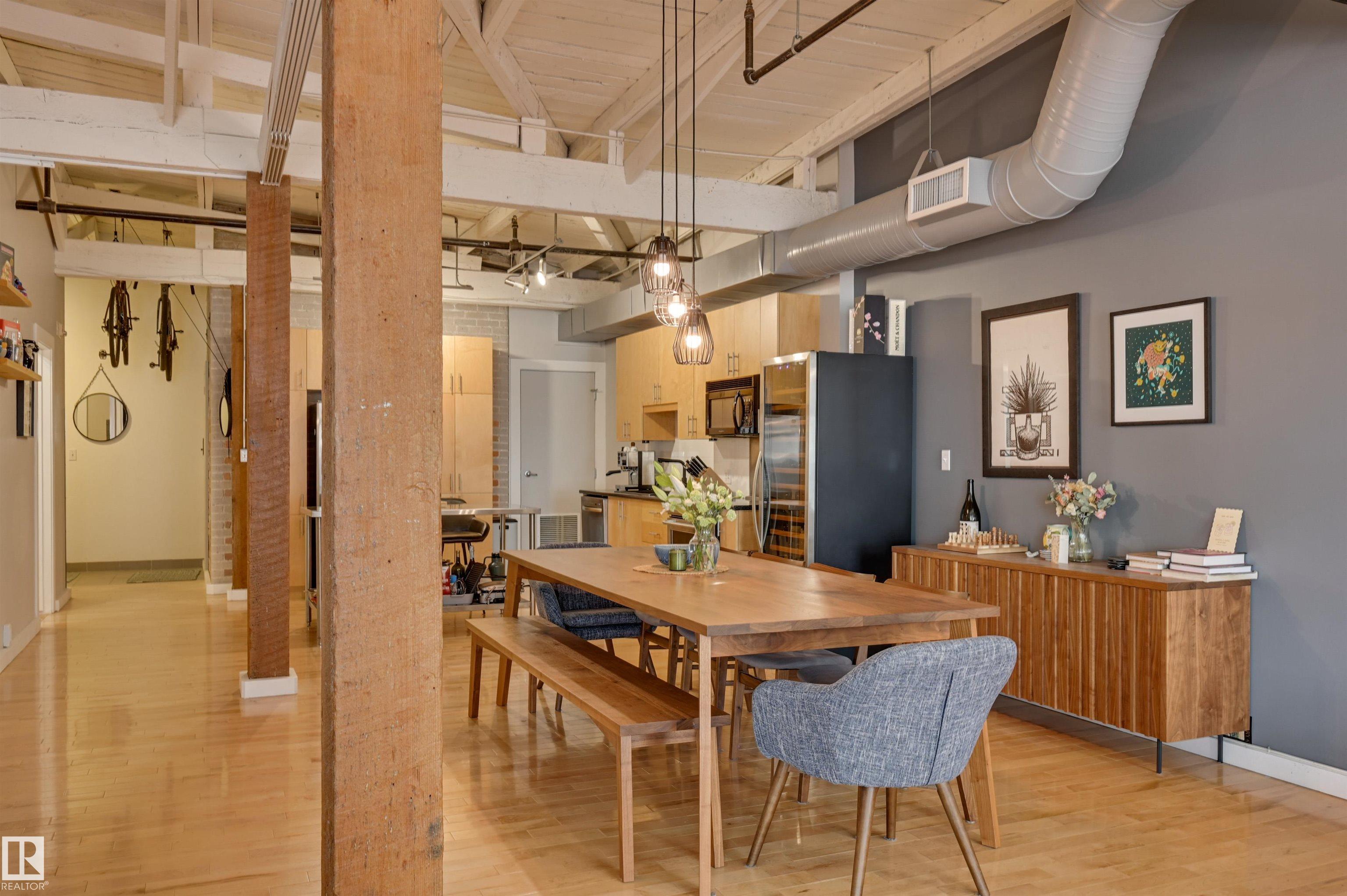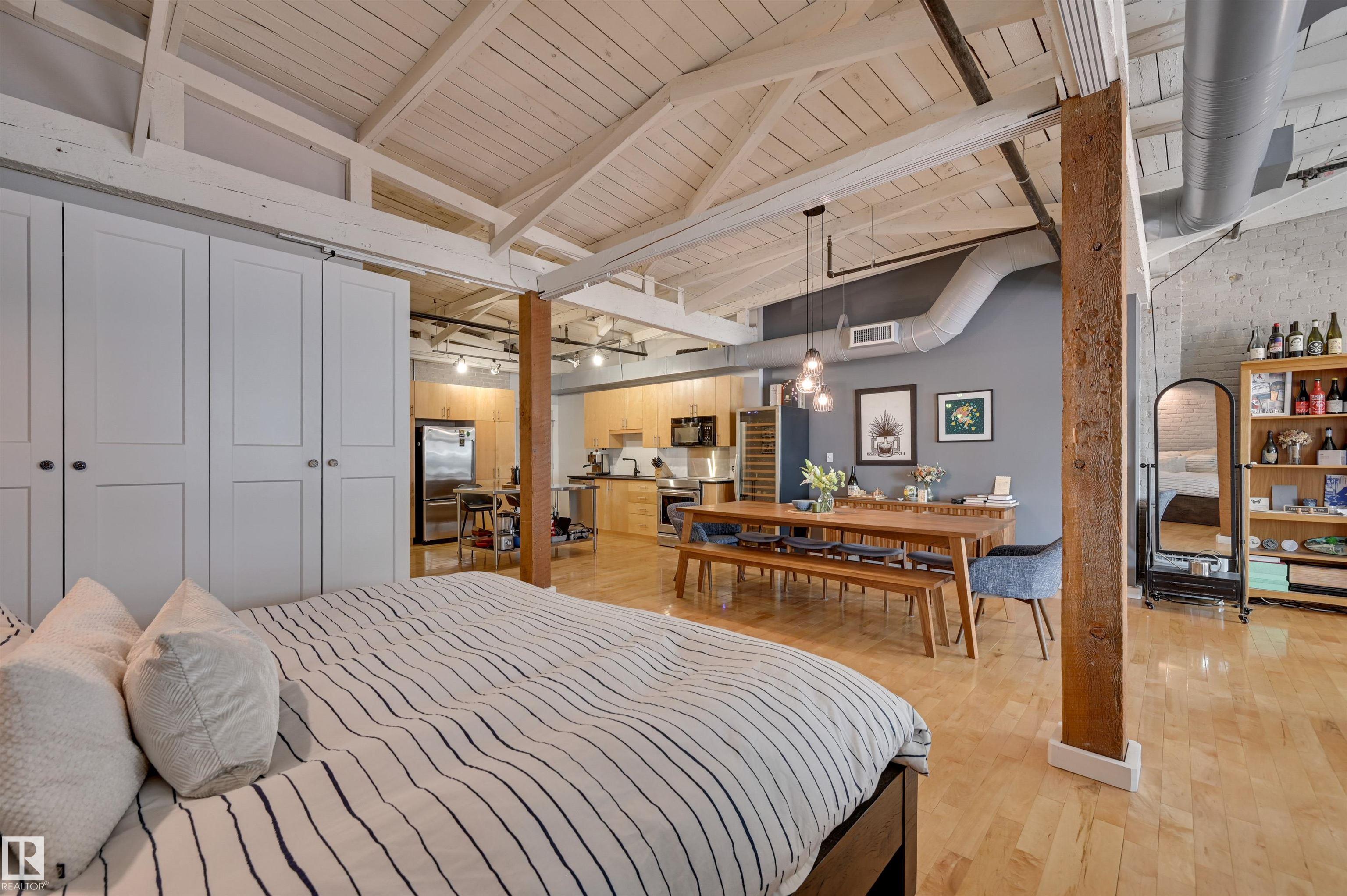 Penthouse living in one of Edmonton's most iconic buildings--Phillips Lofts. Set on the ever-energetic 104th Street Promenade, this downtown showpiece places you at the center of it all: acclaimed restaurants, cocktail bars, local markets, and the Ice District just steps away. This rare loft offers a private elevator entrance, soaring exposed-beam ceilings, and expansive west-facing windows with views down 104th and beyond. The open-concept layout is designed for effortless entertaining, while the updated bathroom adds a refined, modern edge. The kitchen anchors the space with a large stainless steel island, ample cabinetry, and a seamless flow into the dining area. The oversized living room invites cozy movie nights--with room to spare for a dedicated office. Bold, spacious, and undeniably cool, this is downtown living at its finest. In-suite laundry, rooftop patio access with sweeping city views, and underground parking included.