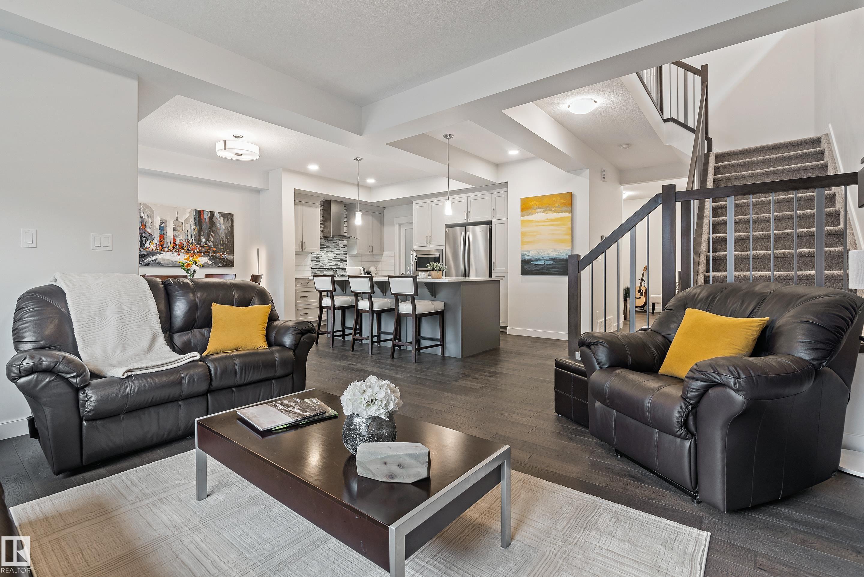 Stunning executive Dolce Vita home showcasing premium craftsmanship, modern elegance & family functionality. The main floor features 9 ft ceilings, engineered hardwood, a stylish den, coffered ceilings & inviting living area with gas fireplace. The chef's kitchen dazzles with quartz counters, large island, stainless appliances, soft-close cabinetry & walk-through pantry. Upstairs offers a bright bonus room, laundry, and a serene primary retreat with spa ensuite & walk-in closet, plus two generous bedrooms & 4-pc bath. Professionally landscaped yard with glass-railed deck, stone patio, fire pit & shed. Heated garage includes built-in cabinetry & custom storage. Upgrades include A/C, Hunter Douglas window coverings, HRV, built-in security & exterior stone accents. Basement awaits your imagination. Steps to ponds, parks, trails, top-rated schools & shops--where refined design meets family comfort in Keswick! You have worked hard to earn a home like this! HURRY and do not miss this opportunity!