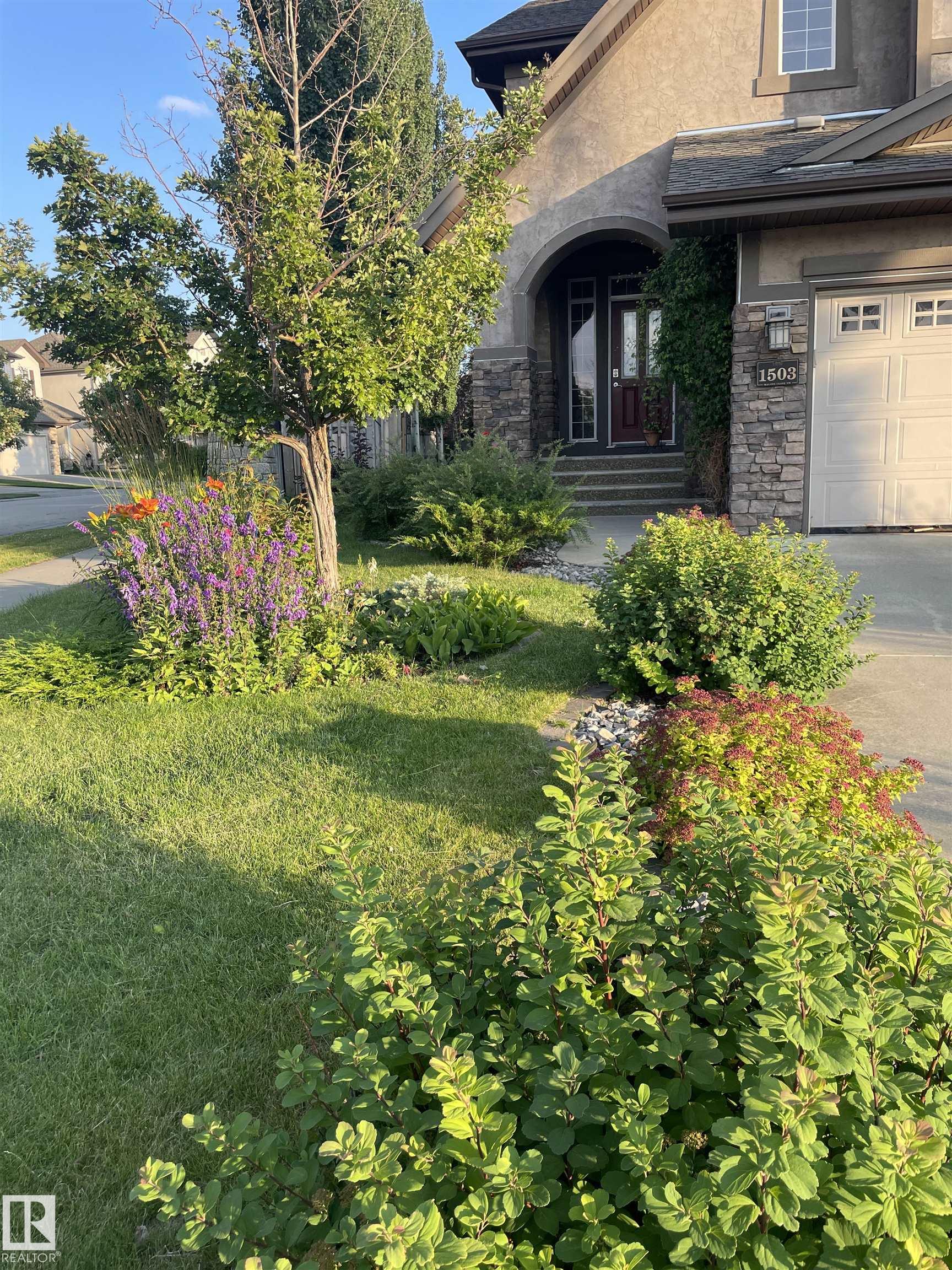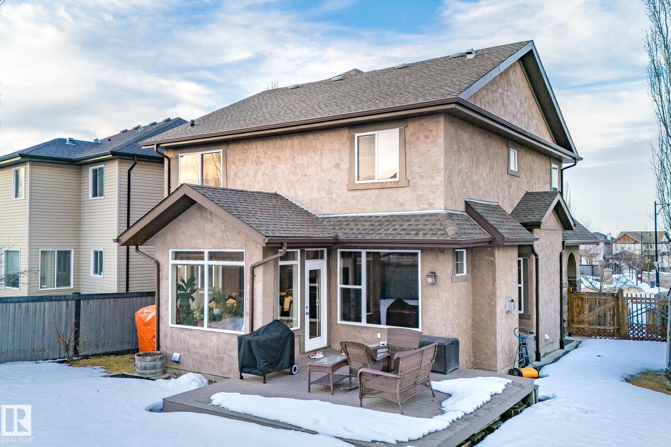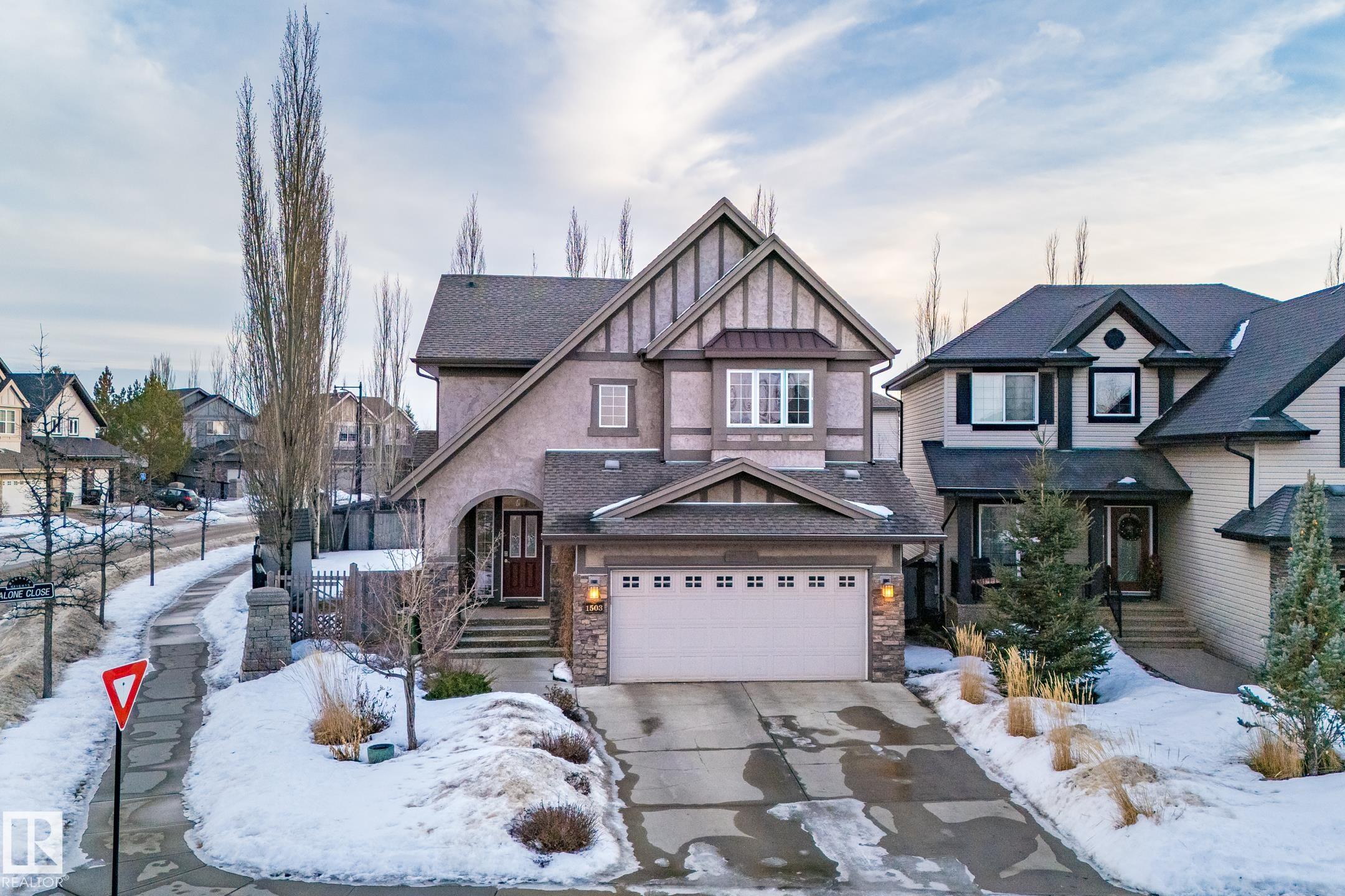 Welcome to this prestigious 2,092 sq ft luxury former show home built by Homes by Avi. This rare Tudor-style residence showcases rich stone & stucco curb appeal and timeless character. Inside, you'll find a stunning kitchen with upgraded appliances, a large centre island, and plenty of space for entertaining. The main floor den makes a perfect home office, while the floor-to-ceiling stone fireplace adds warmth and elegance to the living area. Upstairs offers three spacious bedrooms including a beautiful primary suite with an enormous ensuite, plus a bright bonus room with soaring ceilings. The fully finished basement provides additional living space for family or guests. Enjoy professionally landscaped surroundings on a quiet street just steps from a 13-acre natural urban sanctuary. Extras include A/C, surround sound, tankless water heater, water softener, newer appliances, and a shed. A truly exceptional luxury home.