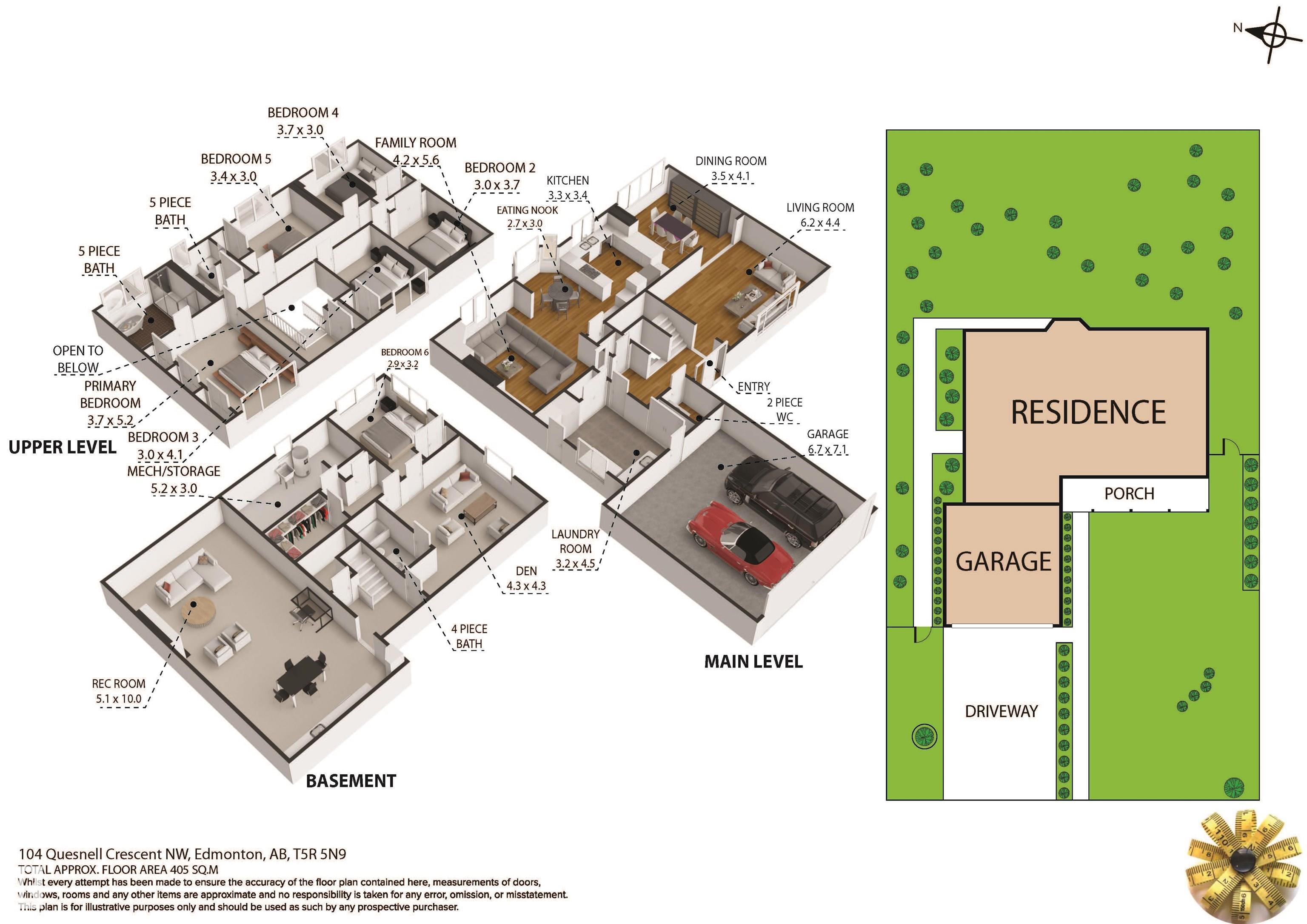 Quesnell Ravine Property! This 6-bedroom, 2-storey home sits on an incredible 14,000 sq ft lot and offers over 4,300 sq ft of upgraded living space. Stunning tigerwood floors span the main level, flowing seamlessly into an open-concept kitchen and family room.The chef's kitchen features dark cherry cabinetry, granite counters, stainless steel appliances, double ovens, 5-burner gas cooktop, oversized fridge, & wine cooler. Family room with wood-burning fireplace opens to a private backyard with patio, gas firepit, and ravine access. Main-floor laundry with sink and ample storage. Primary retreat includes walk-in closet and luxurious 5-piece ensuite with steam shower and clawfoot tub. Finished basement offers rec room with keg cooler, bedroom, den, and bath. Balcony above oversized heated double garage overlooks landscaped yard with sprinklers and lighting. Huge mudroom from Htd Garage. AC, custom drapes, and organizers complete this rare opportunity--Plus Many Schools to choose from! Come see for yourself!