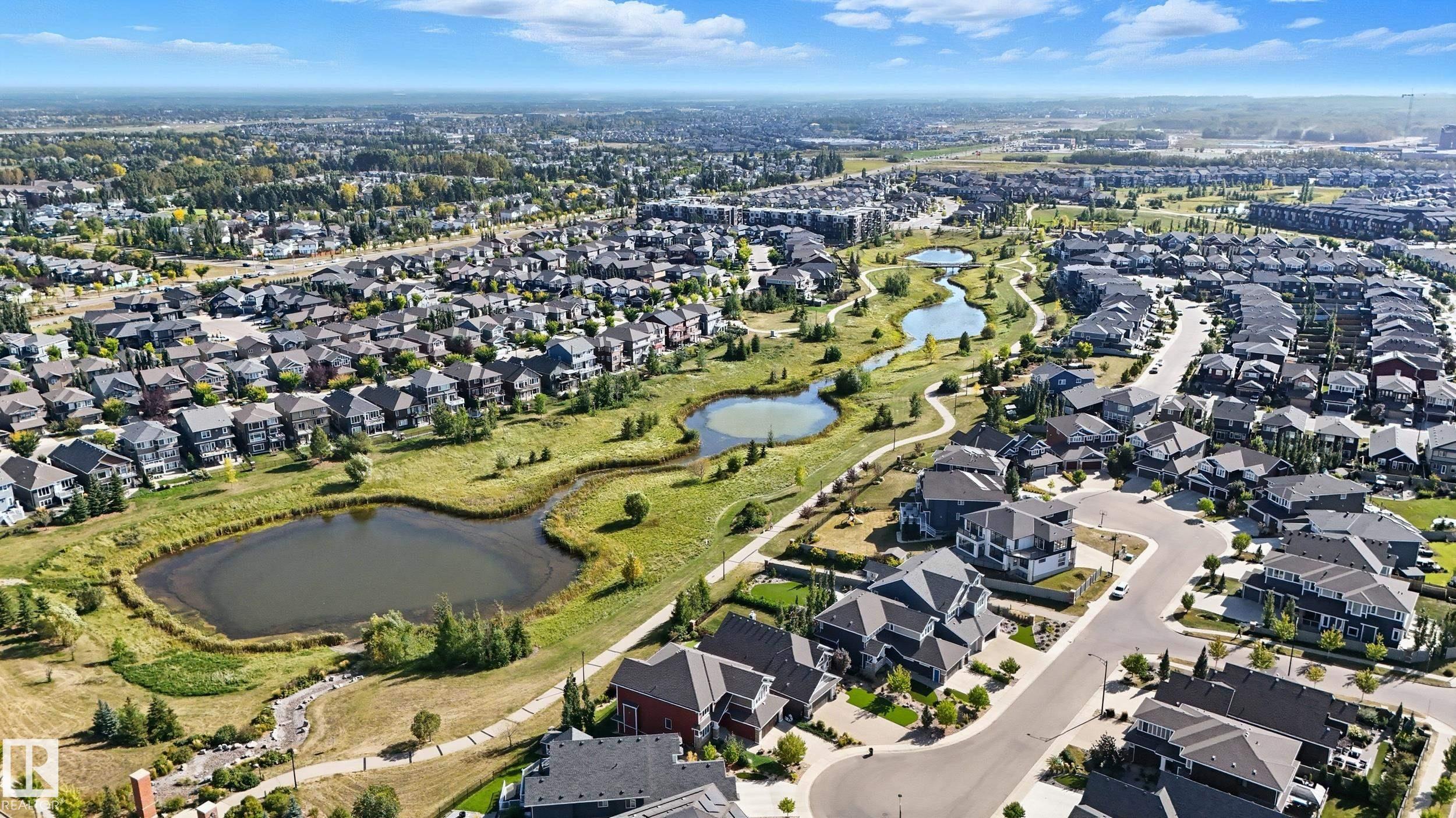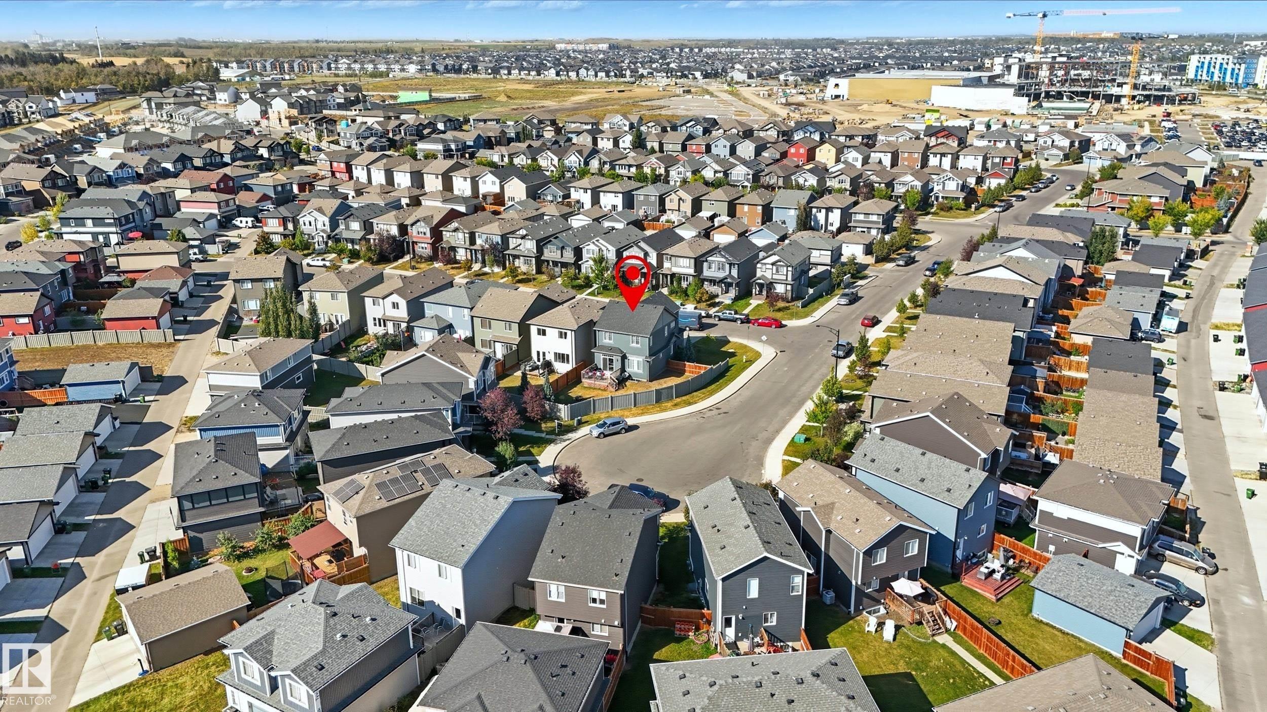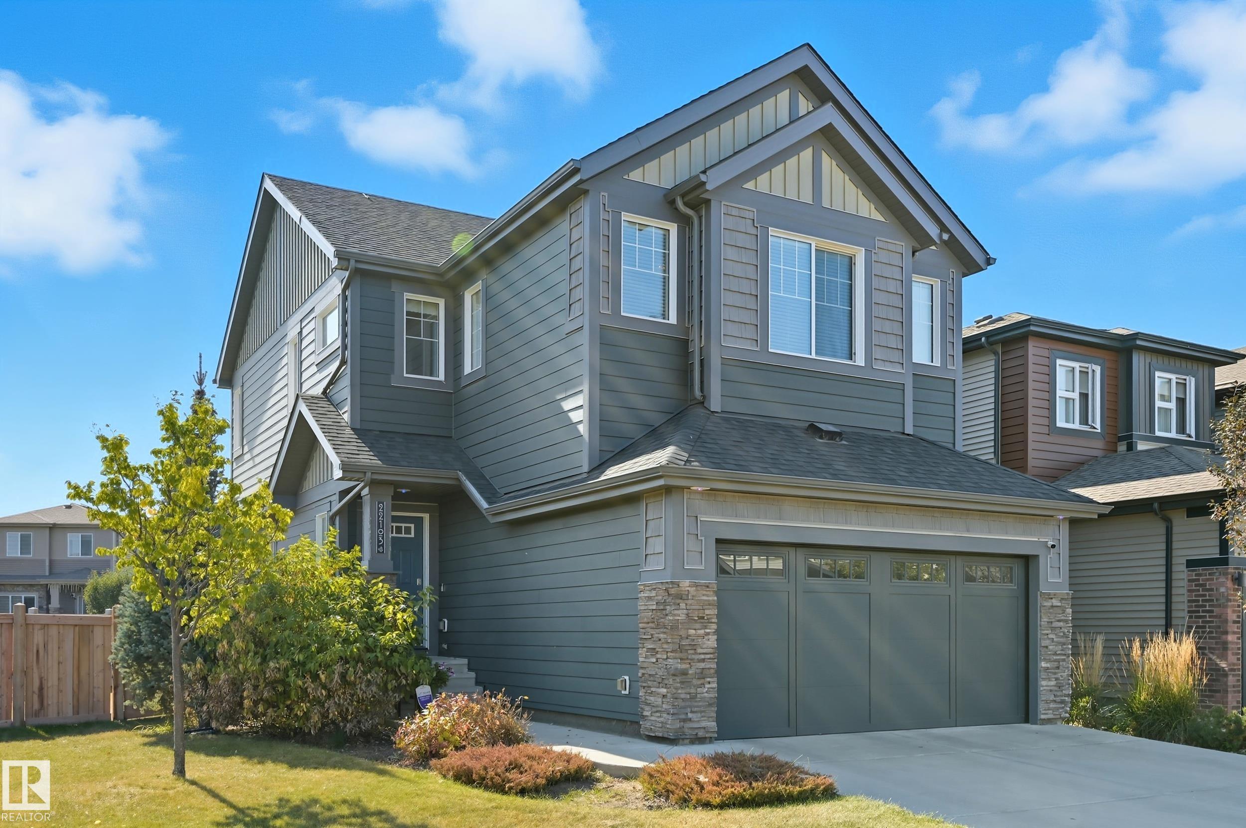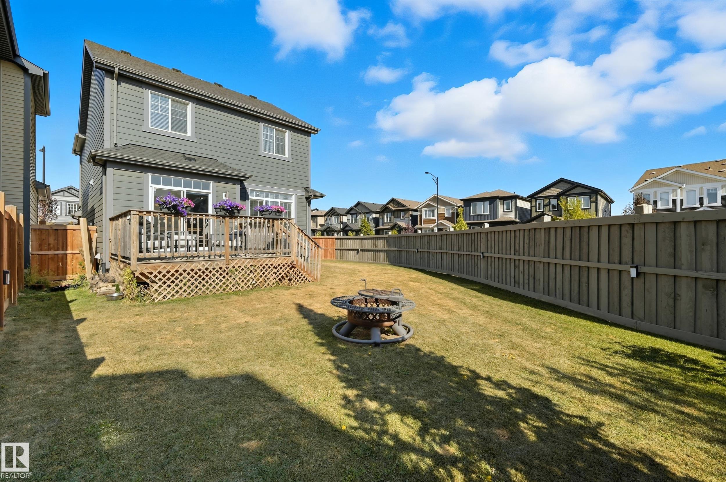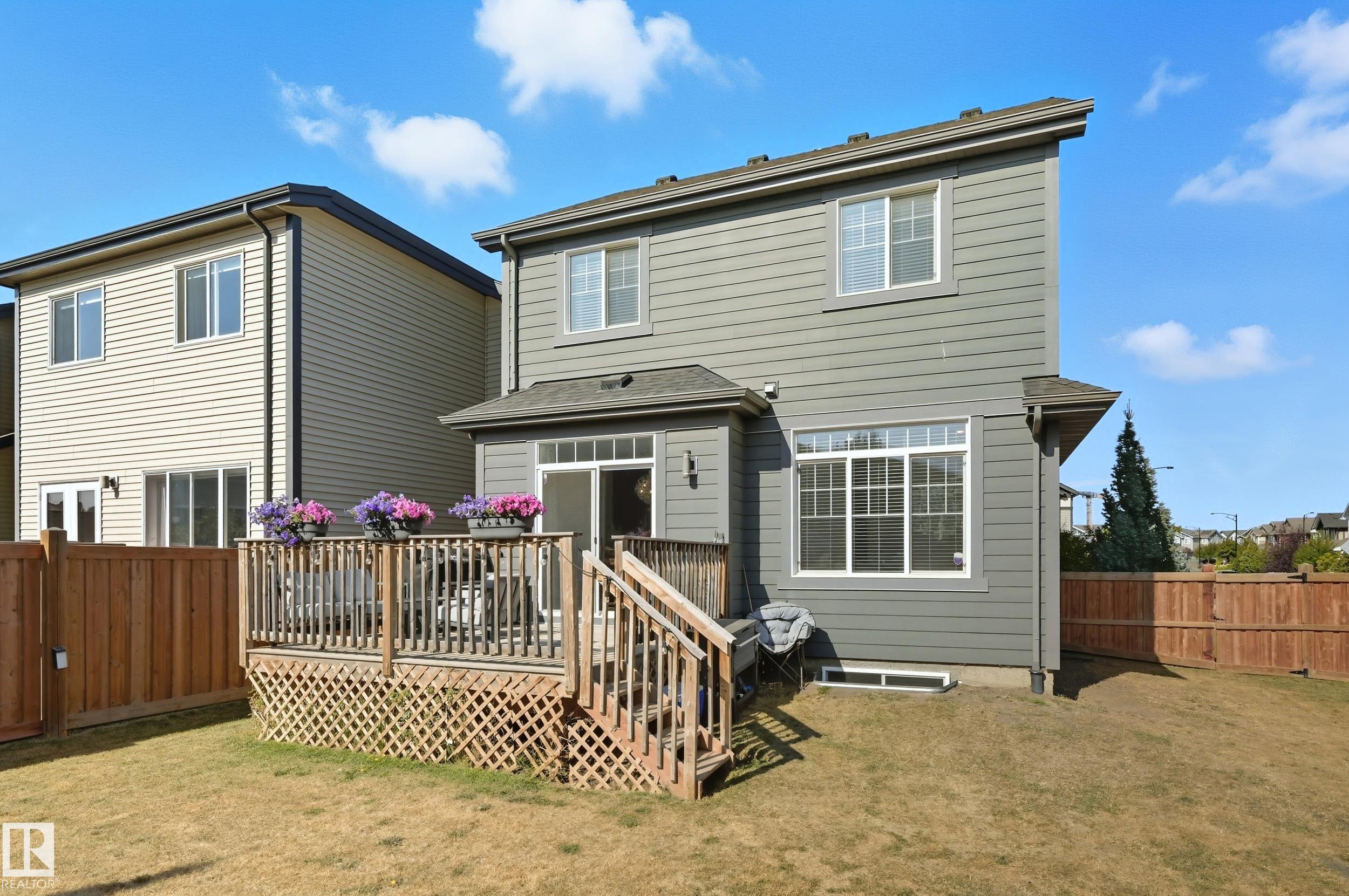 Former Showhome in Rosenthal! This High Efficiency 1586 Sq ft 2 storey, sits on a desirable corner lot in one of West Edmonton's most sought-after communities. Designed to impress, this spacious family home features high-end finishes, designer touches, and thoughtful upgrades throughout. The open-concept main floor offers a generous living area, large windows, and a stylish kitchen with stainless steel appliances, modern cabinetry, and a central working island - perfect for entertaining. Upstairs you'll find 3 sizeable bedrooms (1 could be a bonus room), including a primary suite with walk-in closet and a private 4 piece ensuite, plus the convenience of upstairs laundry. Enjoy year-round comfort with CENTRAL AC and appreciate the double attached garage with HEATED FLOORS -a rare luxury in Edmonton winters. The fully fenced yard, and landscaped lot with a back deck add function and curb appeal. Located close to schools, parks, golfing, and quick access to the Anthony Henday, this home is a must see!