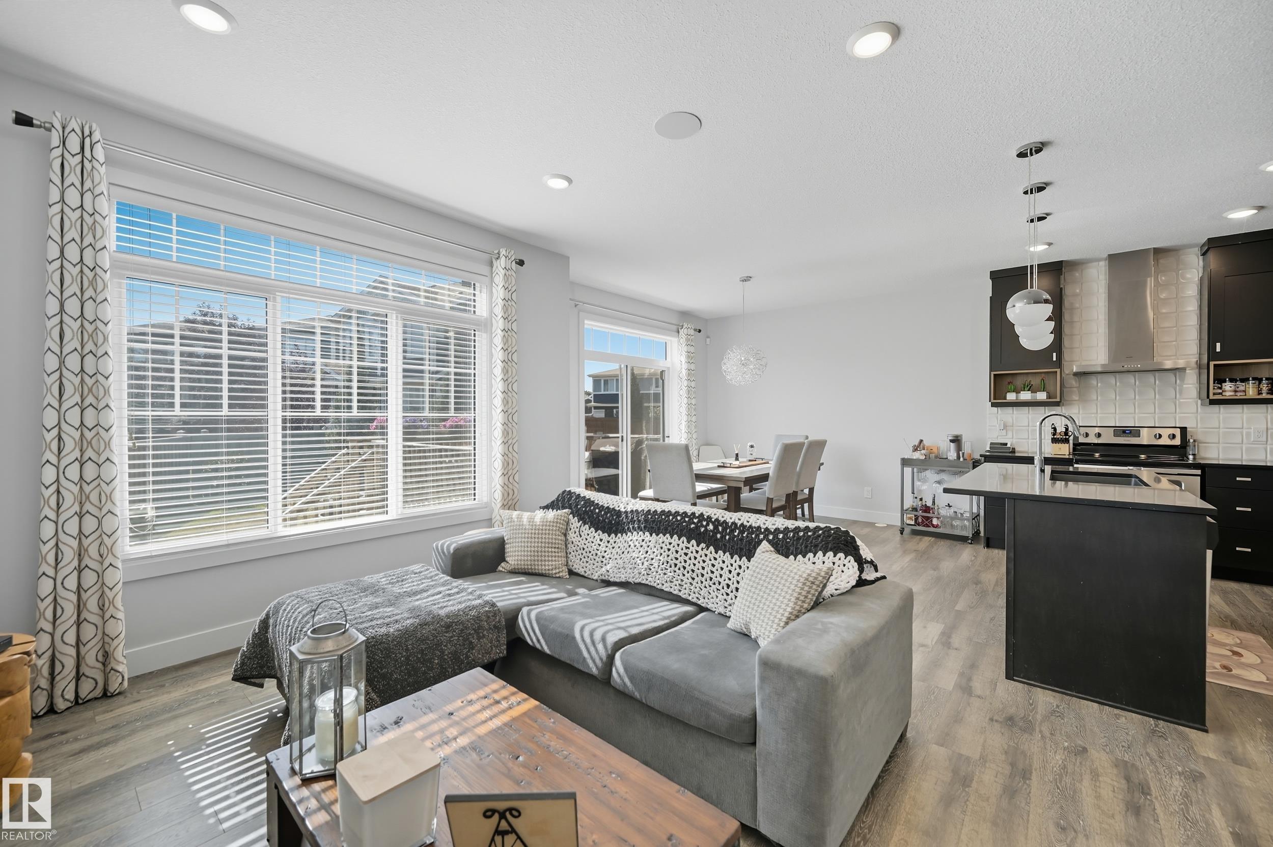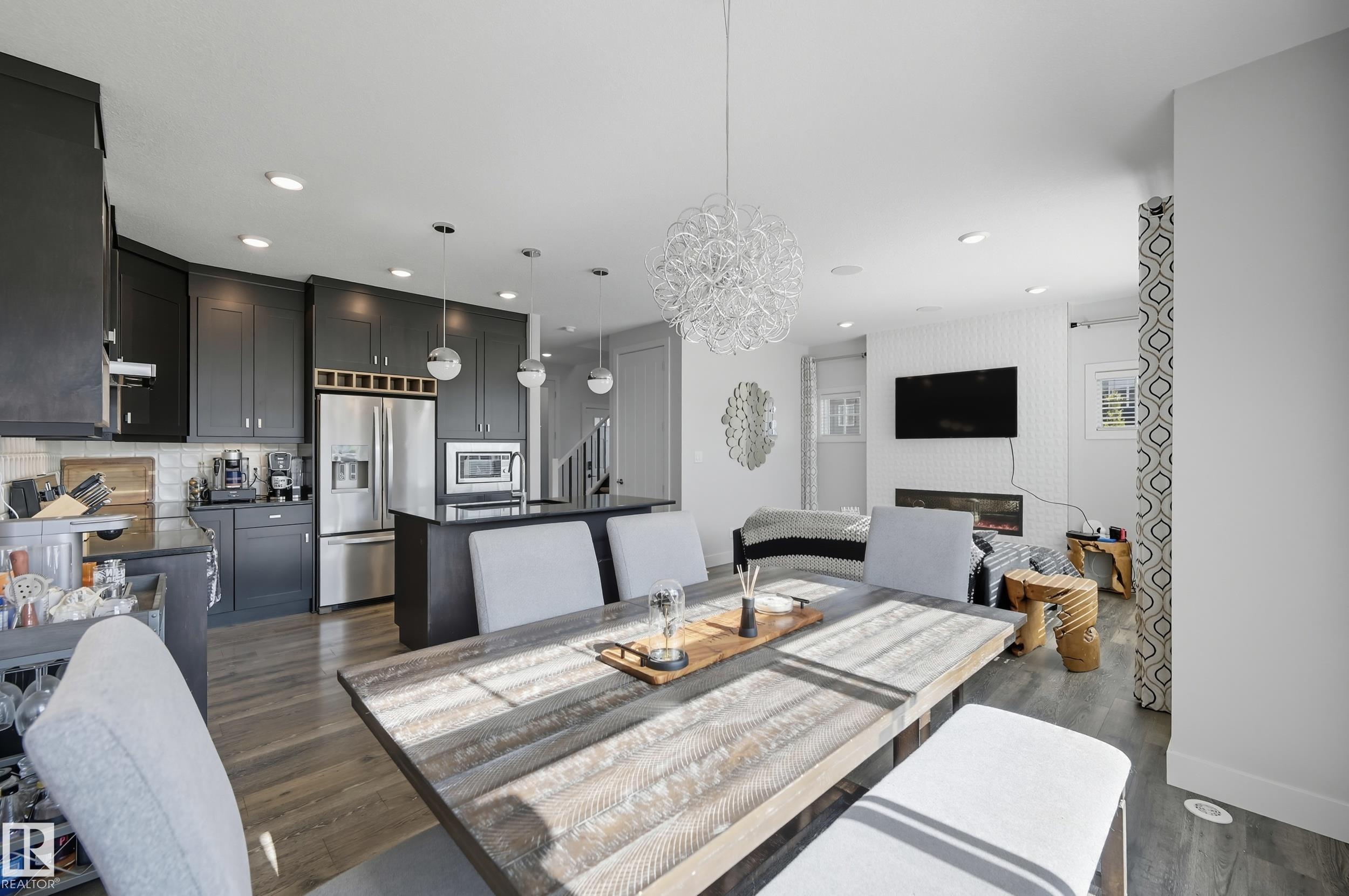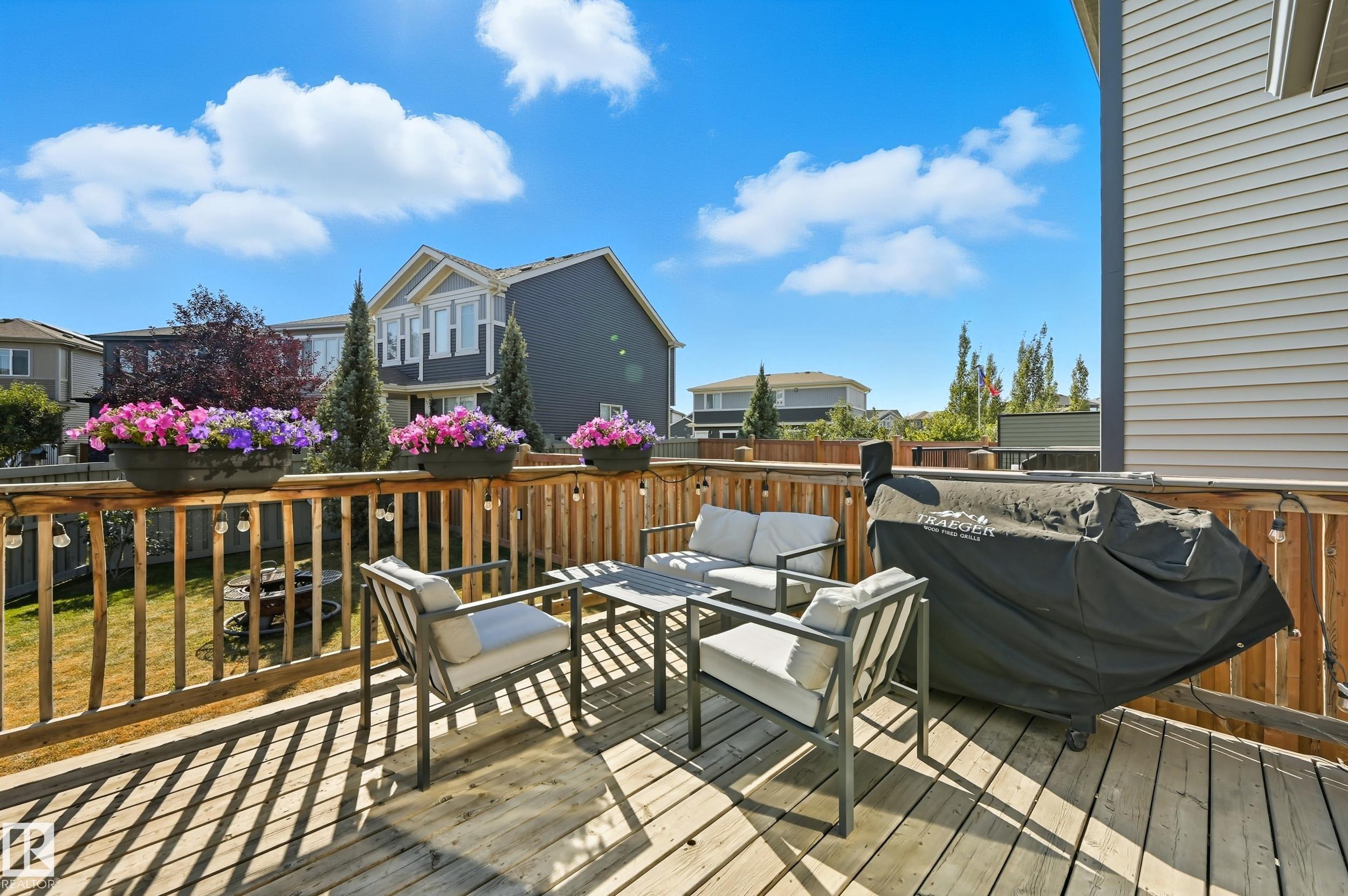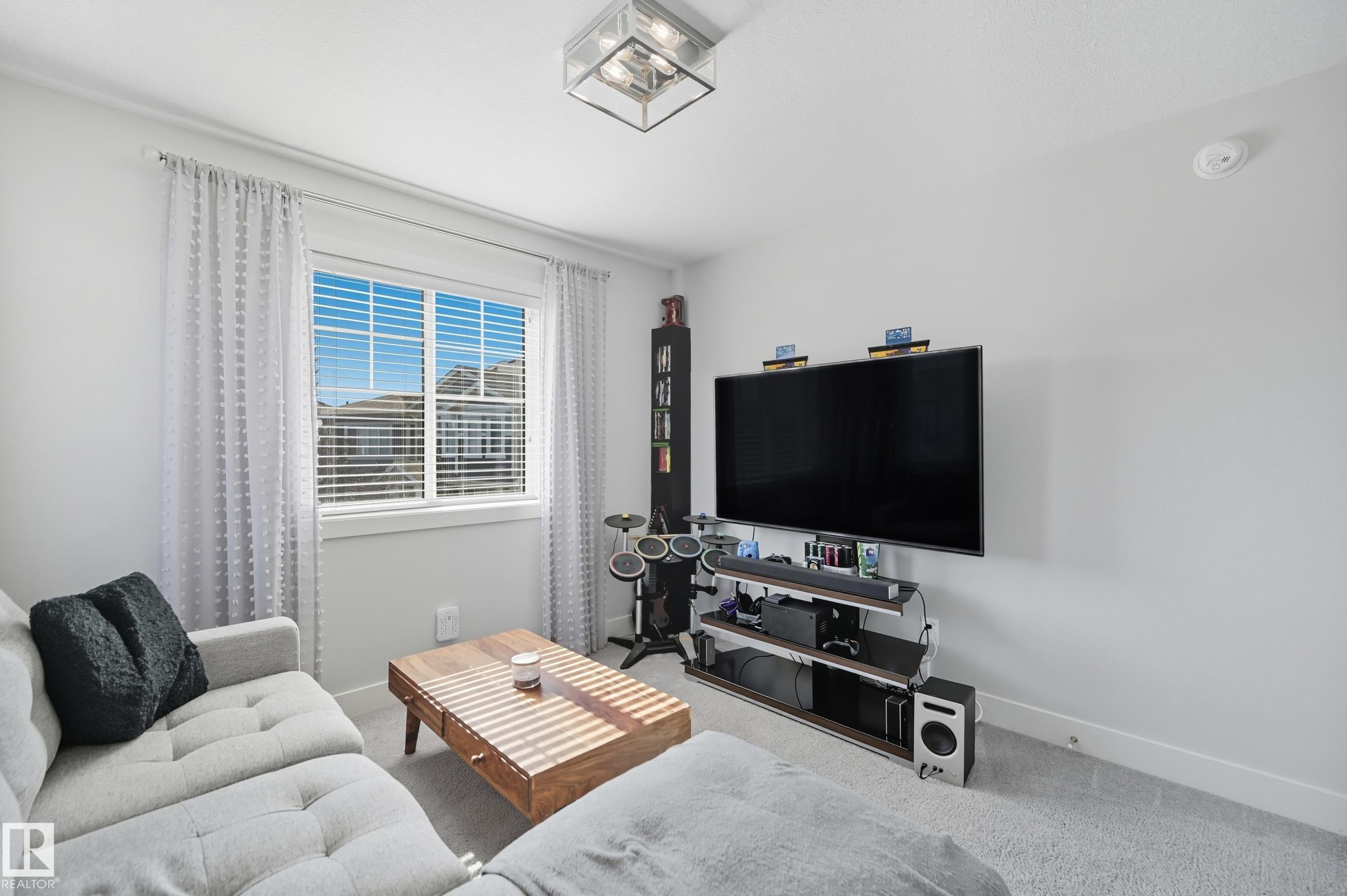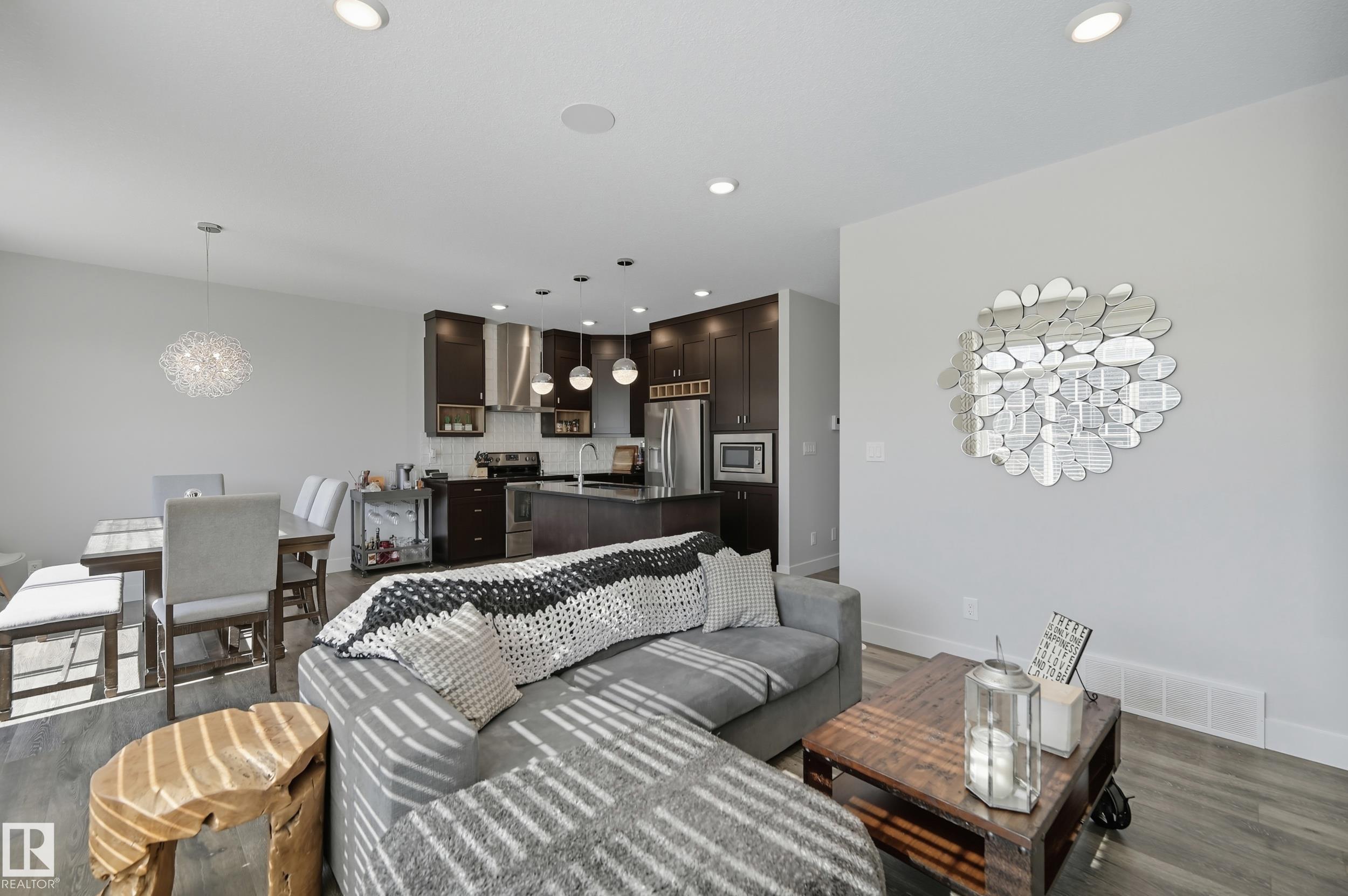 Former Showhome in Rosenthal! This High Efficiency 1586 Sq ft 2 storey, sits on a desirable corner lot in one of West Edmonton's most sought-after communities. Designed to impress, this spacious family home features high-end finishes, designer touches, and thoughtful upgrades throughout. The open-concept main floor offers a generous living area, large windows, and a stylish kitchen with stainless steel appliances, modern cabinetry, and a central working island - perfect for entertaining. Upstairs you'll find 3 sizeable bedrooms (1 could be a bonus room), including a primary suite with walk-in closet and a private 4 piece ensuite, plus the convenience of upstairs laundry. Enjoy year-round comfort with CENTRAL AC and appreciate the double attached garage with HEATED FLOORS -a rare luxury in Edmonton winters. The fully fenced yard, and landscaped lot with a back deck add function and curb appeal. Located close to schools, parks, golfing, and quick access to the Anthony Henday, this home is a must see!