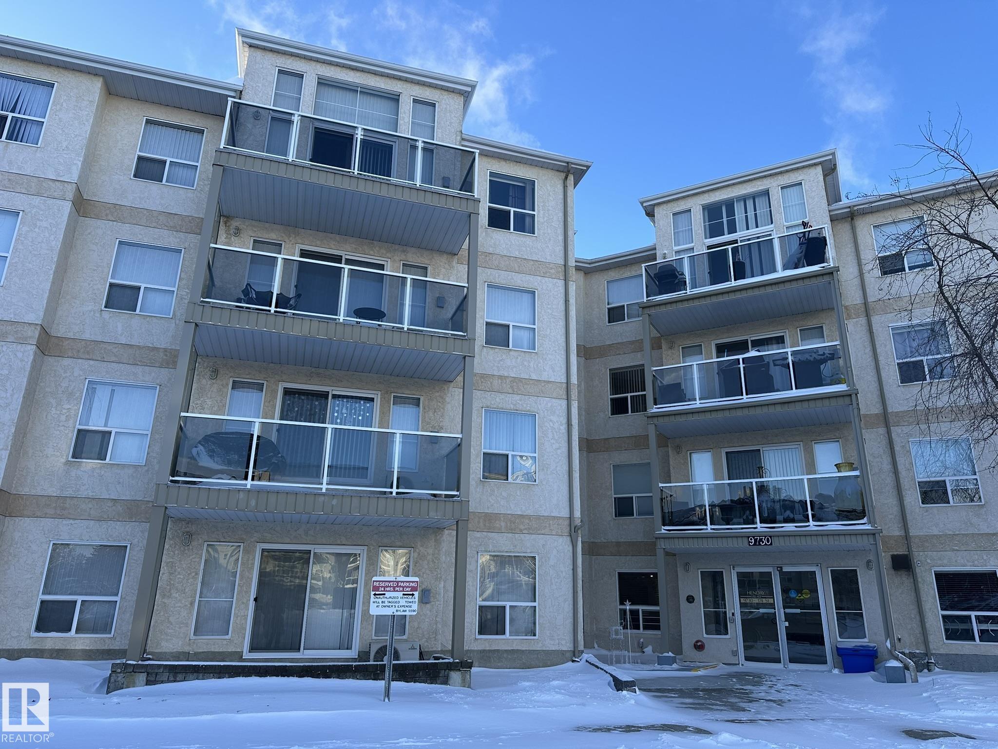 Welcome to Henday Village, offering adult 18+ living in the heart of West Edmonton. This bright and immaculate 2-bedroom, 2-bathroom unit features a well-designed open-concept layout with central AC. The spacious primary bedroom easily accommodates a king-sized bed and full furniture, and includes a private 4-piece ensuite. The second bedroom is also bright and generously sized, ideal for guests or a home office. The open kitchen offers a peninsula with breakfast bar, ample cabinetry, and open shelving. The laundry room, with newer 2024 washer & dryer is tucked behind a pocket door off the kitchen. The main 3-piece bathroom features a step-in shower and generous counter space. Amenities include a fitness room, rec room, car wash, ample visitor parking. Enjoy TITLED heated underground parking with storage locker, steps from the elevator! Conveniently located near West Edmonton Mall, transit, walking trails, and major roadways, this well-managed condo offers comfort, convenience, and an easy lifestyle