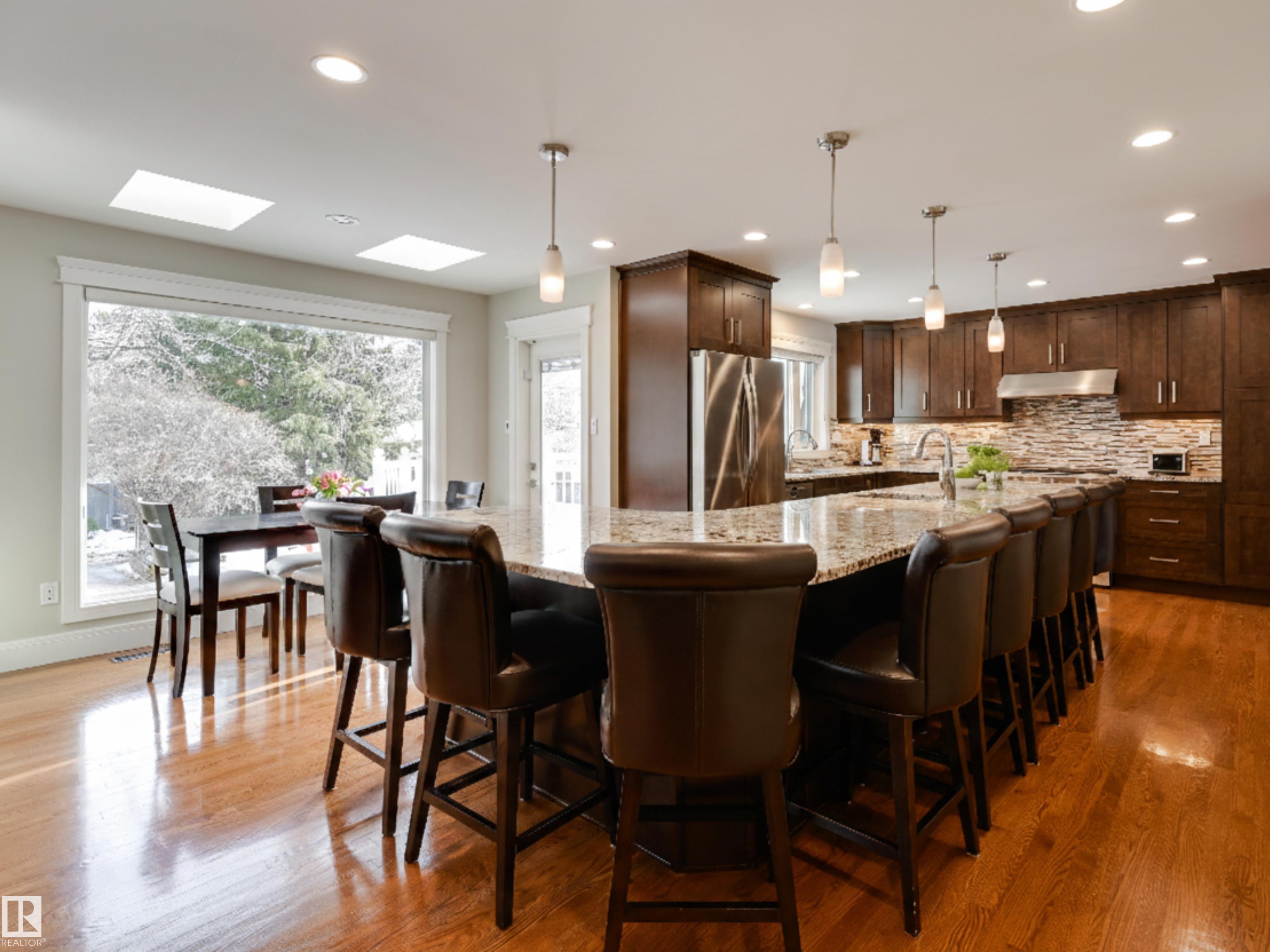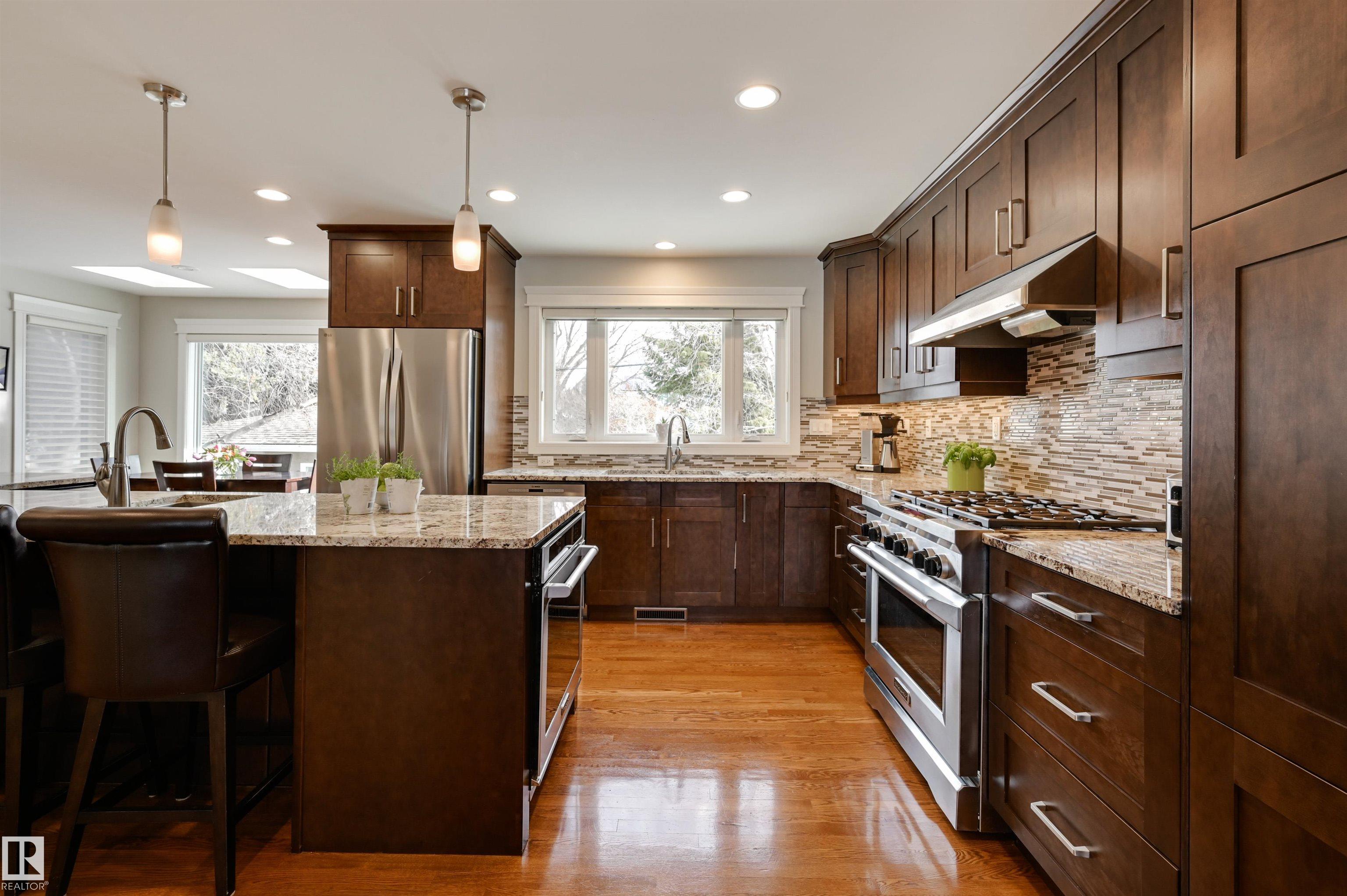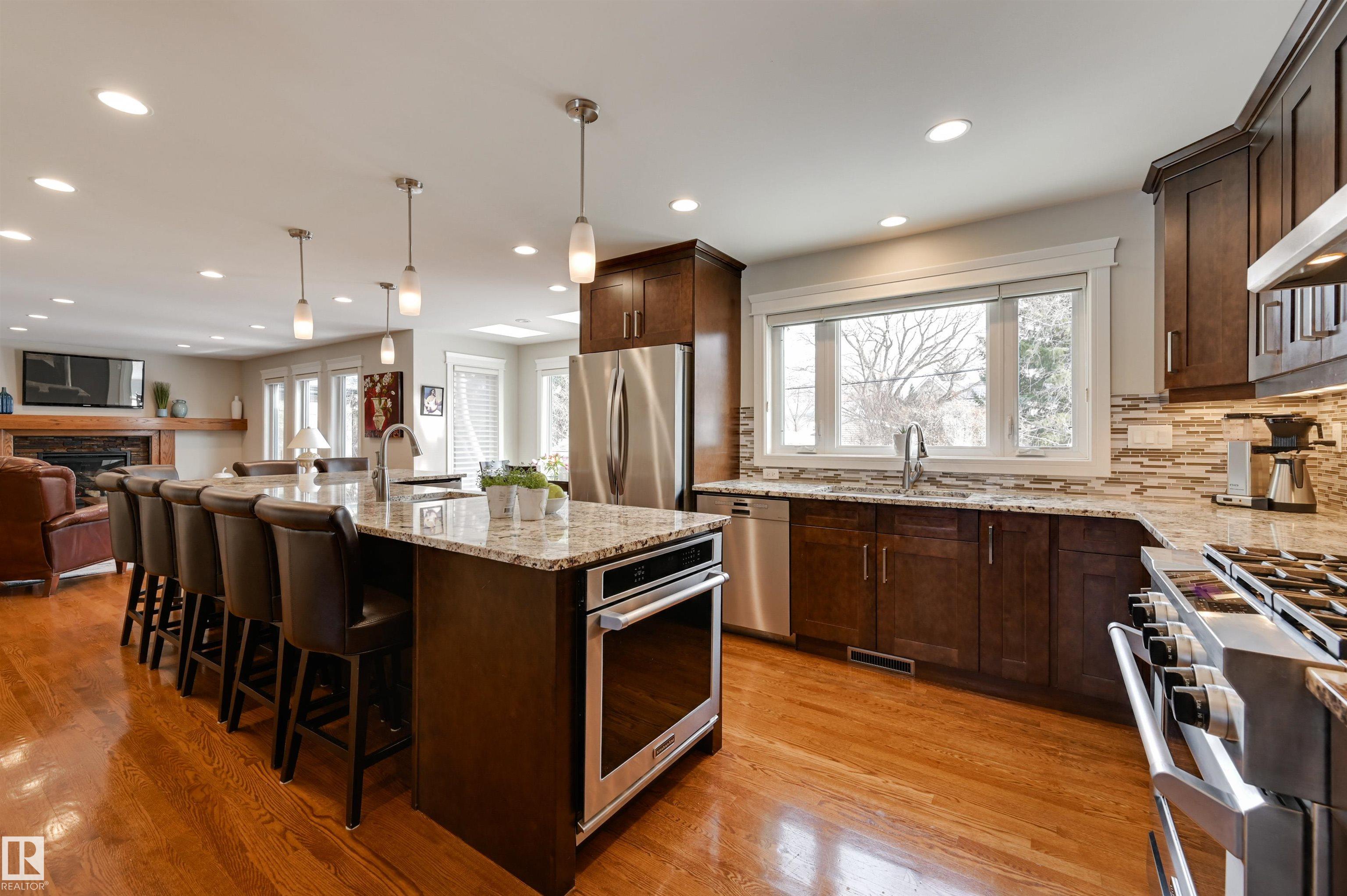 One of a kind in Westmount offering over 2,300 SF modernized by Aquarian Renovations. The kitchen features rich custom cabinetry, pantry, granite counters, tile backsplash, high-end appliances & a massive 13' L-shaped island ideal for hosting, adjacent to the breakfast nook with direct access to the deck and private backyard--perfect for kids to play. The main floor also offers a living room with fireplace, formal dining room, den & half bath. Upstairs you'll find a spacious primary retreat filled with natural light, complete with a spa-inspired ensuite showcasing a granite vanity, large soaker tub, and a glass walk-in shower, plus two additional oversized bedrooms & a 4 pc bath. The fully finished basement includes a large family room with stone fireplace, games area with wet bar, fitness space, 4th bedroom, 3-piece bath and storage. Hardwood floors, double attached garage plus the added bonus of a double detached garage! Walking distance to schools, shops, stores & more! Some photos virtually staged.