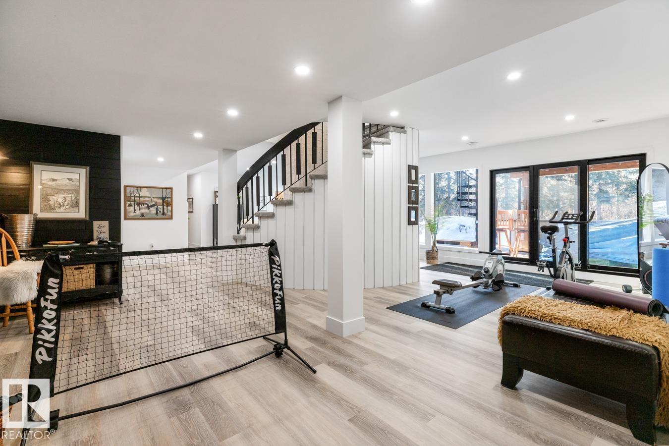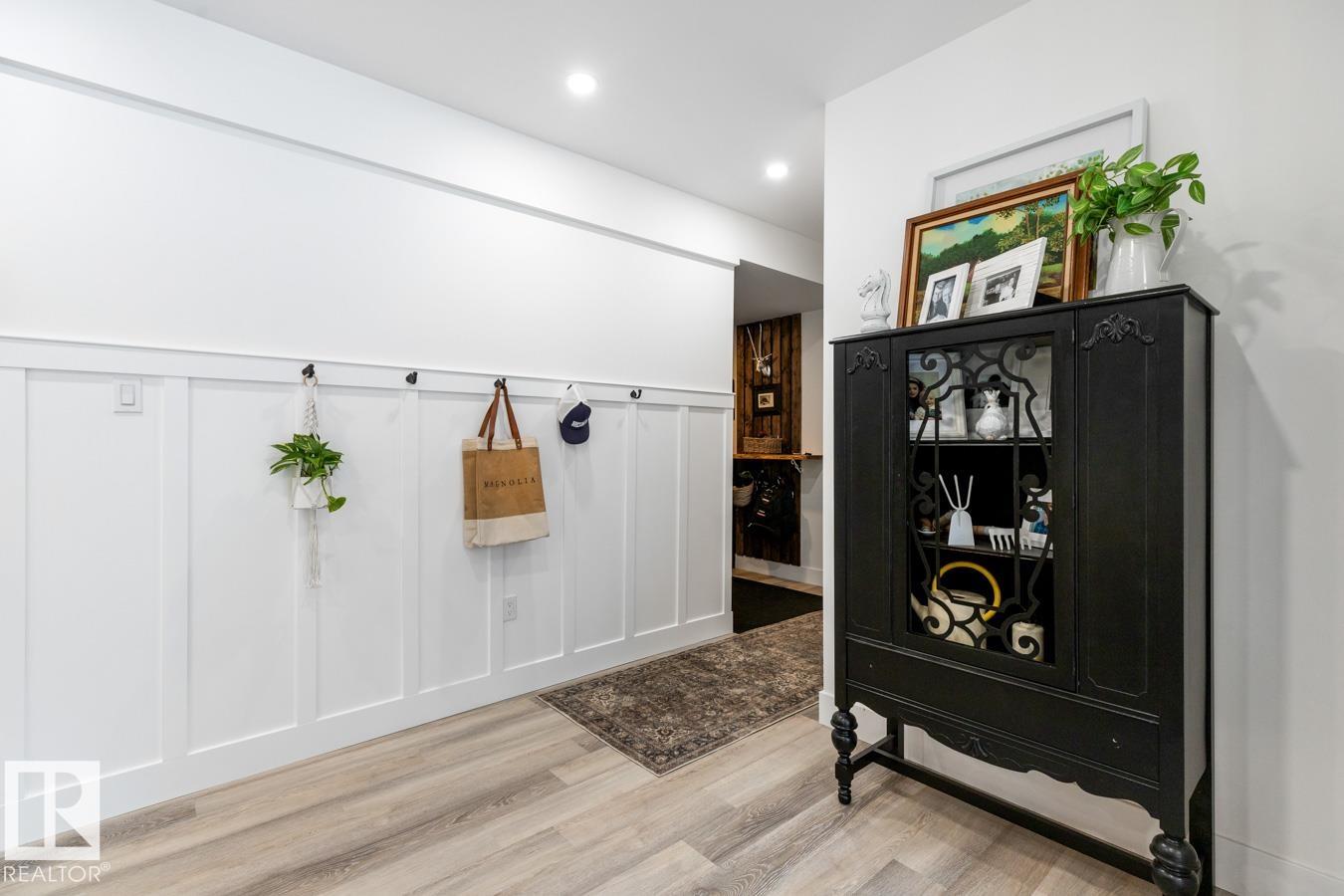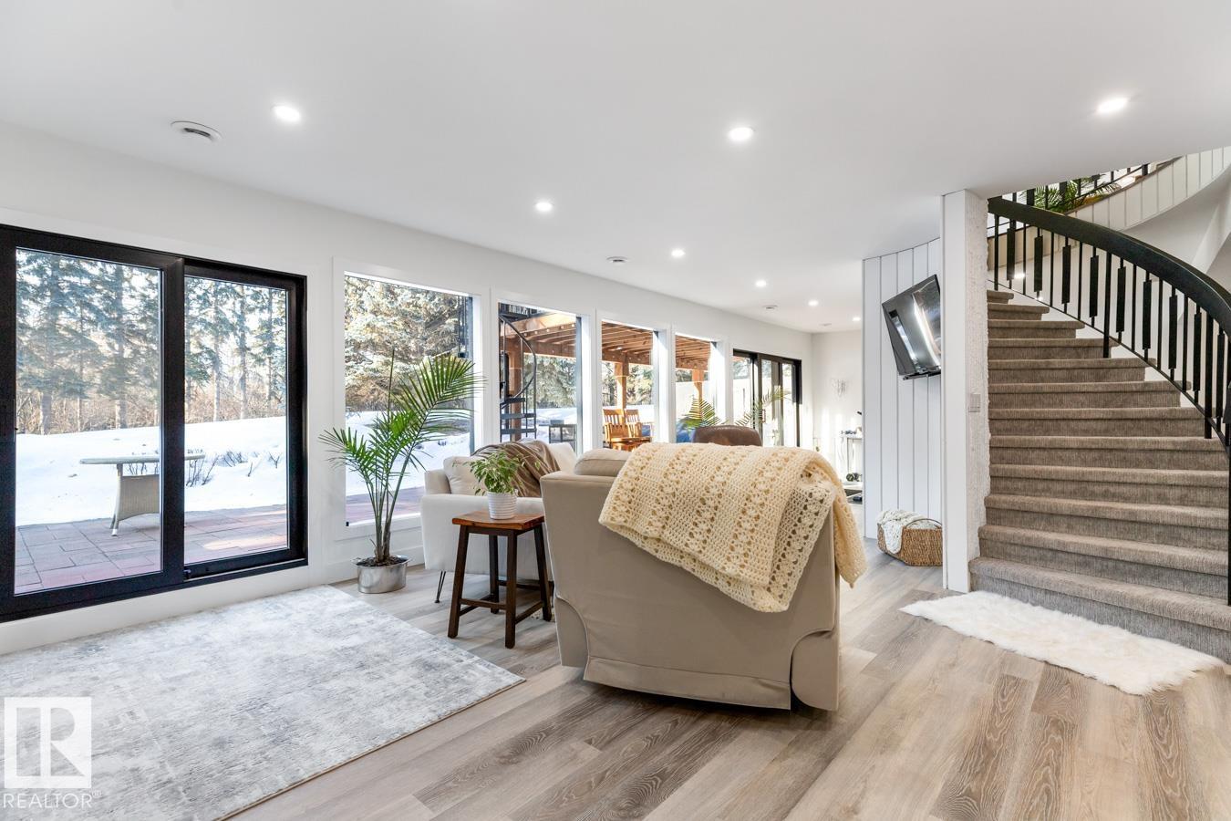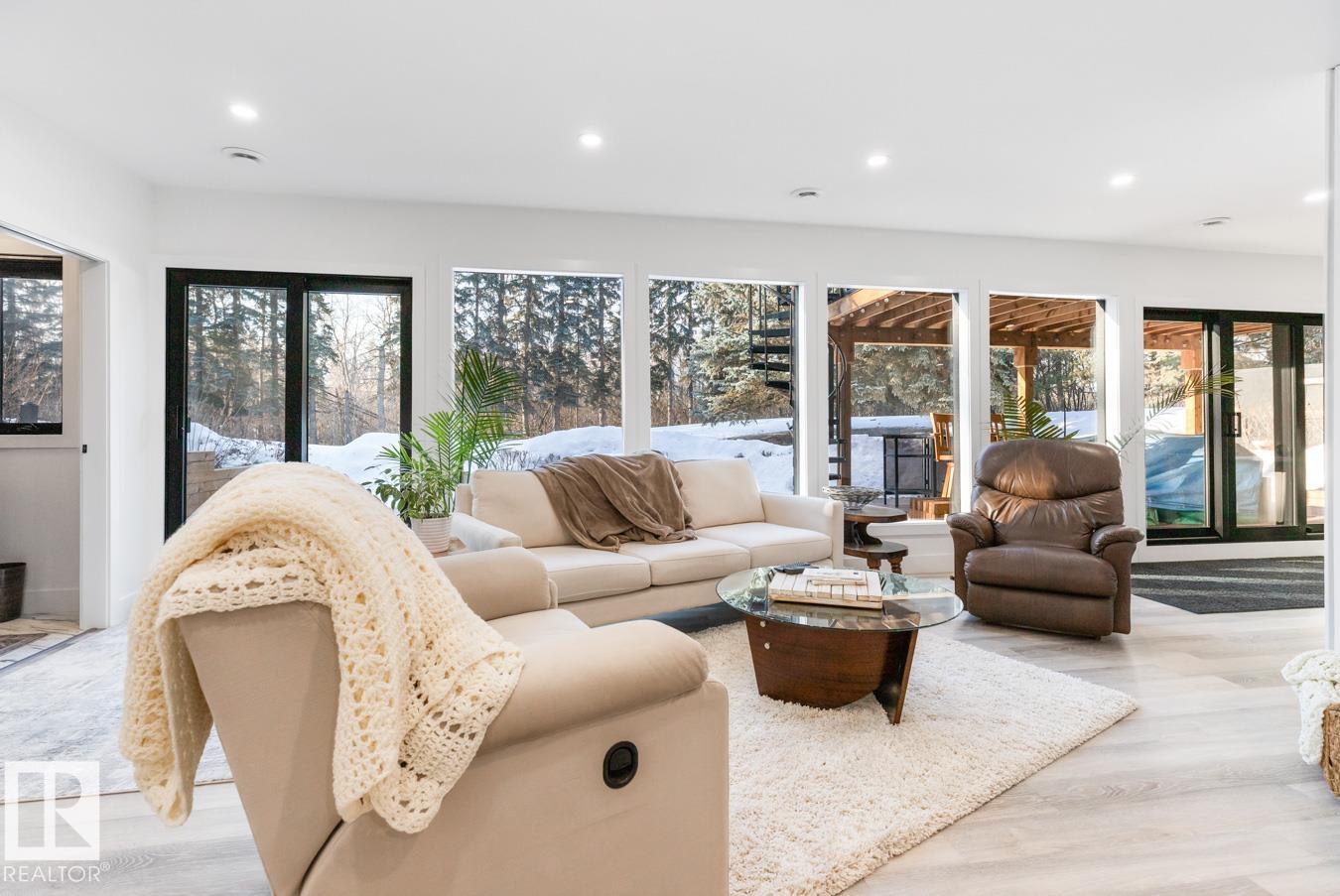 A rare offering in prestigious Campbeltown Heights, this extensively renovated luxury estate sits on 2.99 private acres just minutes from Sherwood Park. Showcasing 4 bedrooms & 4 baths, this home blends modern elegance with warm country charm. Vaulted ceilings, luxury vinyl plank flooring & a wall of windows fill the main level with natural light. The dream kitchen features white cabinetry, stainless steel appliances, dual pantries, a massive quartz island & cozy hearth room with fireplace. The dining room with built-in shelving is perfect for entertaining. Retreat to the king-sized primary suite with walk-in closet & spa-inspired ensuite. A second bedroom & 3pc bath complete the main level. The vintage circular staircase leads to the walkout basement with spacious family room, hidden speakeasy, 2 bedrooms (one with ensuite), den, flex space & sauna. Enjoy the spectacular south yard & deck. City water & sewer. Where luxury, comfort & nature come together, this is acreage living at its finest.
