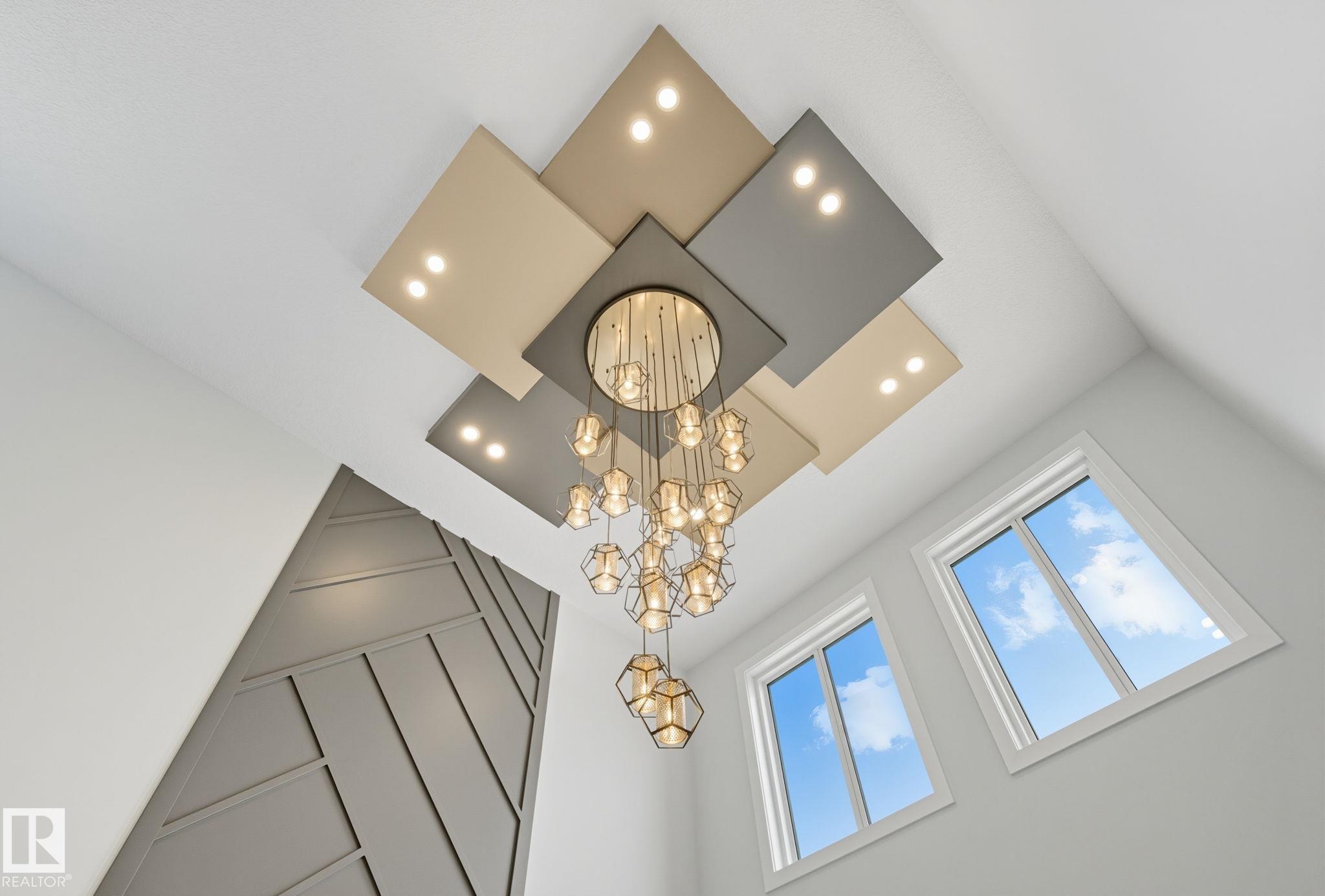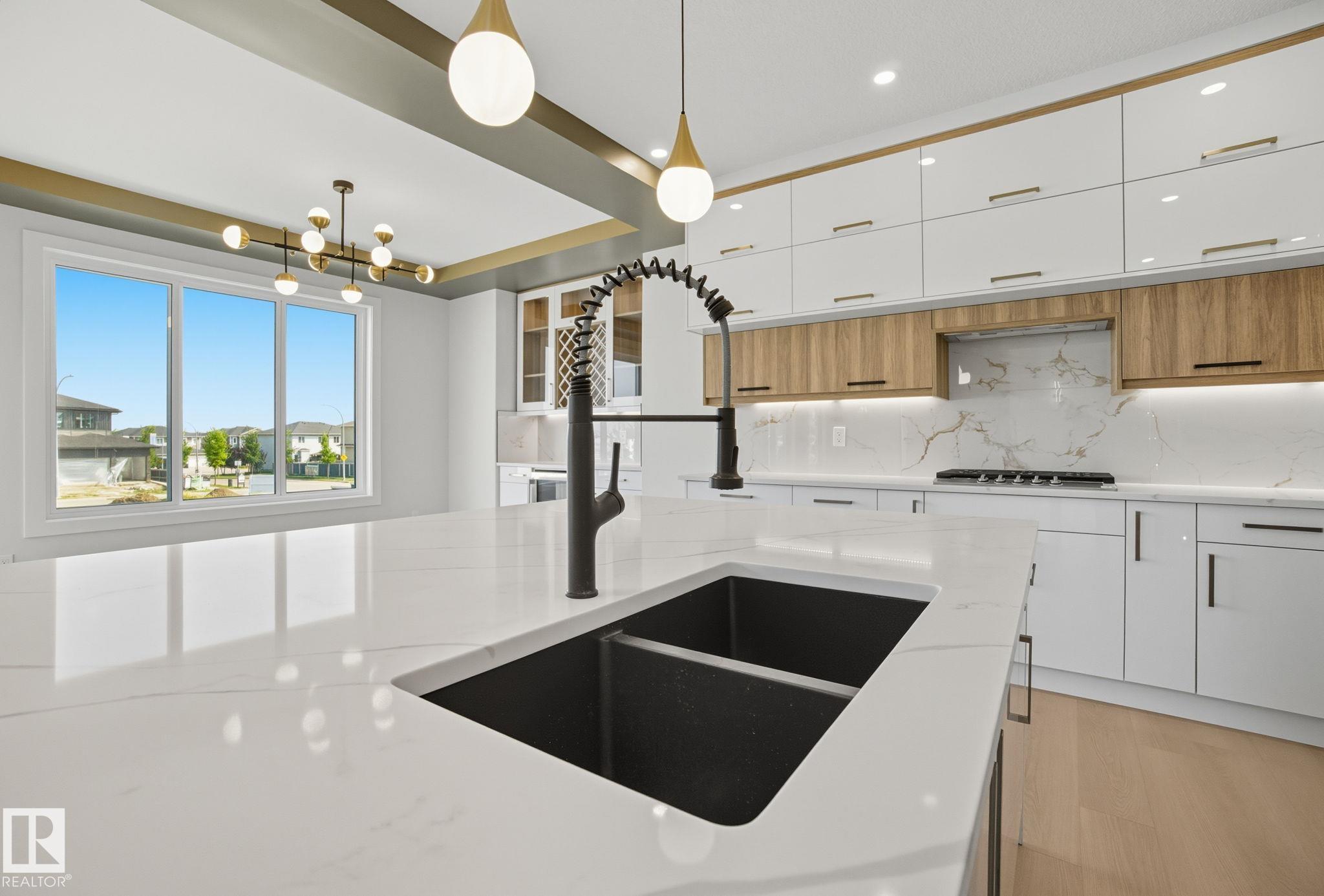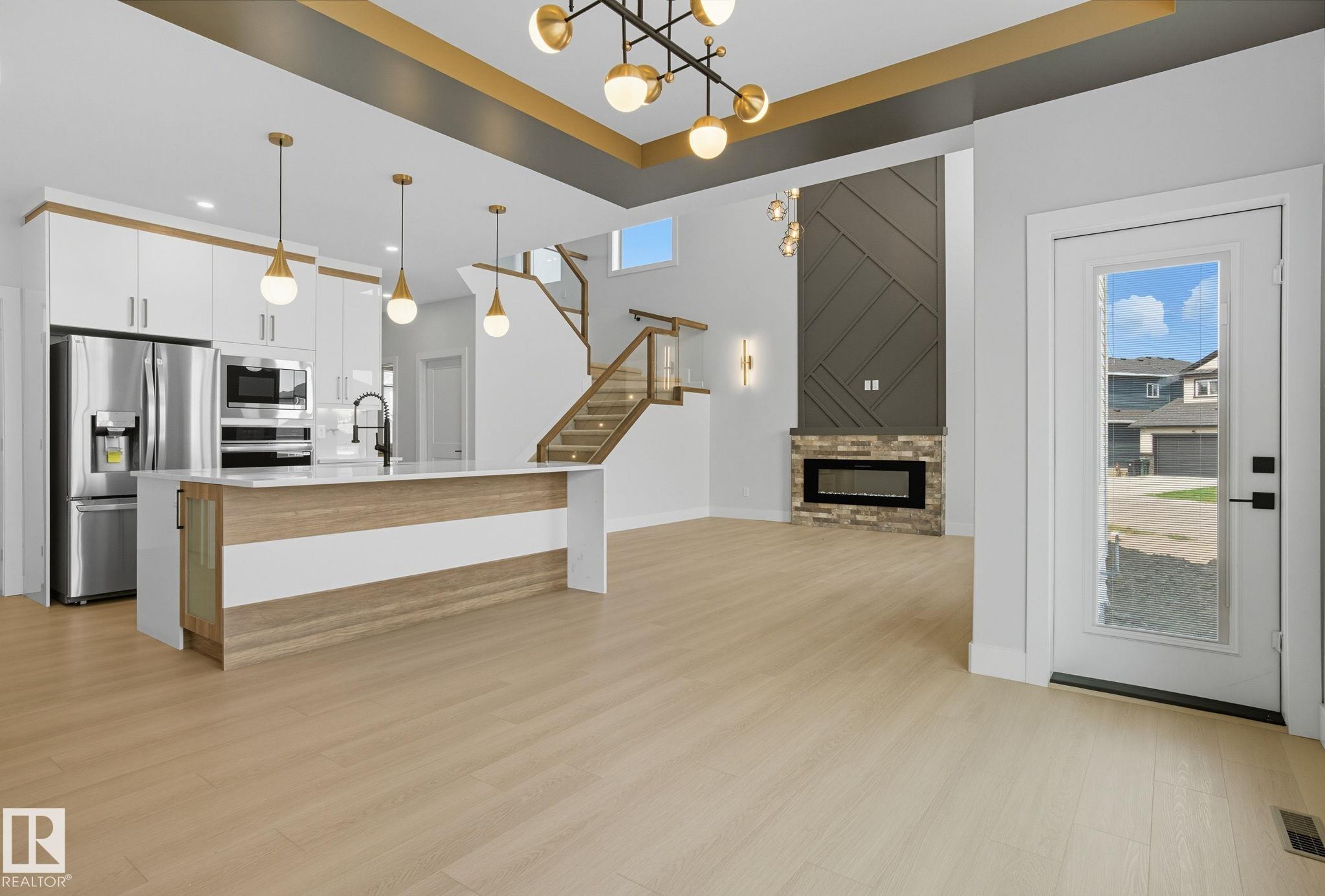 Built by Sunnyview Homes. 4 bedrooms and 3 full bathrooms. TRIPLE car garage w/huge driveway. This stunning home offers a main floor bedroom and full bathroom. The spacious open to below great room features a beautiful accent wall with electric fireplace. The upgraded kitchen boasts sleek ceiling height cabinetry, a walkthrough pantry and a nook with a built-in beverage station. The mudroom offers double coat closets w/a built in bench. A glass railing staircase with maple handrail and step lighting leads to the upper level central bonus room. The primary suite showcases a coffered ceiling and barn door entry to a spa like en-suite with double vanity, jacuzzi, custom glass-enclosed shower, and a WIC with MDF shelving. 2 additional bedrooms share a 4-piece bathroom. Finished with modern upgrades and quality craftsmanship throughout. Features, 3 gas lines, quartz, designer lighting pkg, plush carpet, accent walls, garage w/drain and hot/cold water lines. SEPARATE side entrance to the basement.