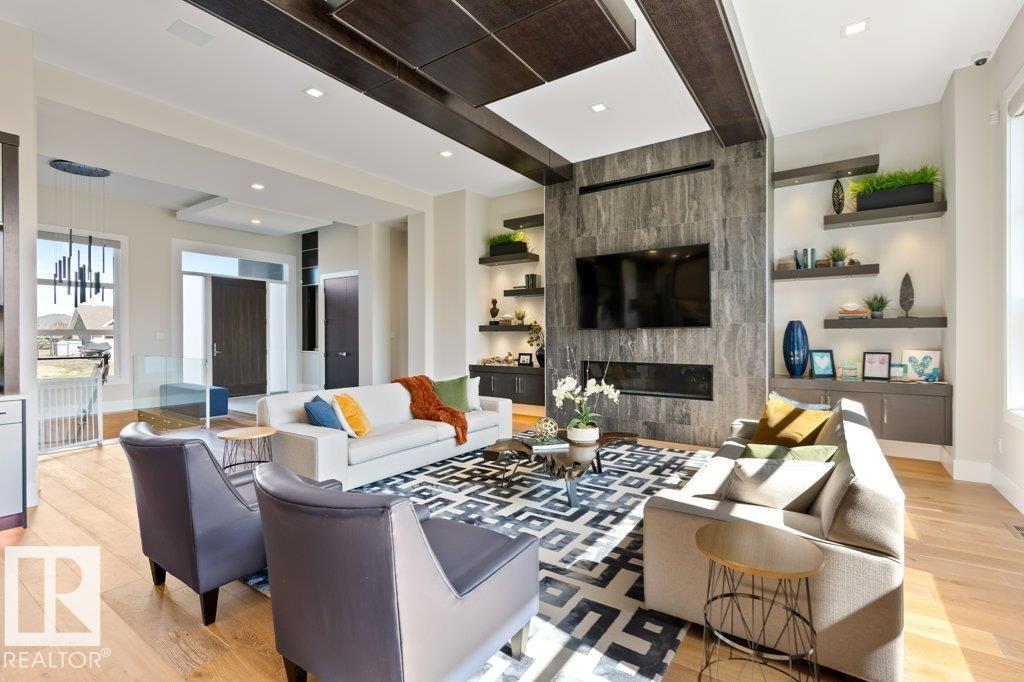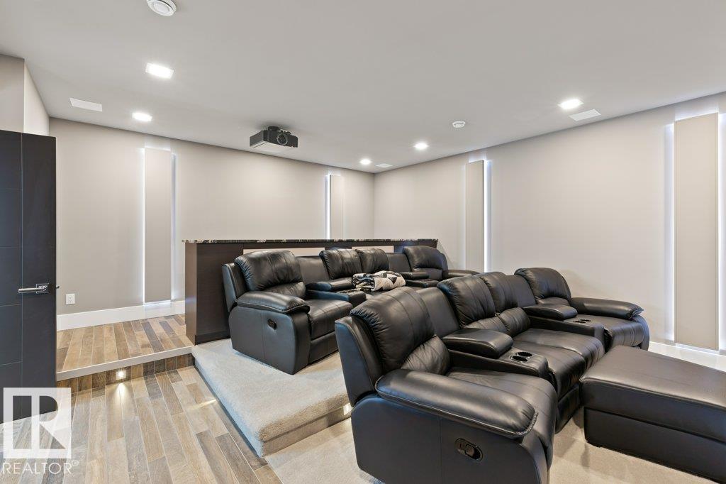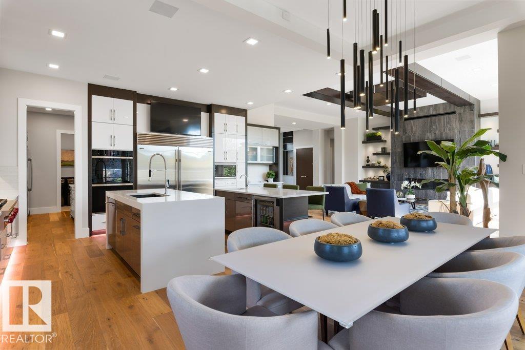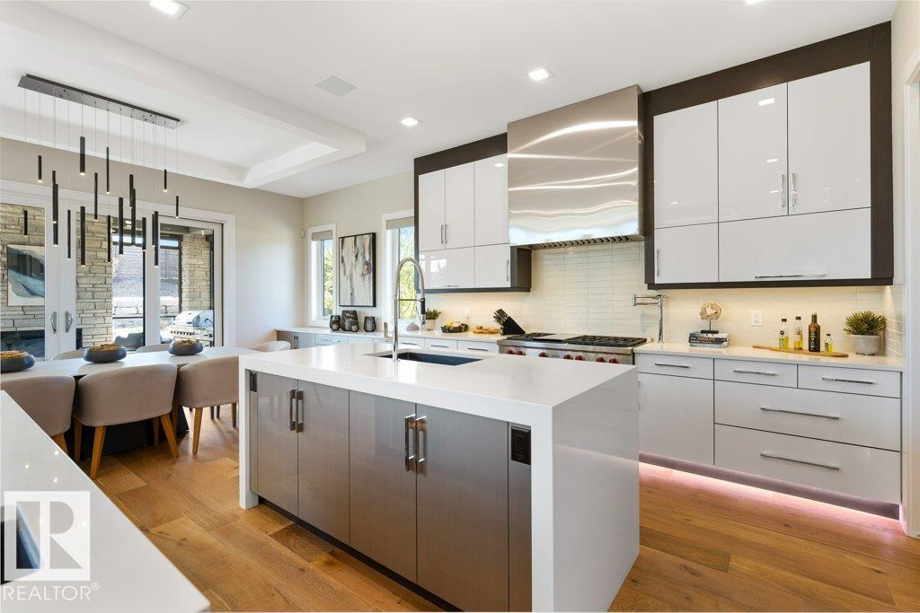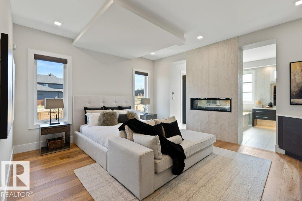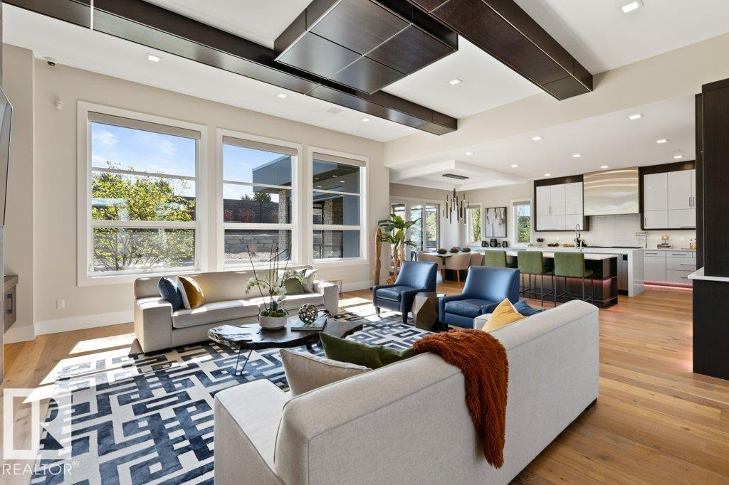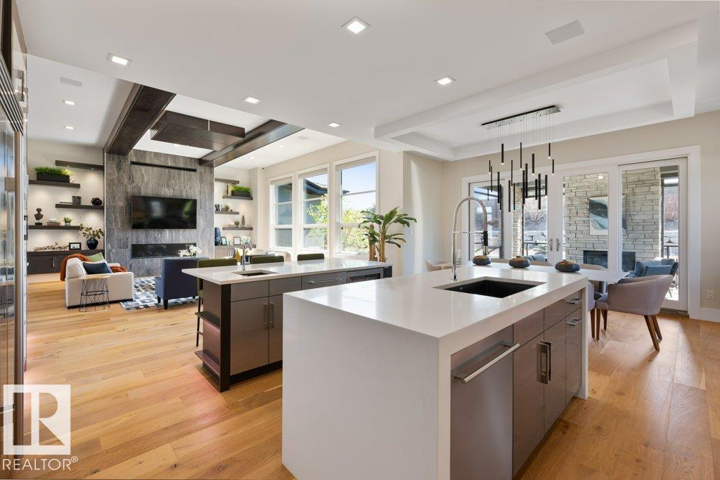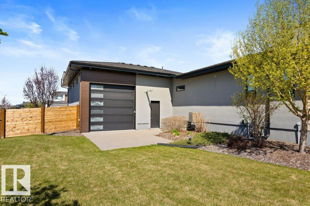 BREATHTAKING SHOWHOME in River's Gate - Sturgeon County's Only Gated Estate Community! This stunning great-room bungalow by Henderson Quality Building offers over 5000 SQFT of luxurious living space with a barrier-free layout & a 1600 SQFT 6-car garage with RV entrance. Features include custom millwork throughout, sun-drenched great room with stunning floor to ceiling feature fireplace, chef inspired kitchen with double quartz islands, floor-to-ceiling built-ins, Wolf & Sub-Zero appliances, & a butler's pantry. Includes 5 bedrooms: a resort-style primary suite with 2-sided fireplace & SPA INSPIRED EN-SUITE , main floor guest room with en-suite, lower bedrooms with Jack & Jill bathroom. Basement boasts glass stairwell, theater room with 12-ft screen, tiered seating, wet bars, games room, & more. Outside features $200K in serenity landscaping package, covered BBQ center, EV charger, motorized blinds, smart home automation, & 9-camera security. Unmatched quality, design, and elegance! In a word SPECTACULAR
