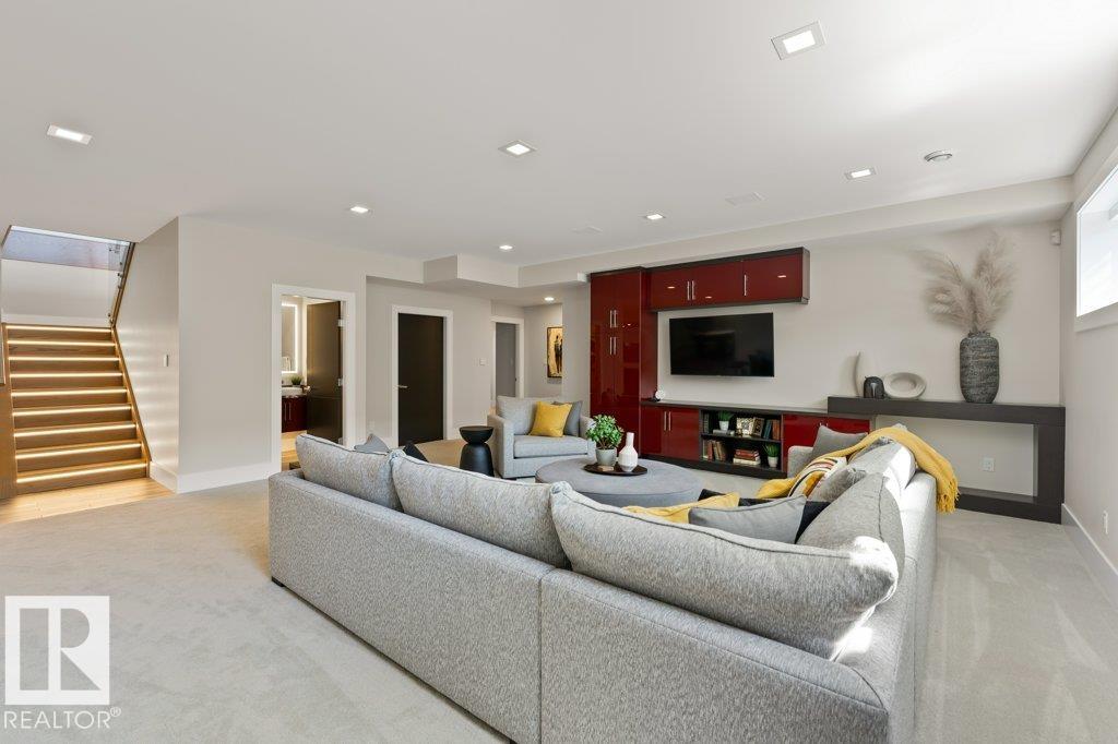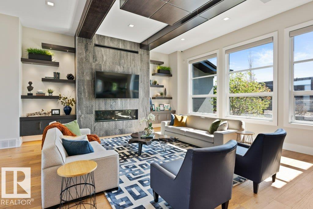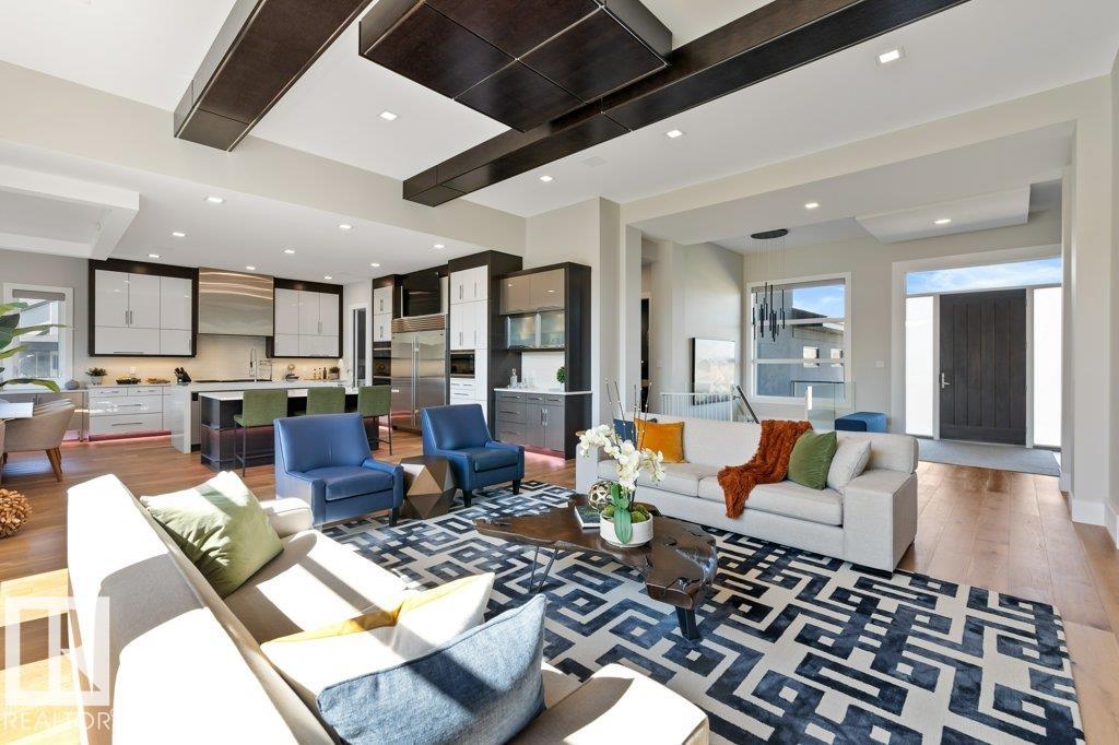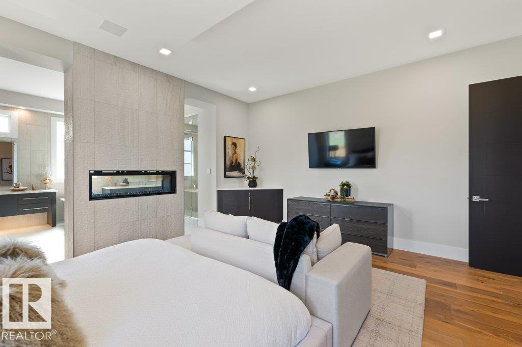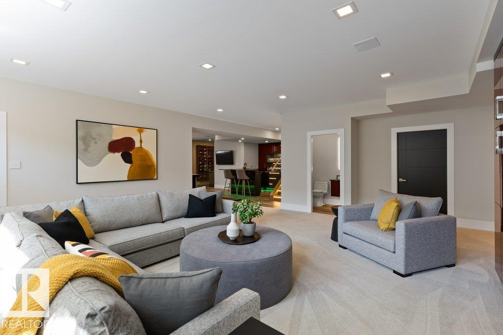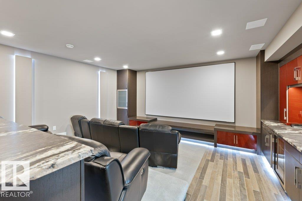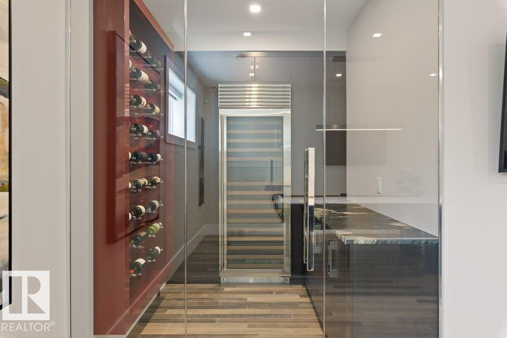 BREATHTAKING SHOWHOME in River's Gate - Sturgeon County's Only Gated Estate Community! This stunning great-room bungalow by Henderson Quality Building offers over 5000 SQFT of luxurious living space with a barrier-free layout & a 1600 SQFT 6-car garage with RV entrance. Features include custom millwork throughout, sun-drenched great room with stunning floor to ceiling feature fireplace, chef inspired kitchen with double quartz islands, floor-to-ceiling built-ins, Wolf & Sub-Zero appliances, & a butler's pantry. Includes 5 bedrooms: a resort-style primary suite with 2-sided fireplace & SPA INSPIRED EN-SUITE , main floor guest room with en-suite, lower bedrooms with Jack & Jill bathroom. Basement boasts glass stairwell, theater room with 12-ft screen, tiered seating, wet bars, games room, & more. Outside features $200K in serenity landscaping package, covered BBQ center, EV charger, motorized blinds, smart home automation, & 9-camera security. Unmatched quality, design, and elegance! In a word SPECTACULAR