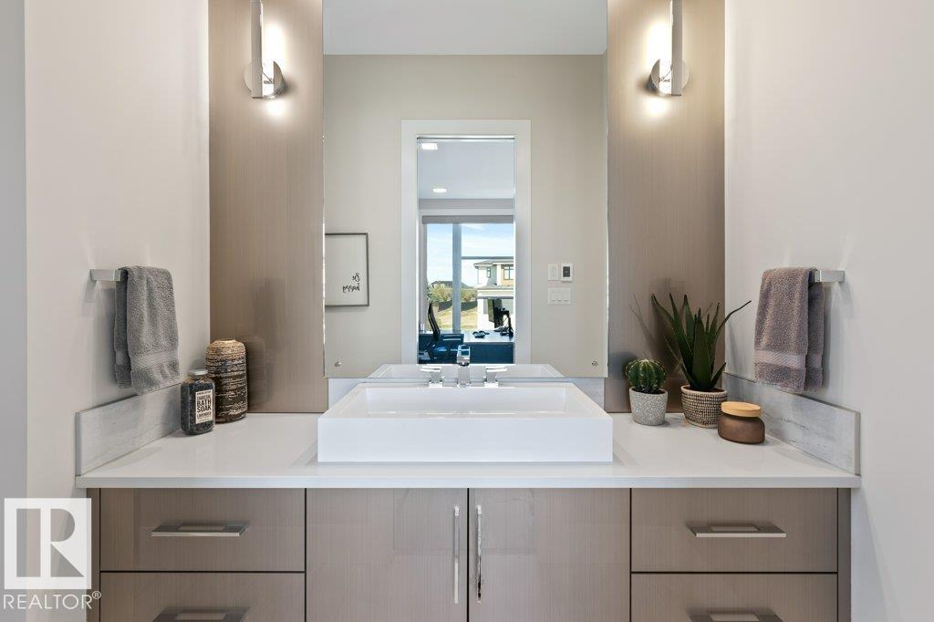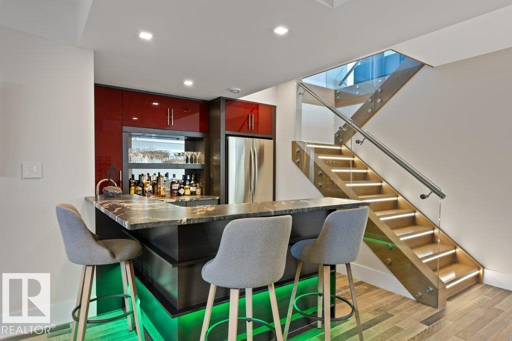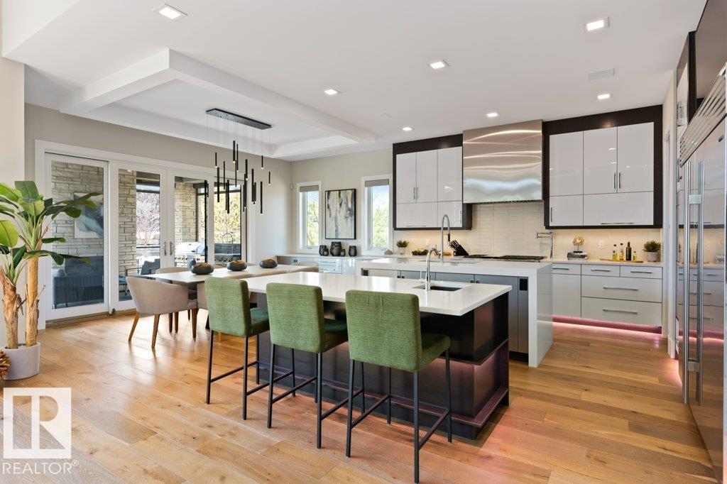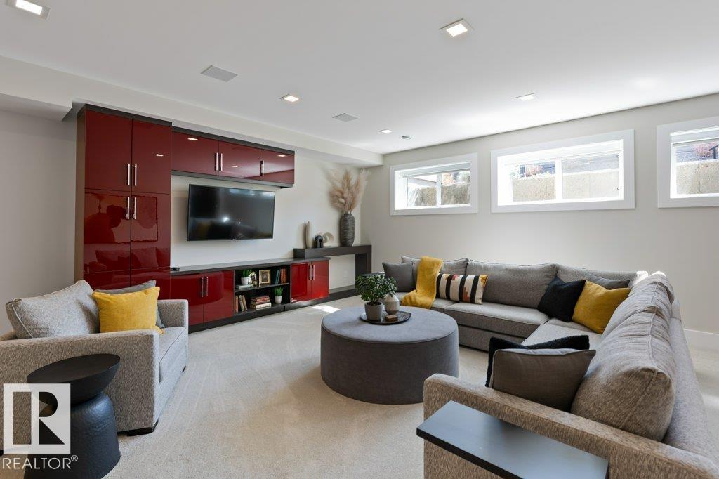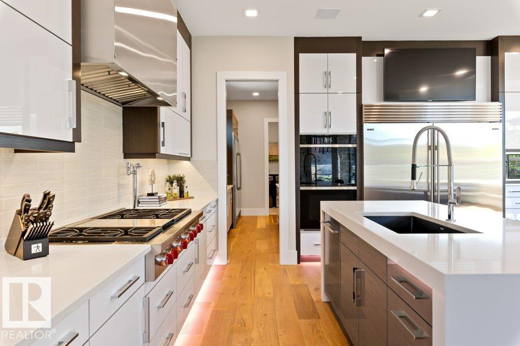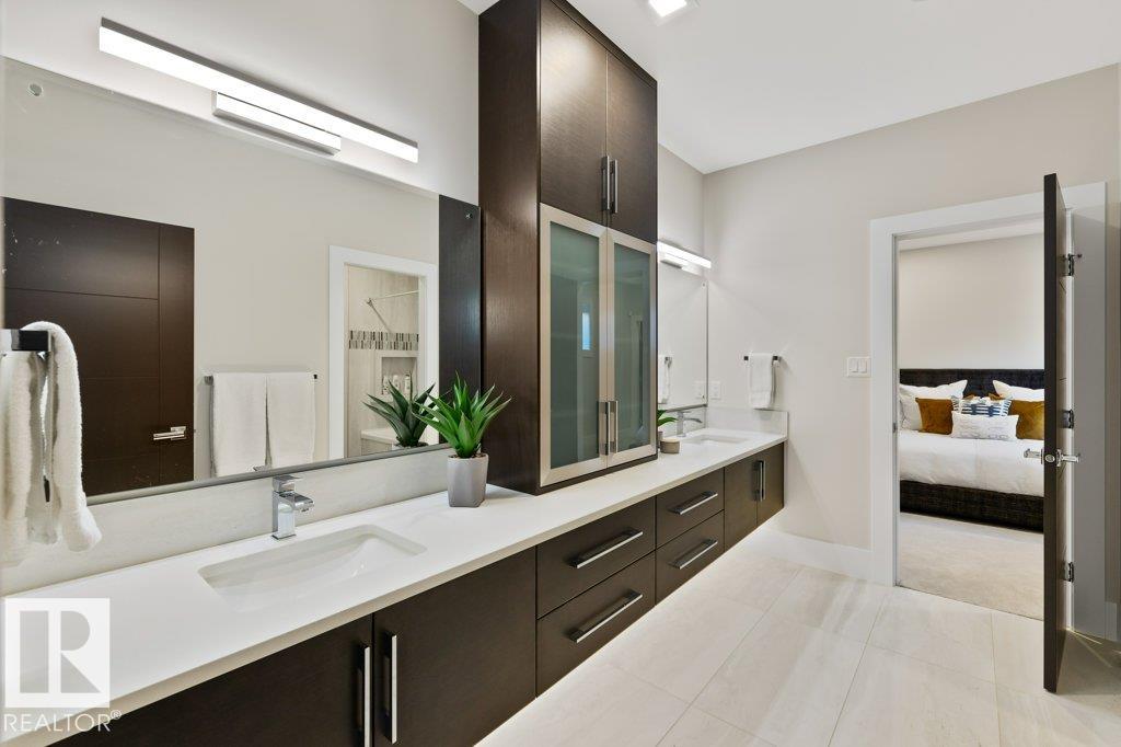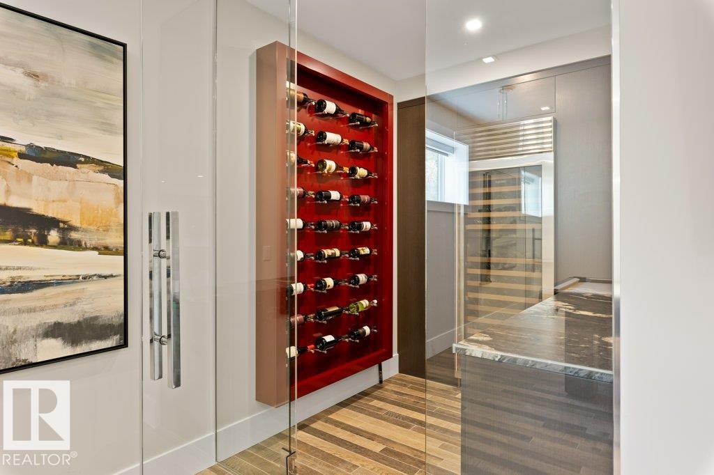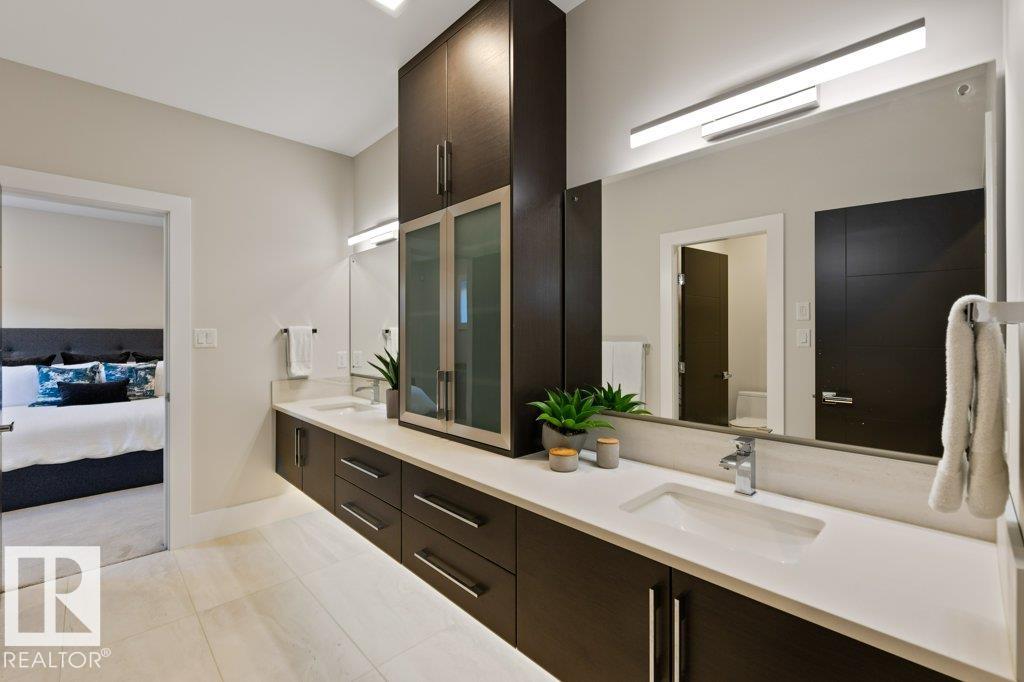 BREATHTAKING SHOWHOME in River's Gate - Sturgeon County's Only Gated Estate Community! This stunning great-room bungalow by Henderson Quality Building offers over 5000 SQFT of luxurious living space with a barrier-free layout & a 1600 SQFT 6-car garage with RV entrance. Features include custom millwork throughout, sun-drenched great room with stunning floor to ceiling feature fireplace, chef inspired kitchen with double quartz islands, floor-to-ceiling built-ins, Wolf & Sub-Zero appliances, & a butler's pantry. Includes 5 bedrooms: a resort-style primary suite with 2-sided fireplace & SPA INSPIRED EN-SUITE , main floor guest room with en-suite, lower bedrooms with Jack & Jill bathroom. Basement boasts glass stairwell, theater room with 12-ft screen, tiered seating, wet bars, games room, & more. Outside features $200K in serenity landscaping package, covered BBQ center, EV charger, motorized blinds, smart home automation, & 9-camera security. Unmatched quality, design, and elegance! In a word SPECTACULAR