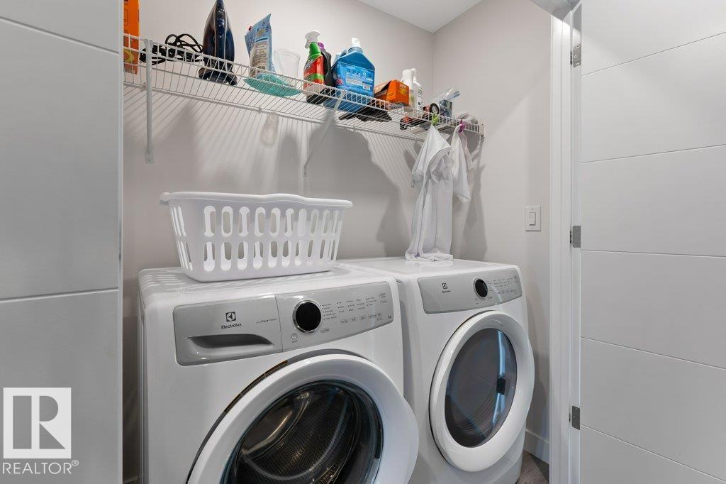 Welcome to this upgraded 1,670 sq ft half duplex in the sought after community of Riverside, offering great access to river valley trails, Anthony Henday, downtown & nearby schools. The bright main floor features an open concept layout with an island kitchen overlooking the spacious living room, ideal for entertaining or daily living. This level includes a 2 pce bath, electric blinds, air conditioning & direct access to the finished double attached garage w/epoxy flooring & painted walls. Upstairs, the primary suite features a custom-designed walk-in closet w/barn door detail & a private ensuite highlighted by upgraded swivel faucets. Two additional bedrooms, 4 pce bathroom & upper floor laundry complete this level. The finished basement, completed by the builder in 2023, offers a rec room, 3 pce bathroom, storage & a sound insulated space under the stairs. Outside, enjoy landscaped gardens, an interlocking brick patio, an extended maintenance free deck & a custom mural enhancing the outdoor living space.